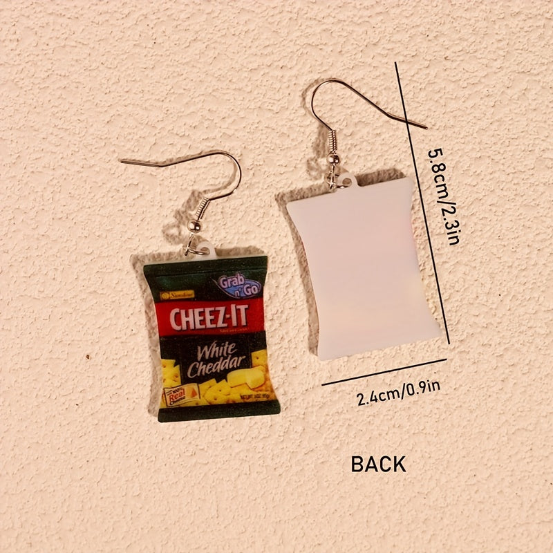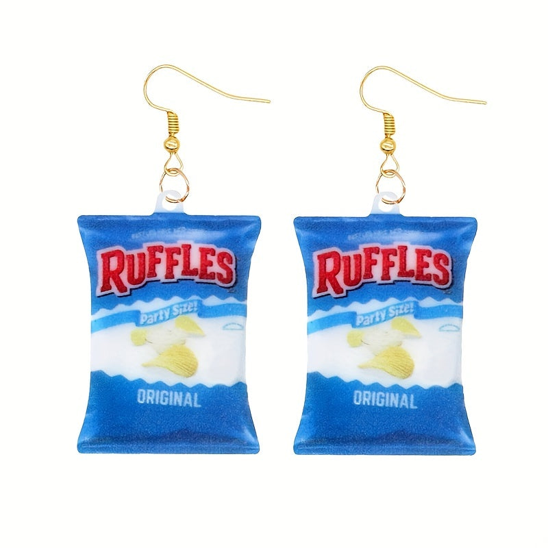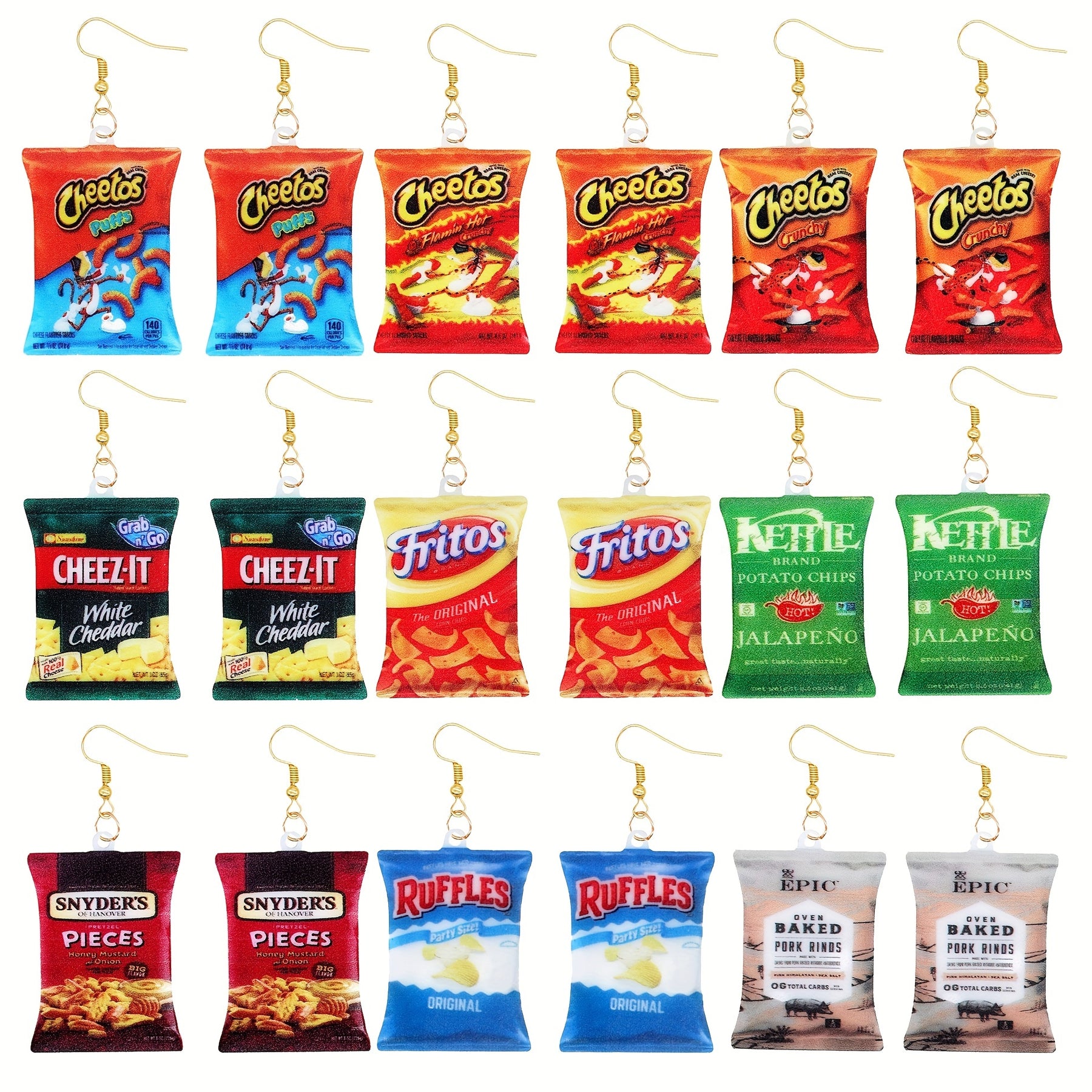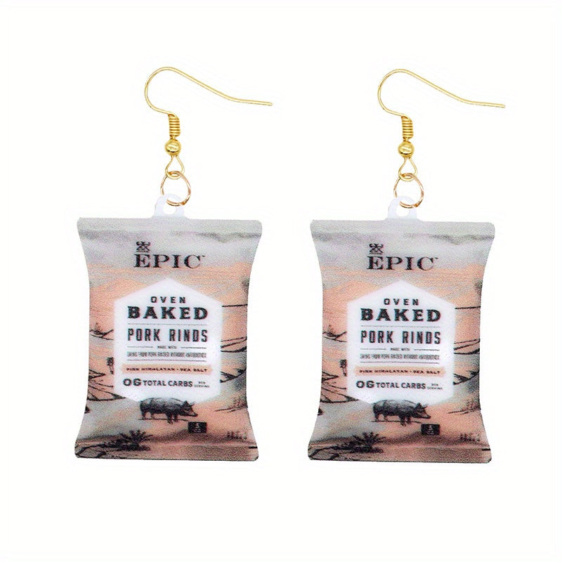 These snack chip bag dangle earrings are a fun and unique accessory for daily casual wear. Made of acrylic material, they make a great gift for someone with a playful personality.