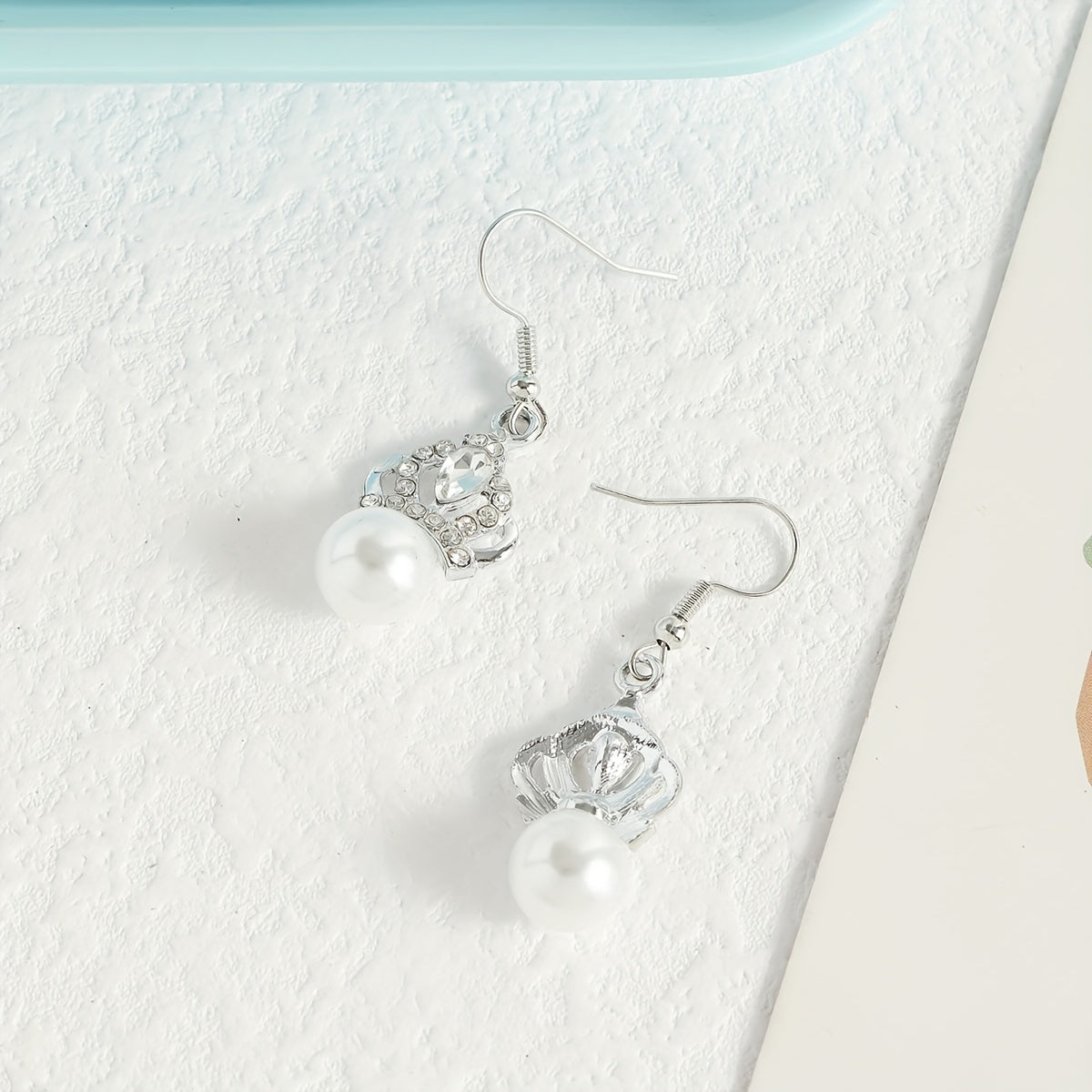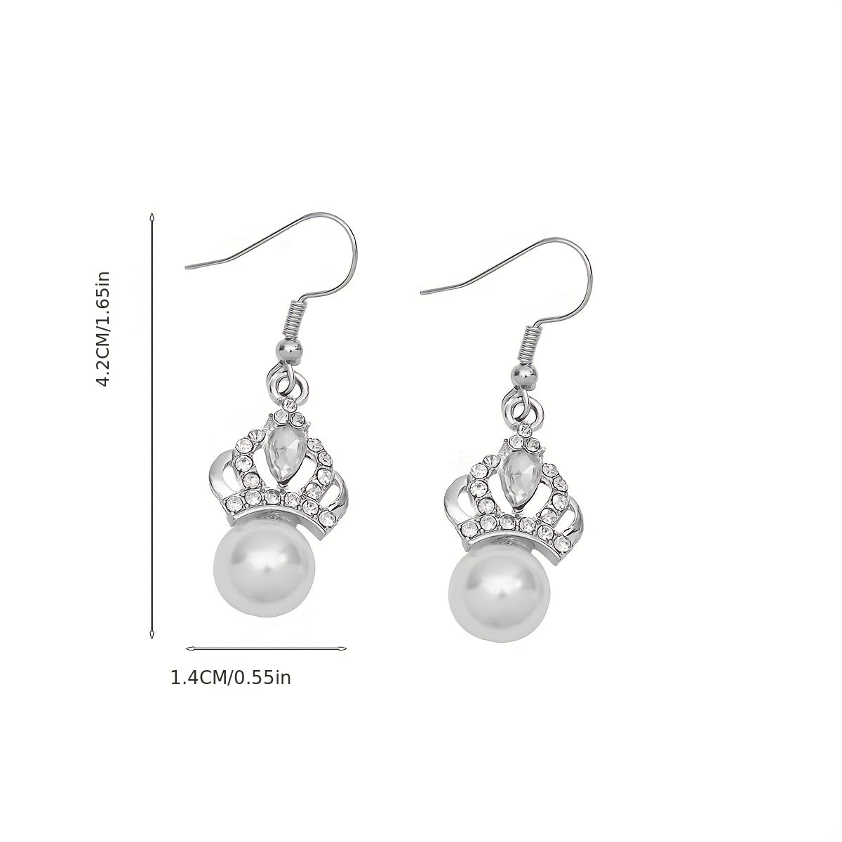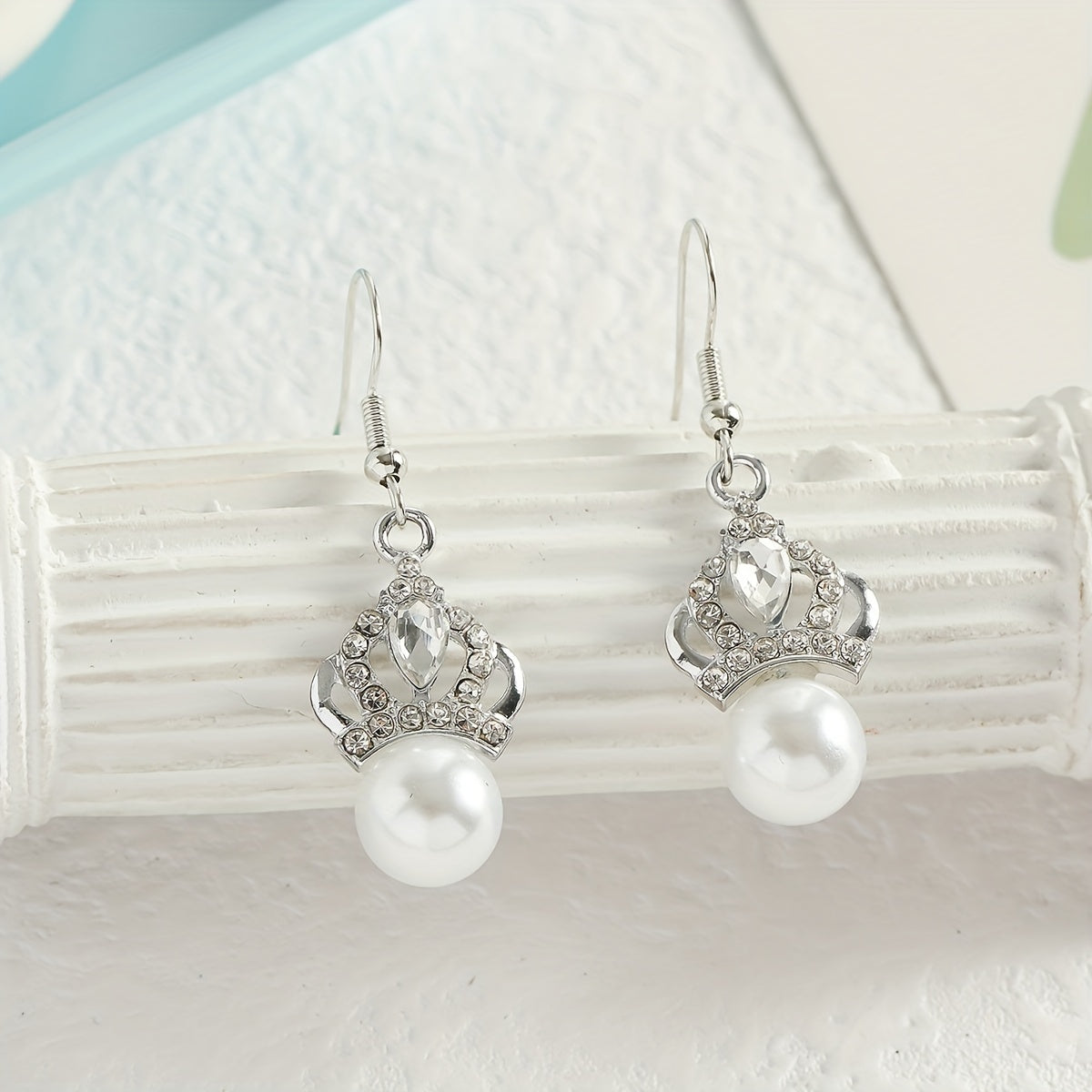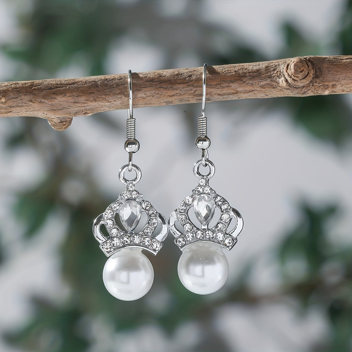 Elegant dangle earrings with sparkling rhinestone crown and faux pearl decoration, made of zinc alloy. Perfect gift for women.