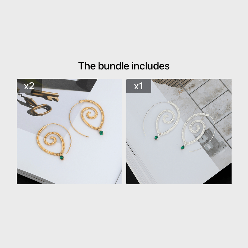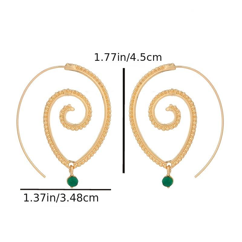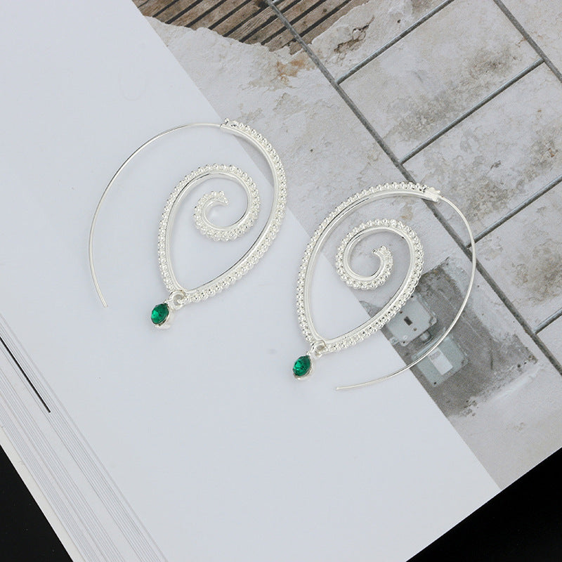 These personality round spiral earrings feature an exaggerated swirl design with green zircon accents, making them a bold and unique ear jewelry choice for women.