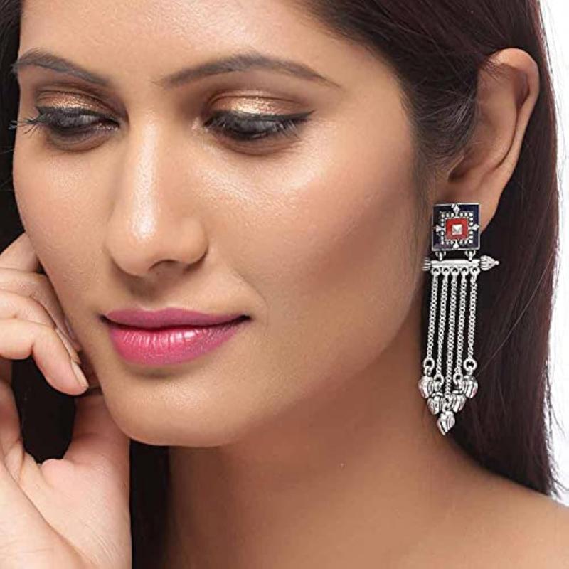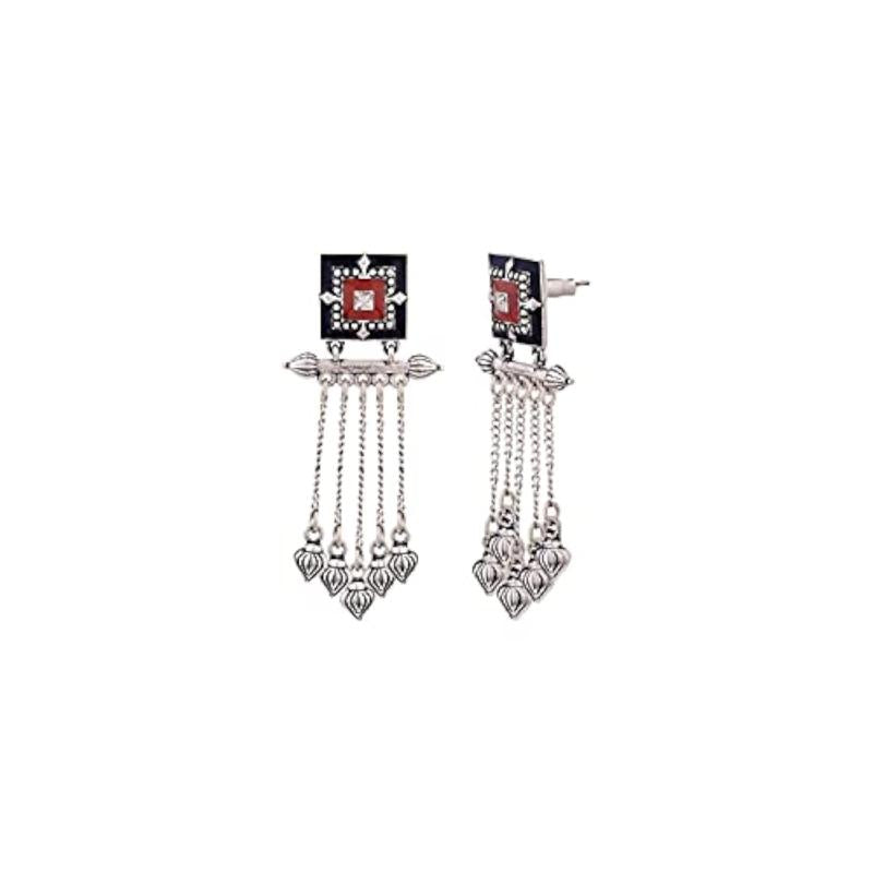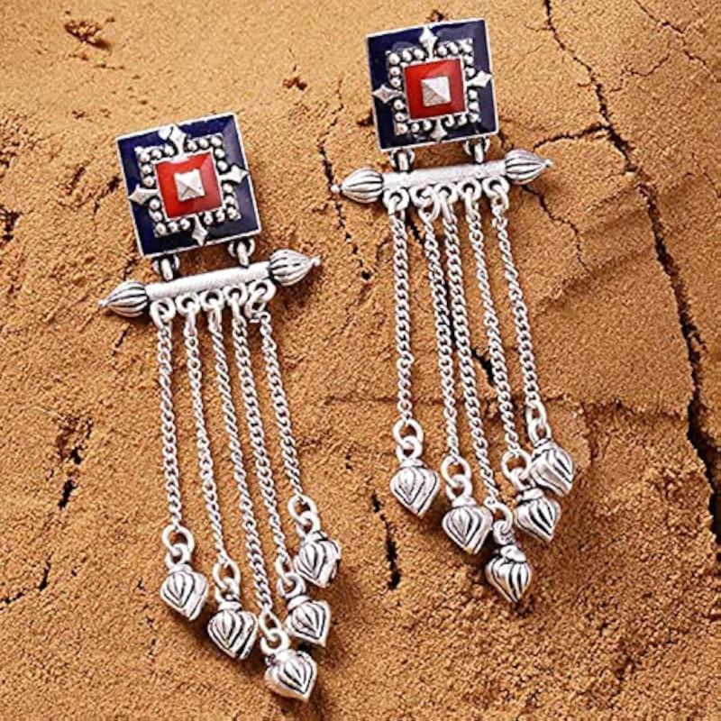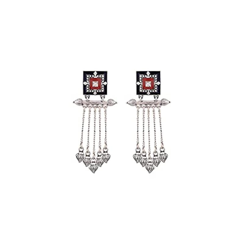 These brass silver oxidised earrings feature a square mandala rangoli design. They are perfect for adding a touch of traditional flair to your outfit.