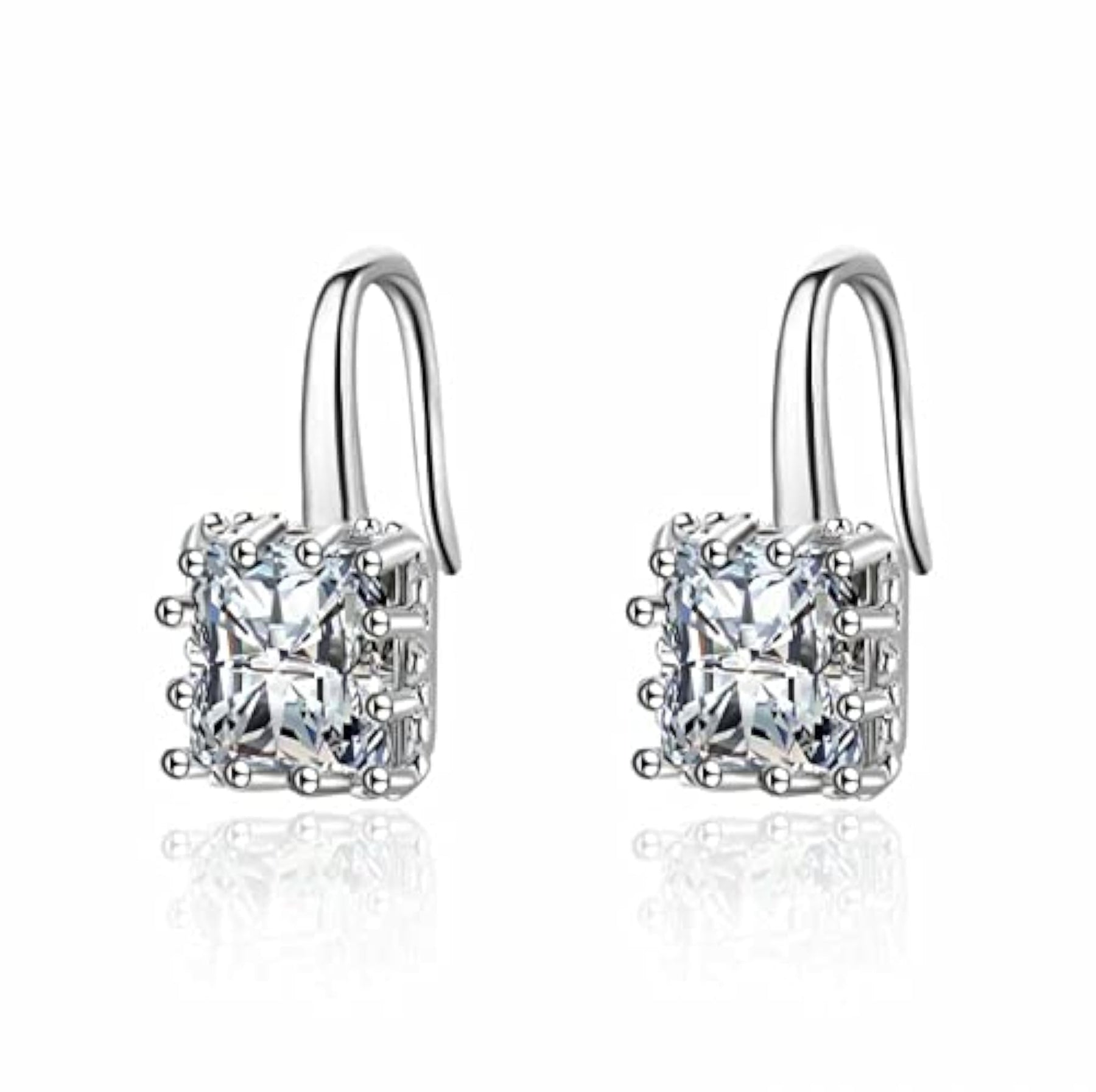 Plated square stone drop hook earrings for girls. Features princess cut stud Moissanite. Perfect accessory for any outfit.