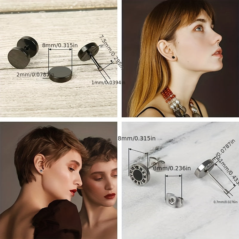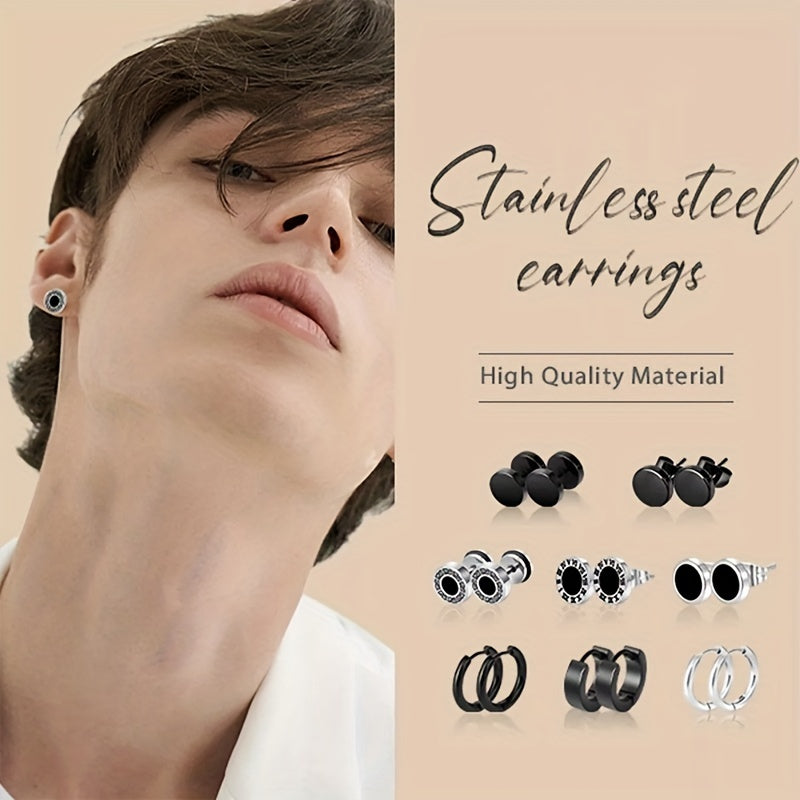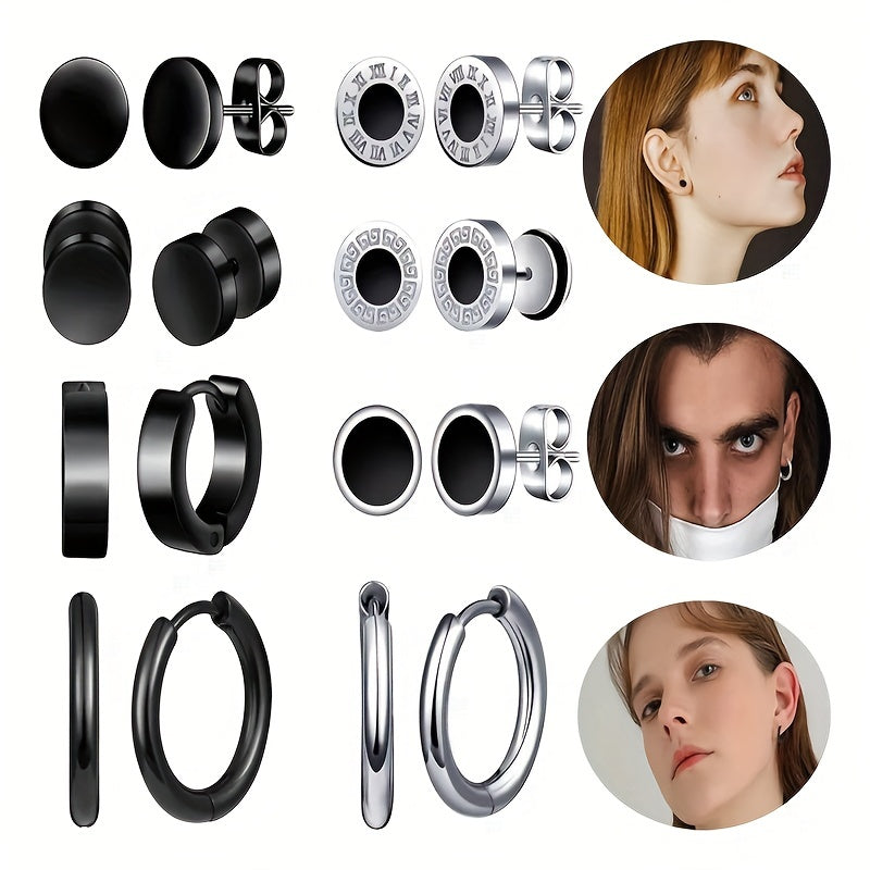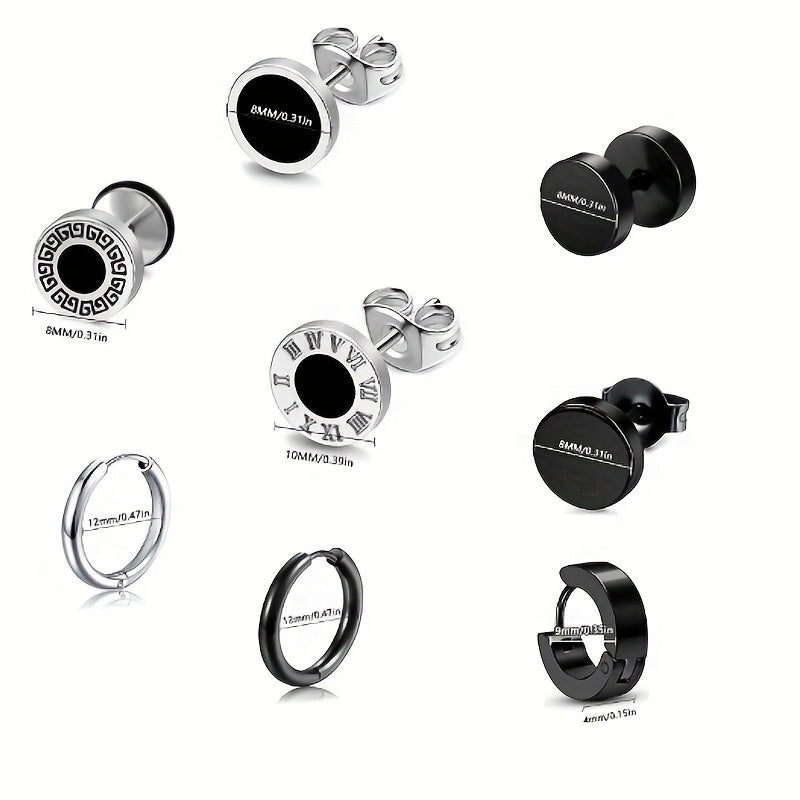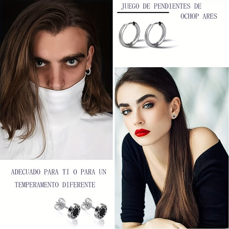 This set includes 8 pairs of stylish stainless steel earrings, featuring coil and dumbbell designs. Perfect for couples or individuals looking for a unique earring set.