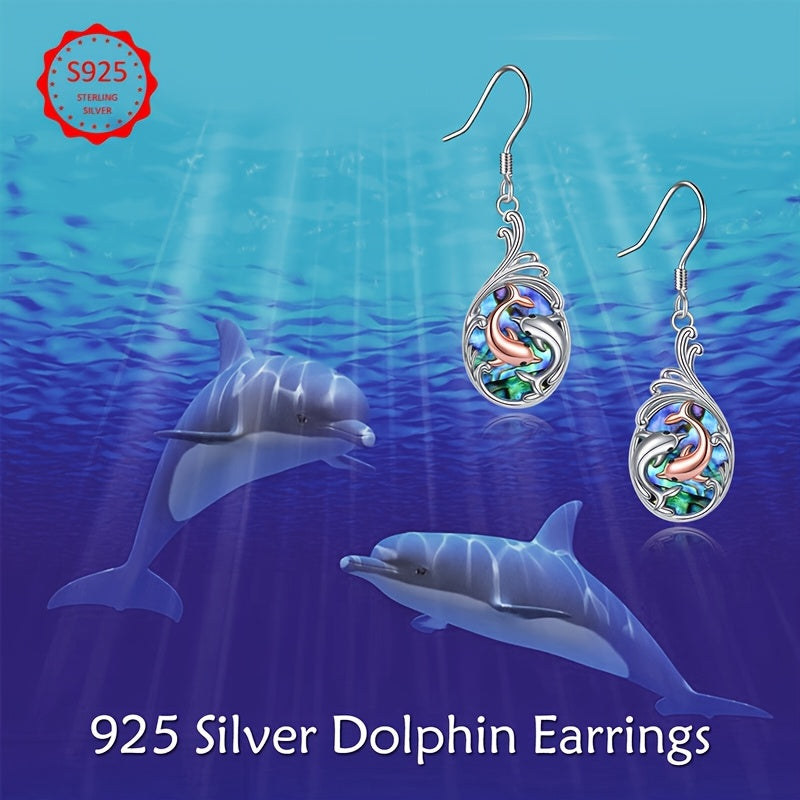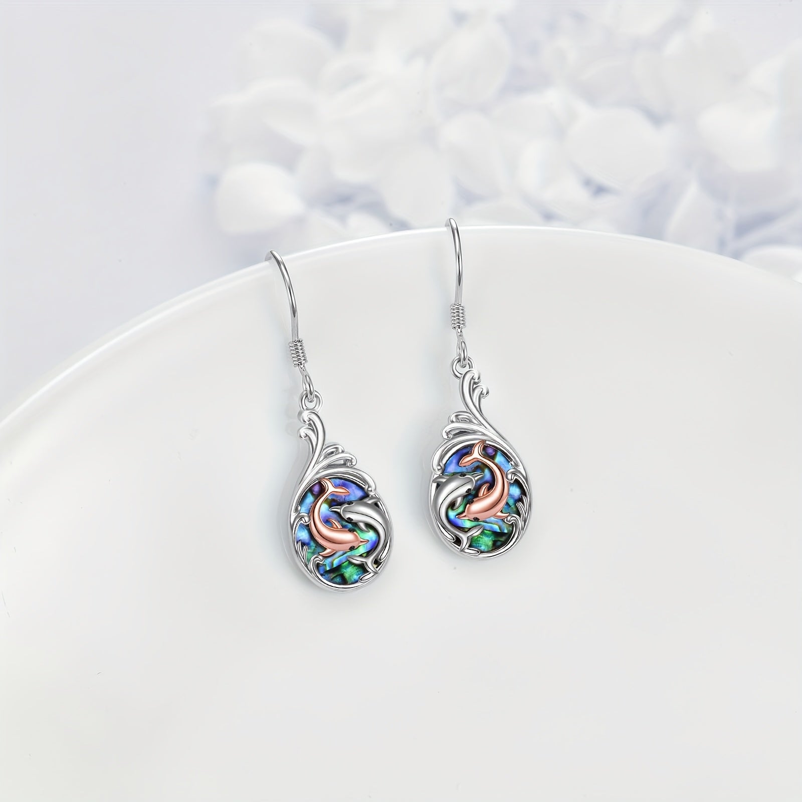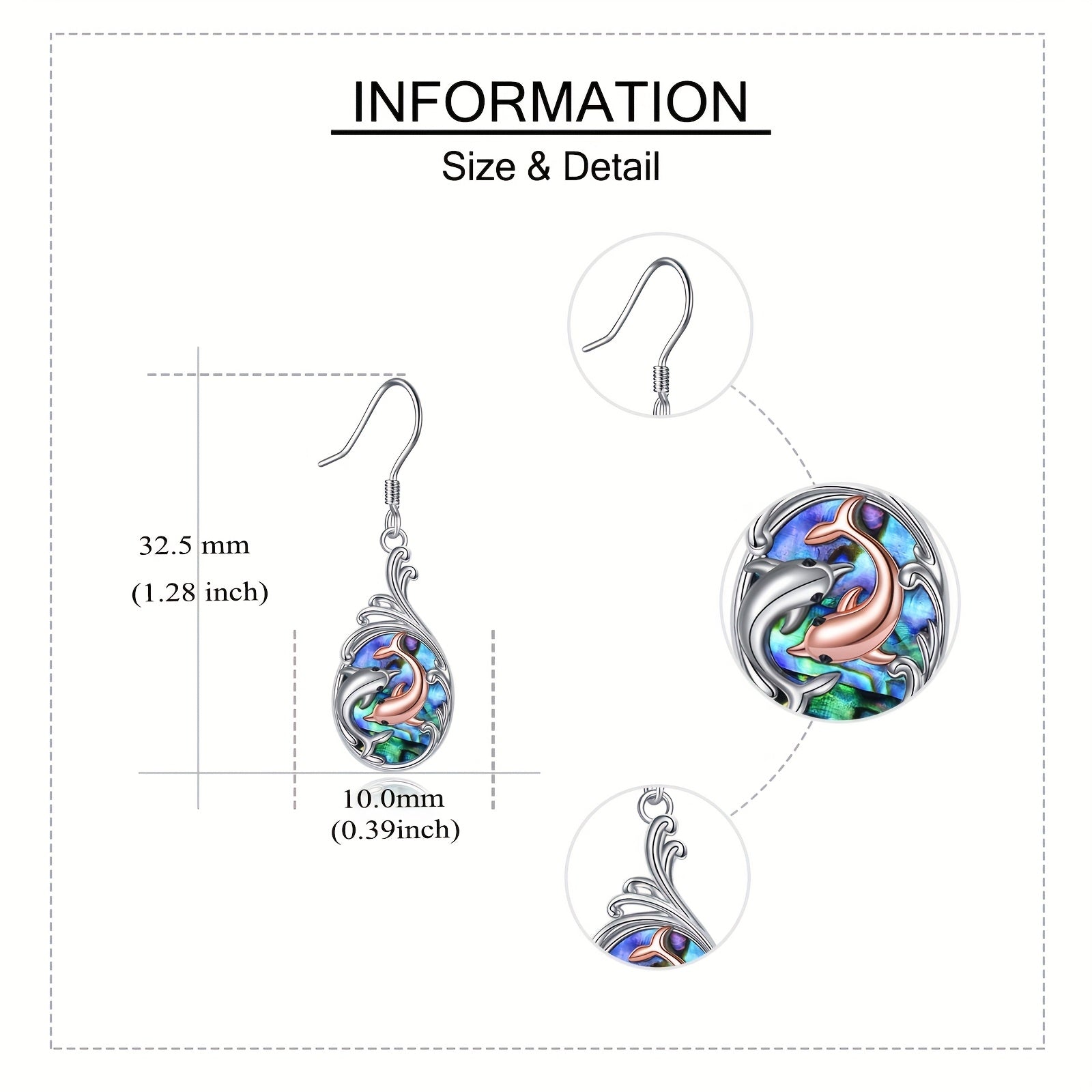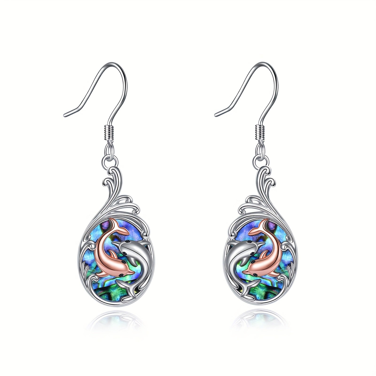 These dolphin earrings are crafted in sterling silver with abalone shell, creating a stunning dangle drop design. Ideal gift for women, daughters or dolphin lovers.