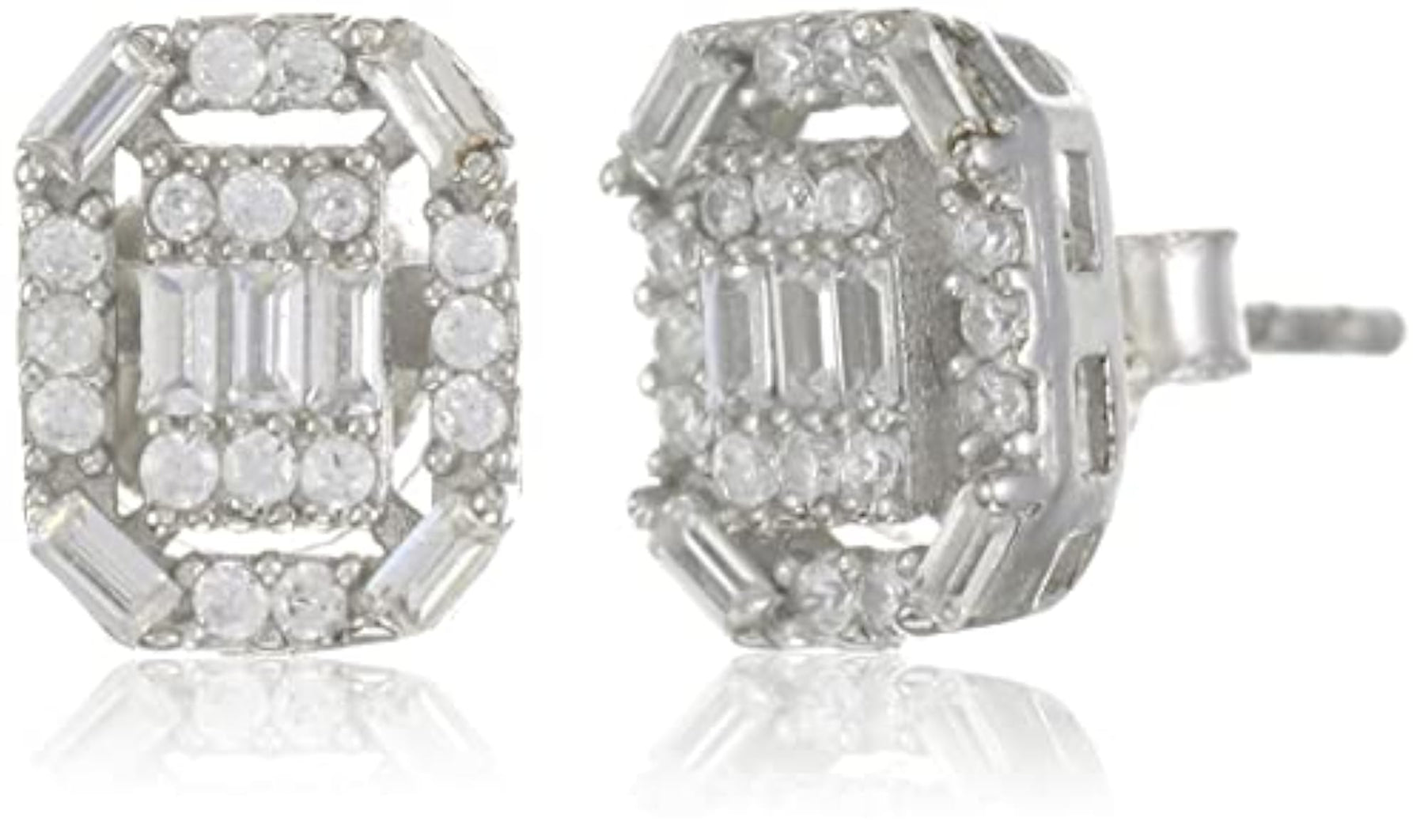 These stunning earrings feature an illusion baguette design in a rectangle halo shape. Made of high-quality 92.5 sterling silver with a rhodium plating for a polished finish.
