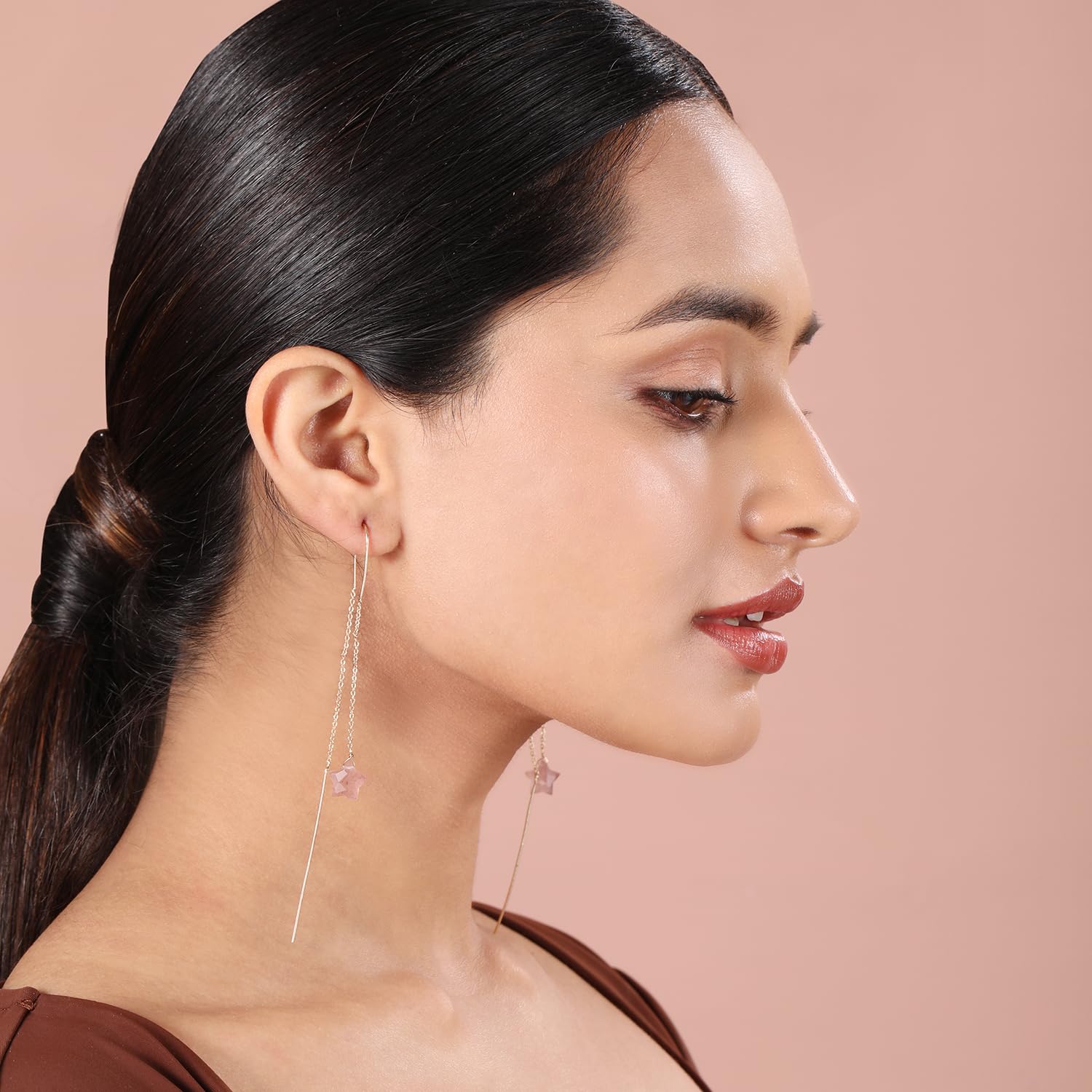 Chic and light weight earrings featuring rose quartz semi precious stones. Anti-tarnish finish for long-lasting shine.