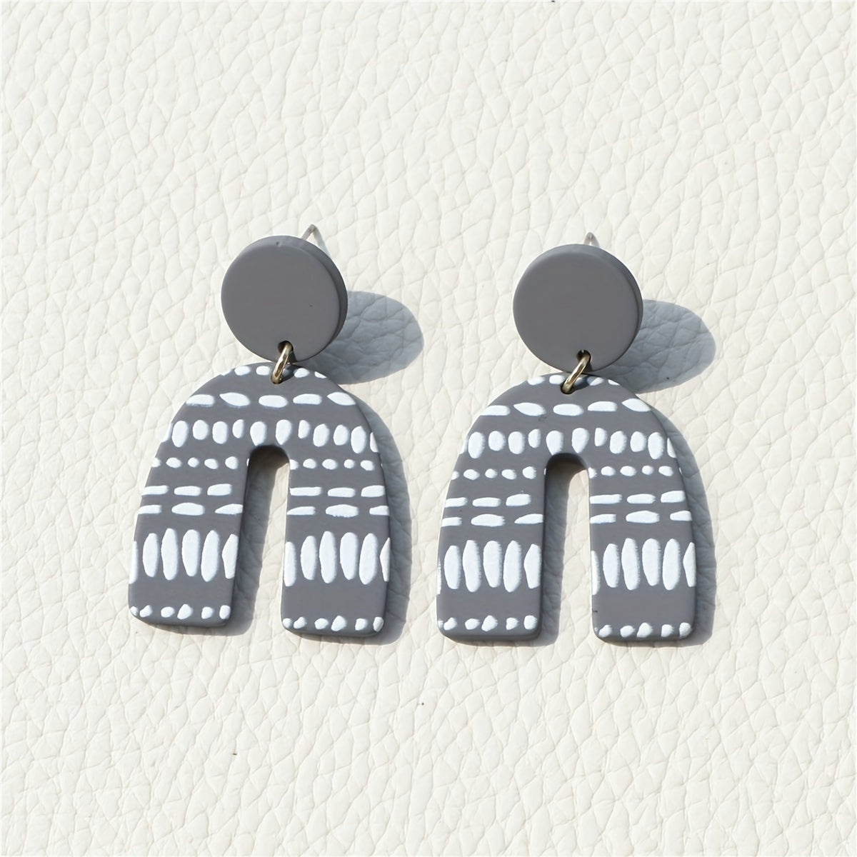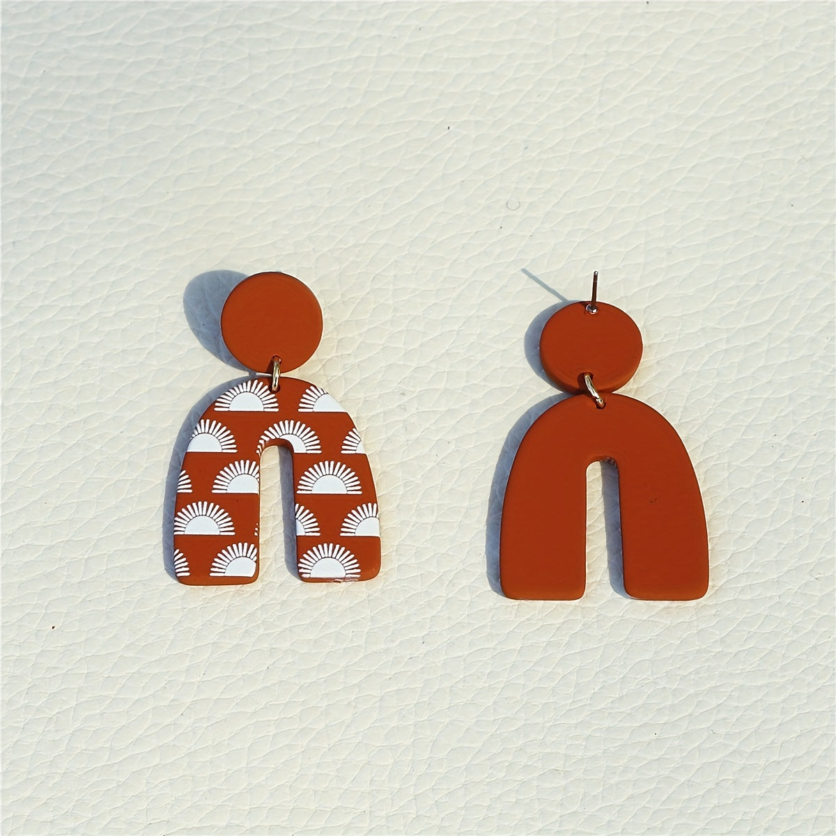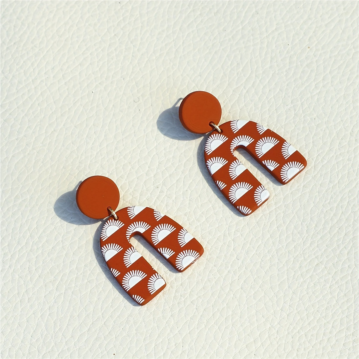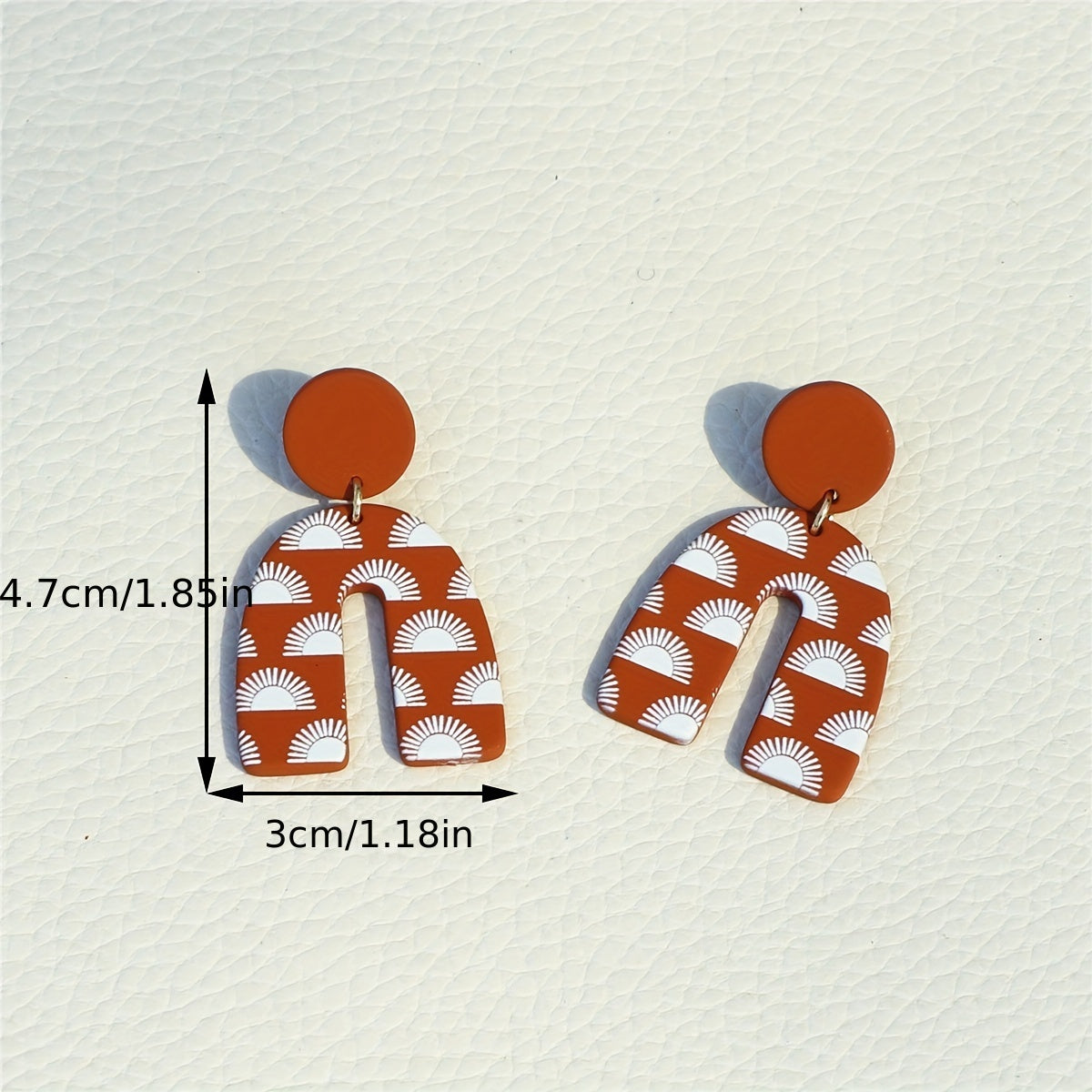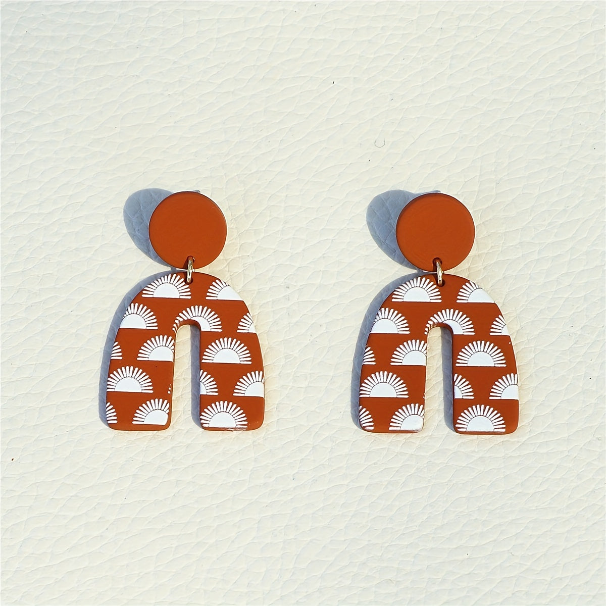 These U-shaped orange earrings feature a sun pattern design, making them a delicate and stylish accessory. They are perfect as a gift for any female who appreciates unique jewelry.