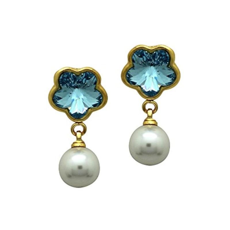 Elevate your style with these stunning blue Swarovski crystal earrings featuring a floral design with pearl accents. Perfect for Valentine's Day!
