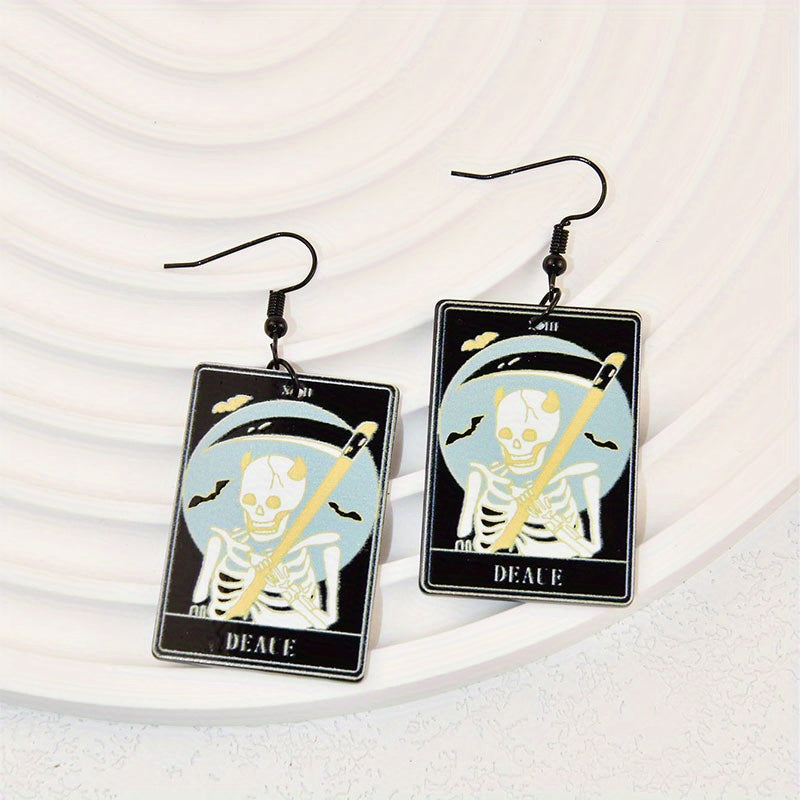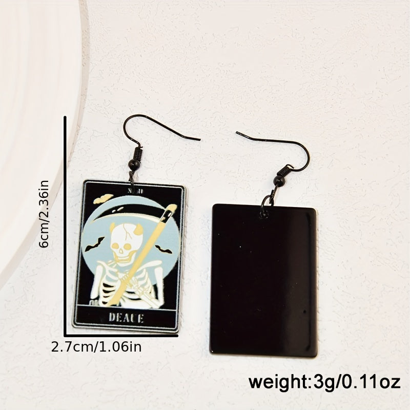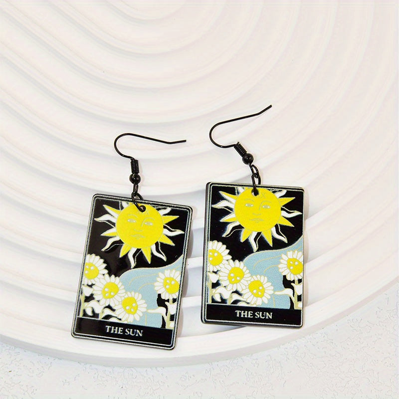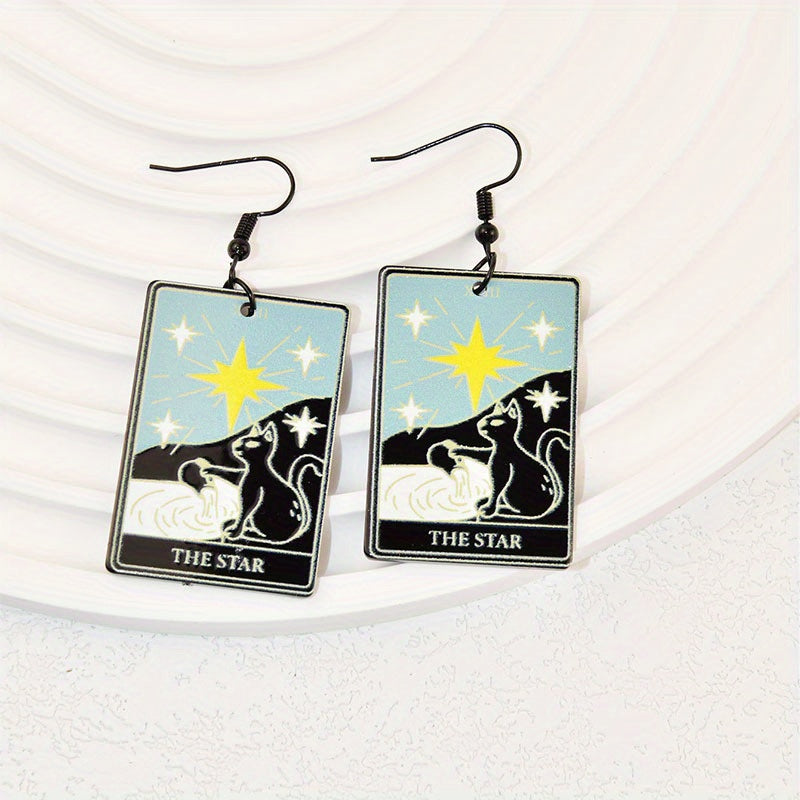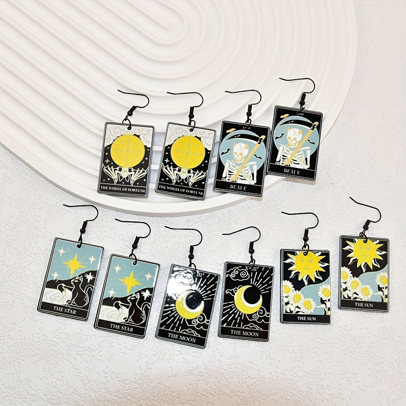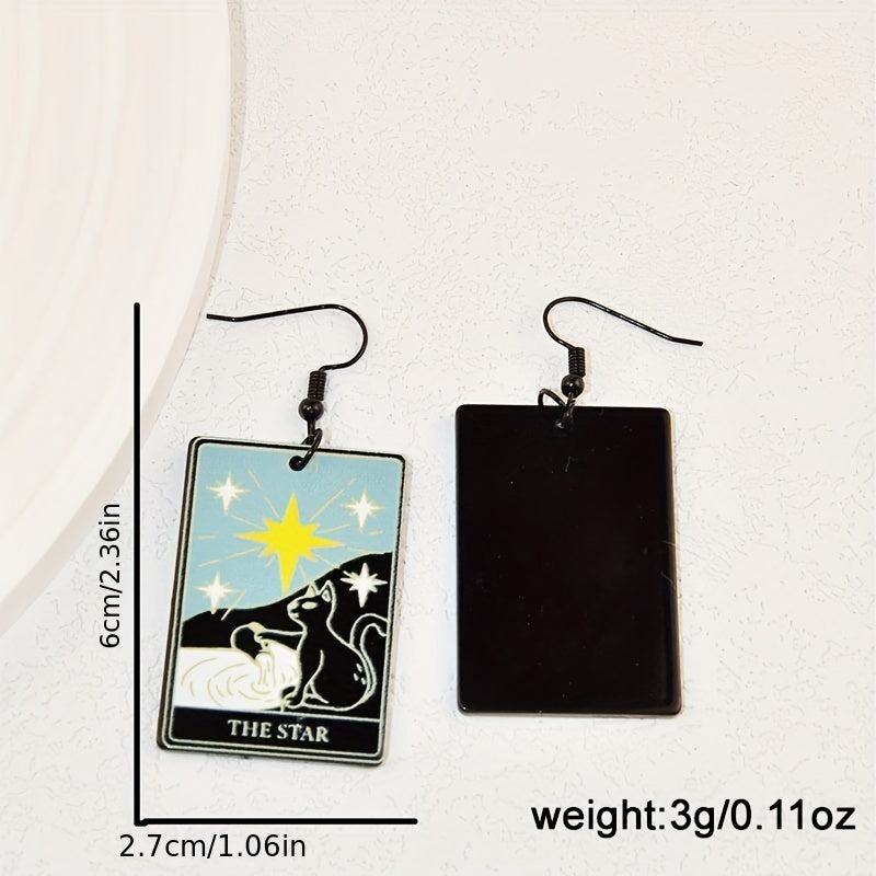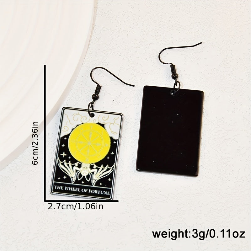 These dangle earrings feature Tarot cards design in a Japanese hip hop style. They are made of high-quality acrylic material, making them a unique and trendy accessory. Perfect gift for women who love Tarot and stylish jewelry.