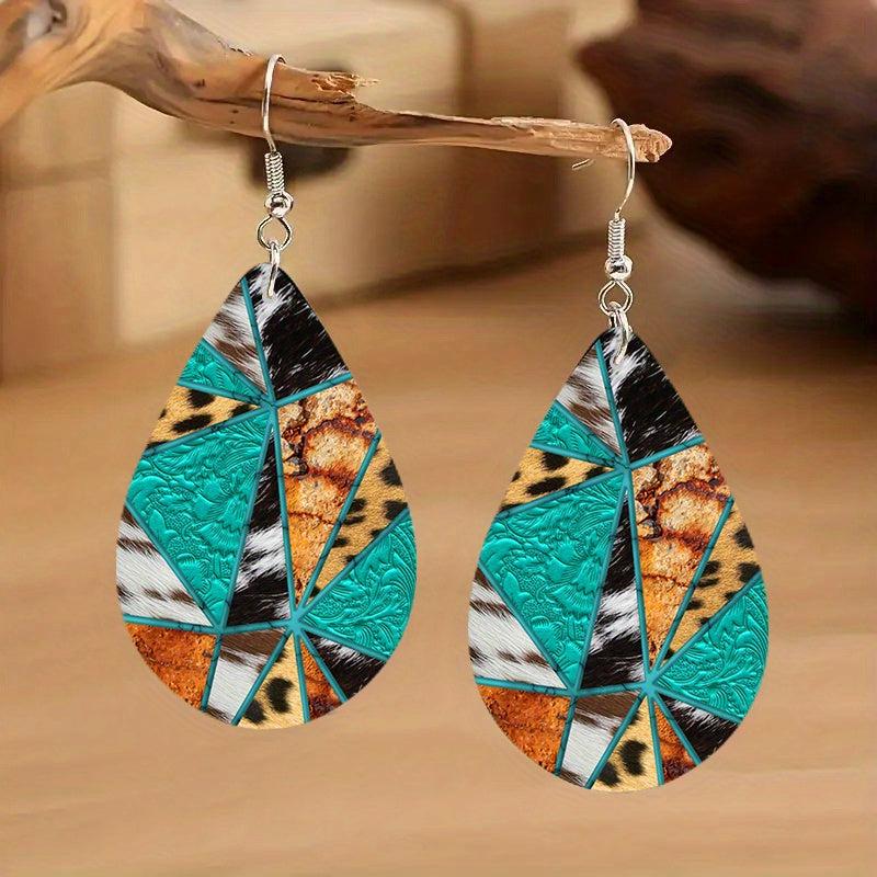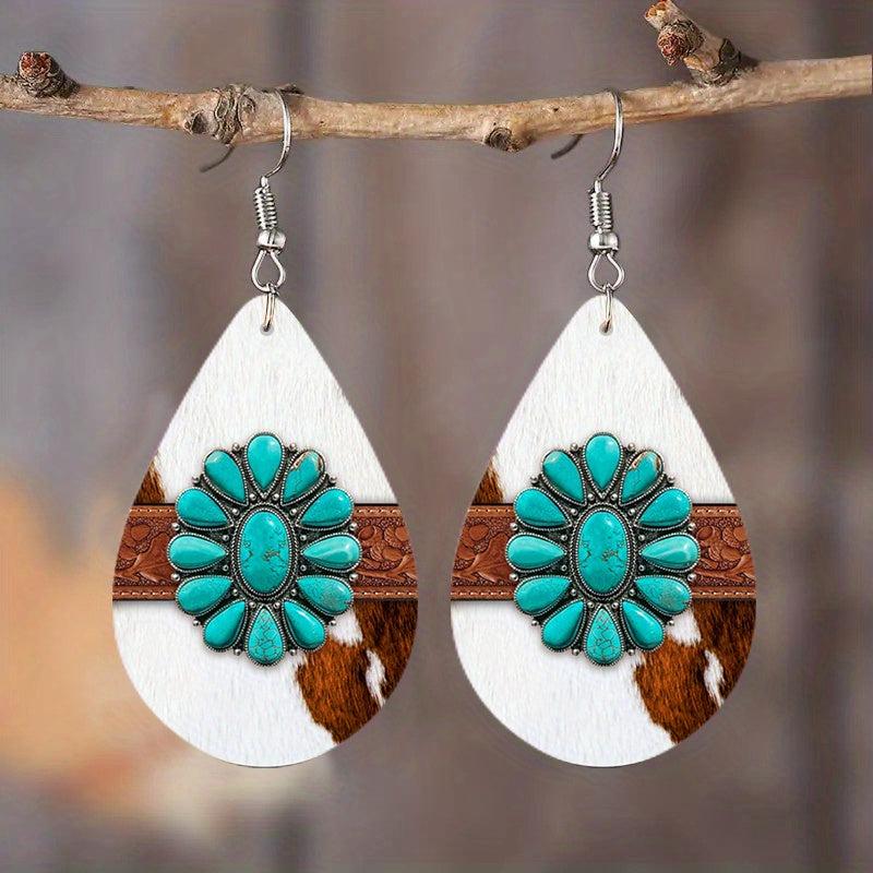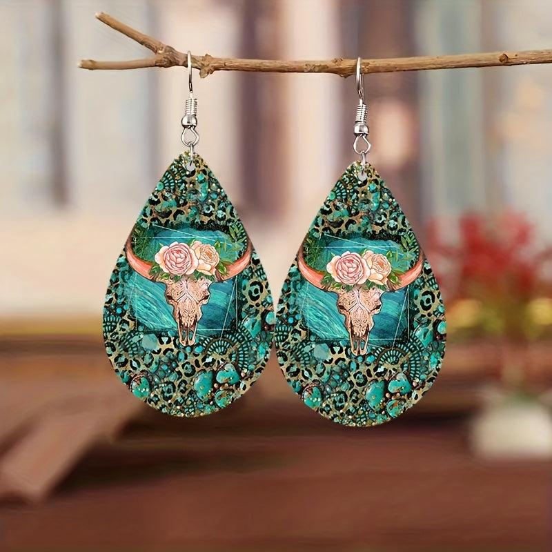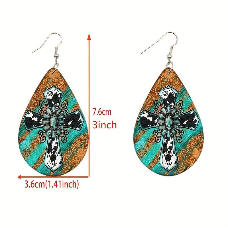 Add a touch of vintage charm with these wooden earrings featuring a teardrop shape and cross and flower pattern.