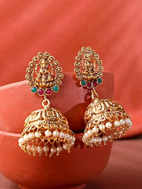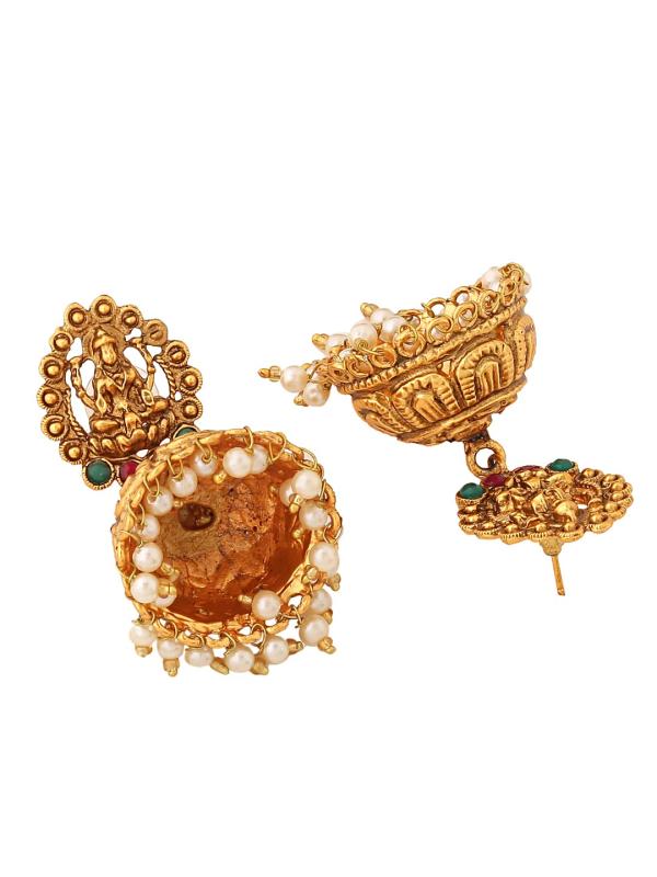 Exquisite dome-shaped jhumka earrings featuring plated pearls for an elegant look.