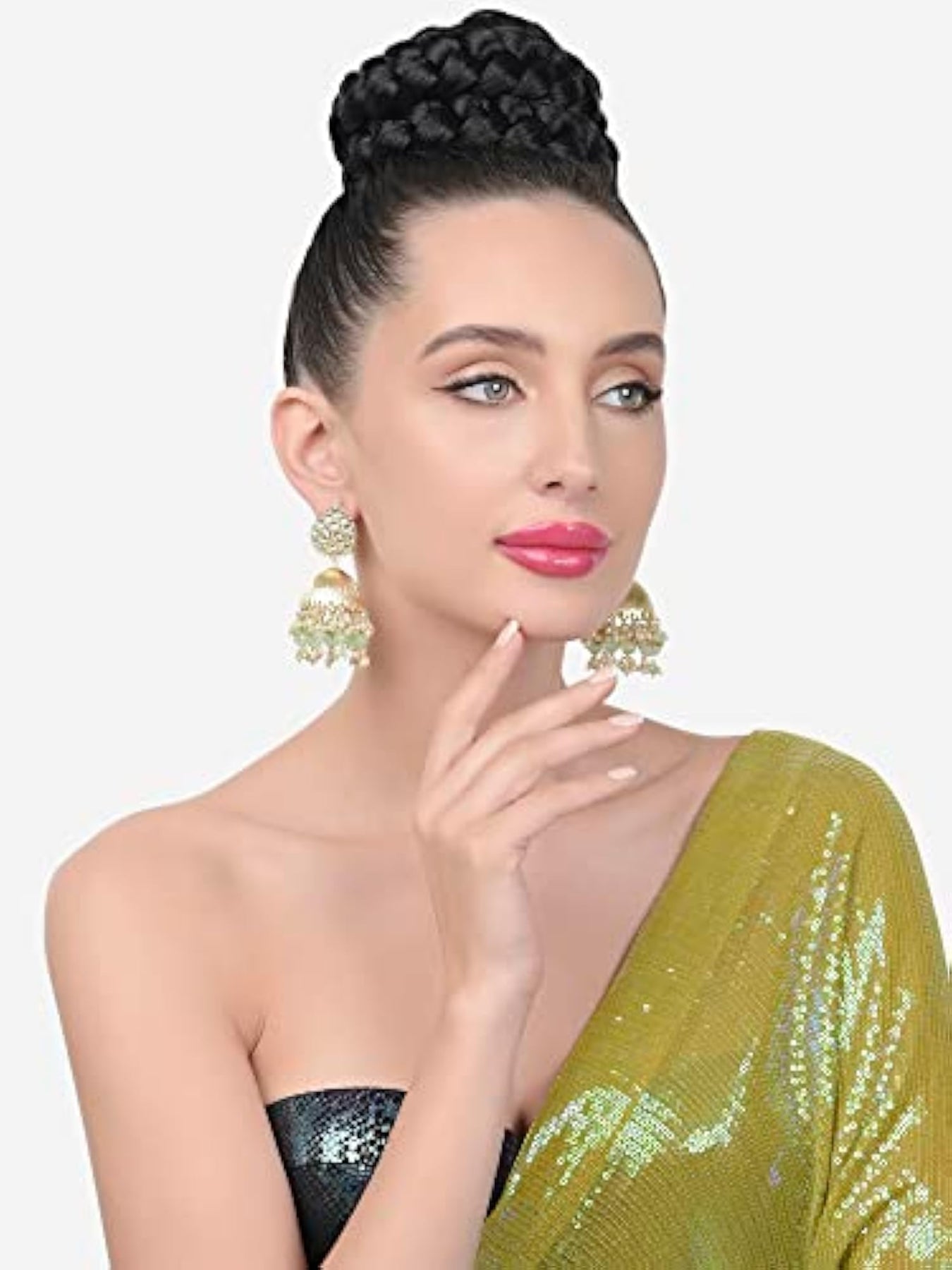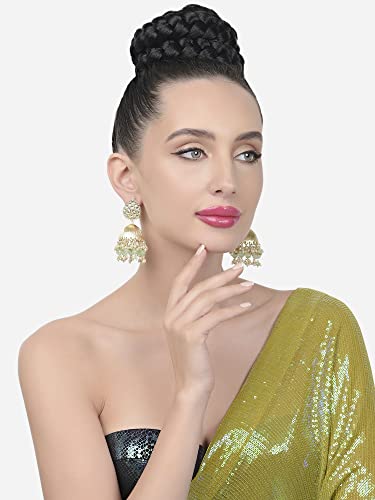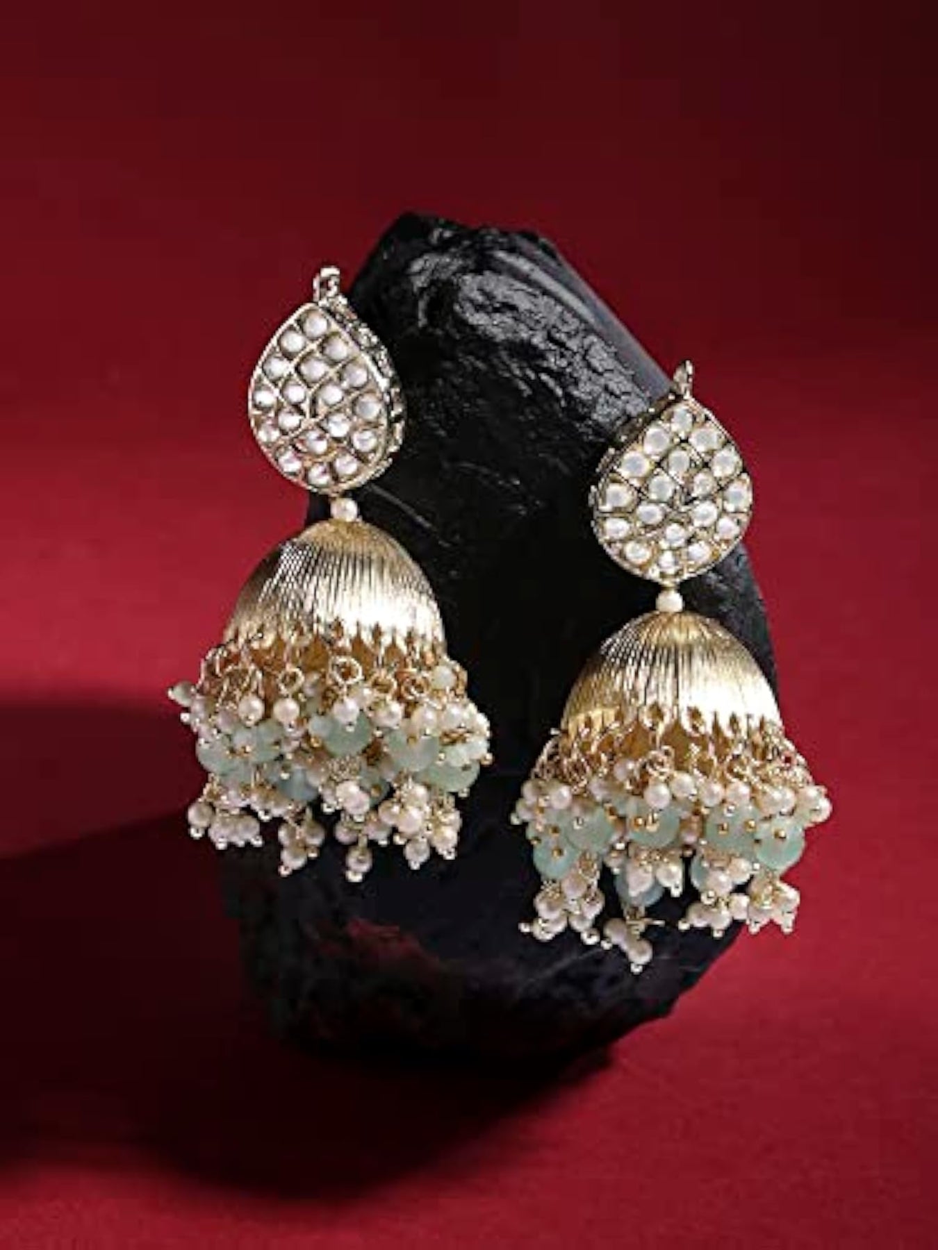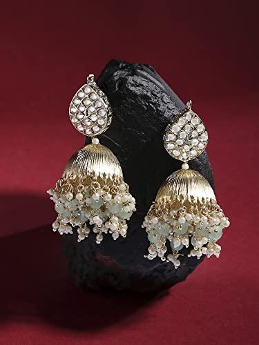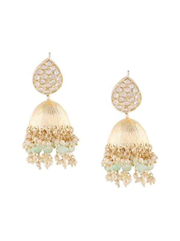 Elegant and traditional Kundan jhumki earrings designed with drop beads in a tilak shape. Perfect accessory for women.