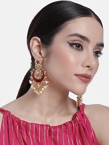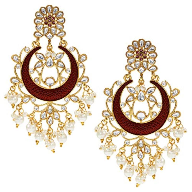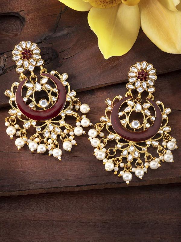 Elegant plated brass earrings with intricate Kundan and pearl detailing, perfect for traditional occasions.