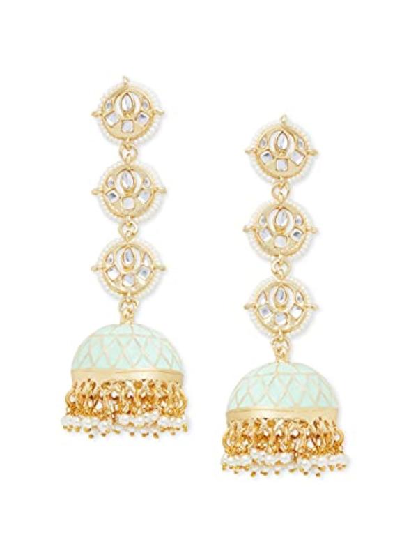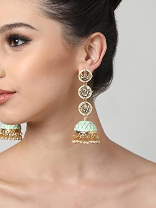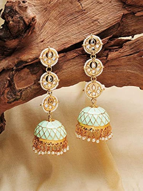 Add a touch of traditional elegance to your outfit with these beautiful Meenakari Kundan Jhumki Earrings. Perfect for special occasions or everyday wear.