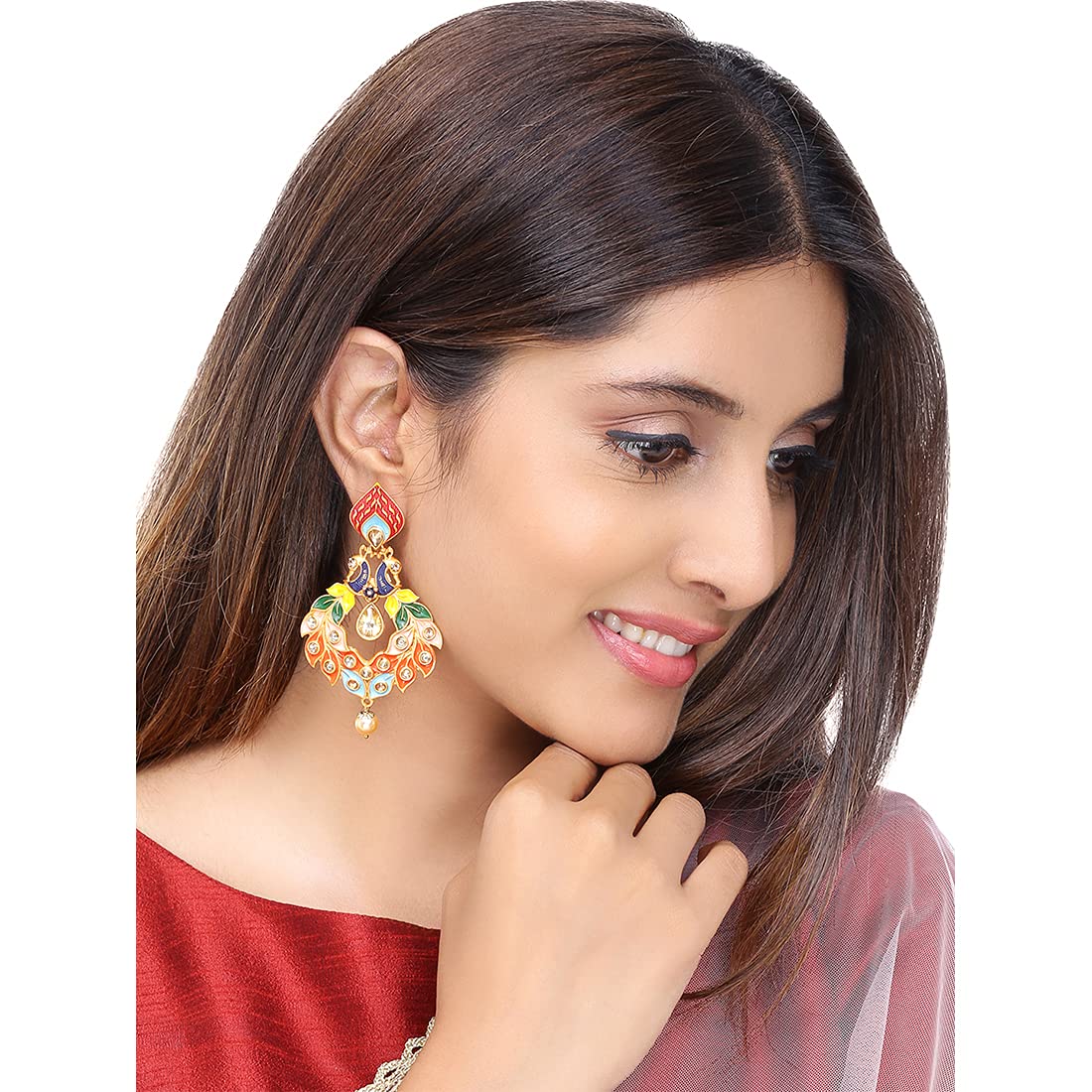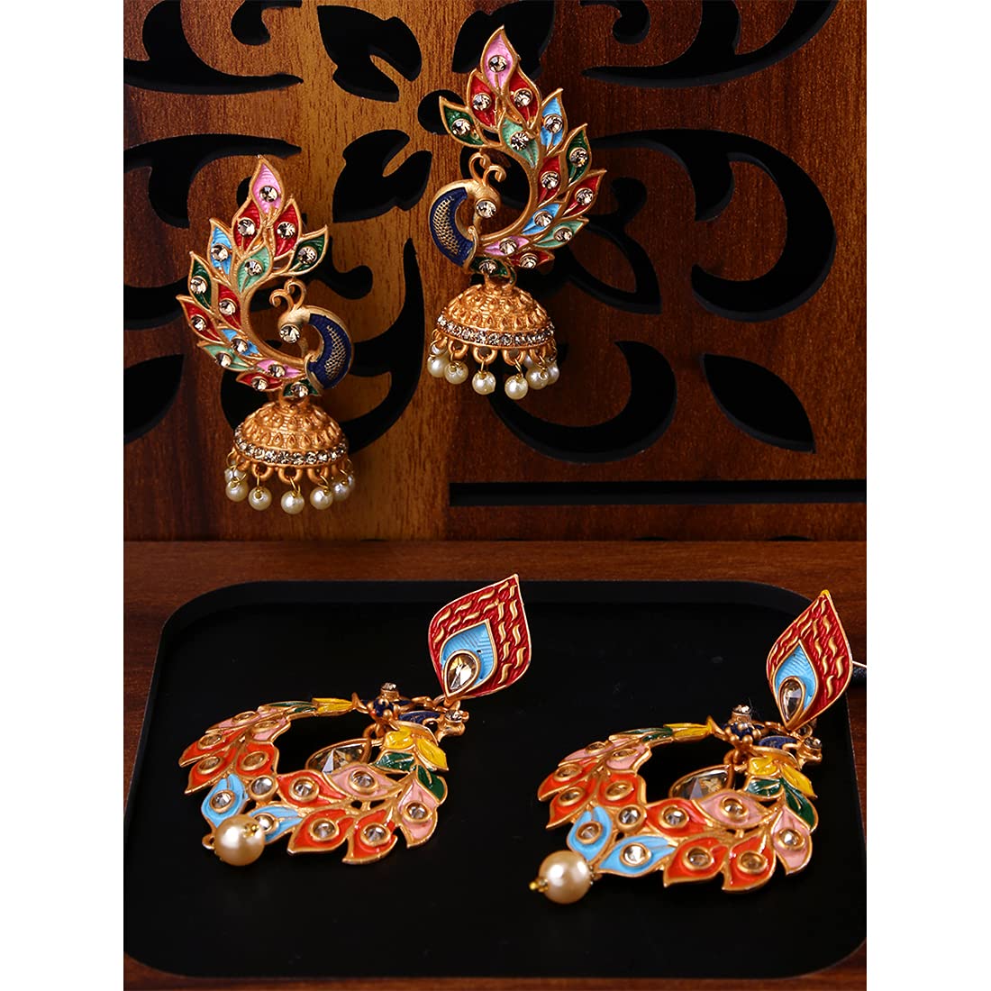 Enhance your ethnic look with this beautiful peacock-shaped jhumki earring set, plated with gold. The set includes earrings for different occasions.