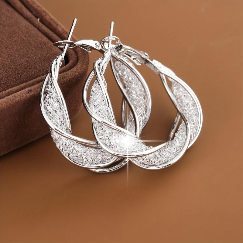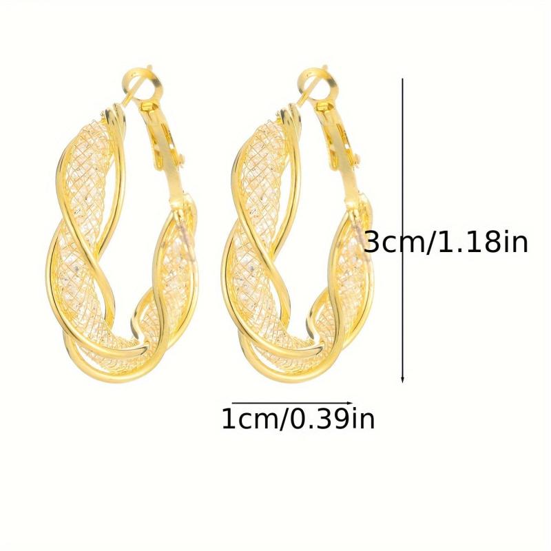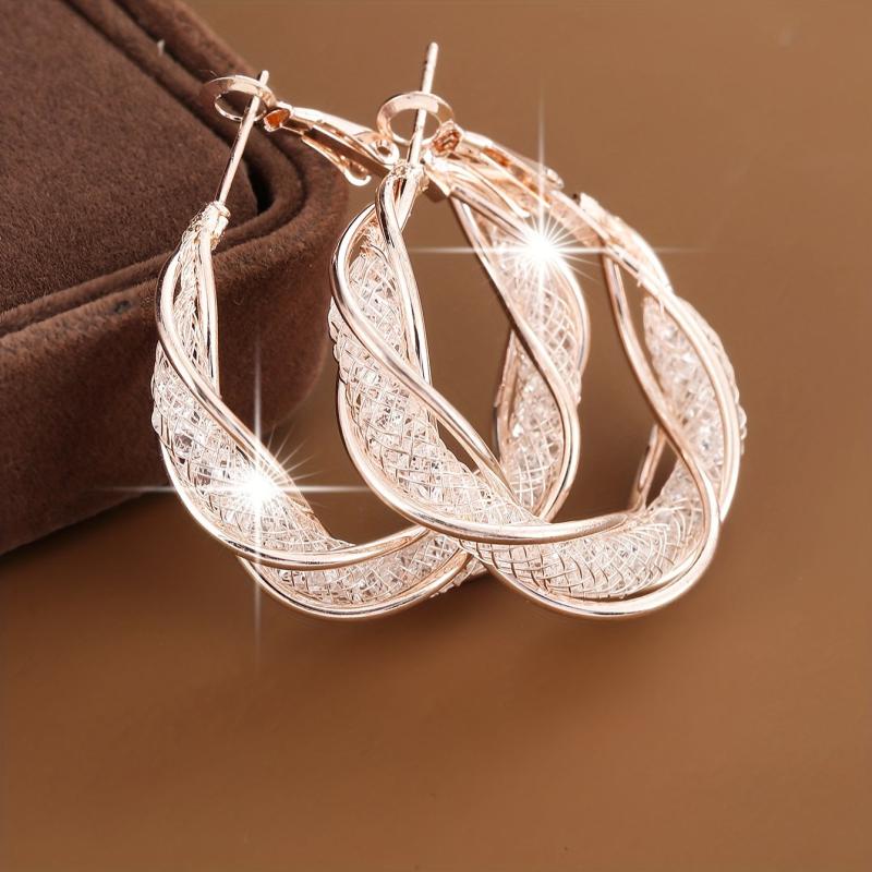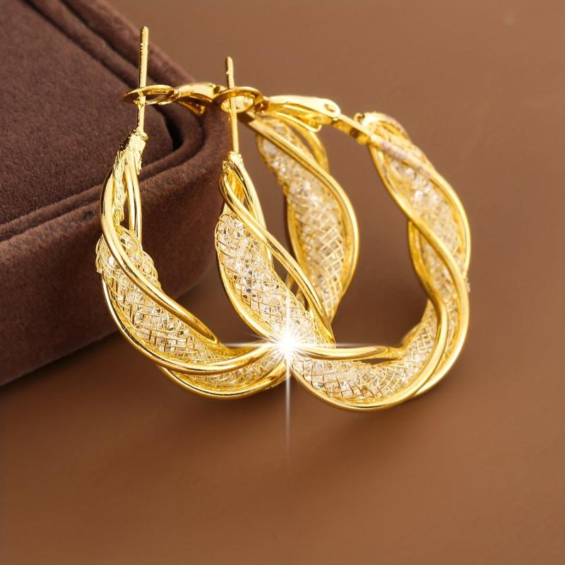 These stunning hoop earrings feature a twisted mesh design with sparkling zirconia inlaid within copper. The earrings are plated with 18K golden for a luxurious finish.