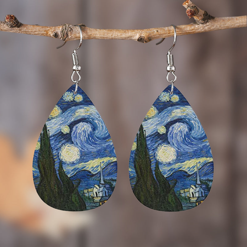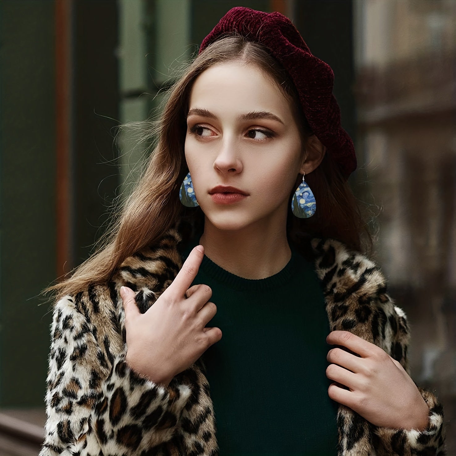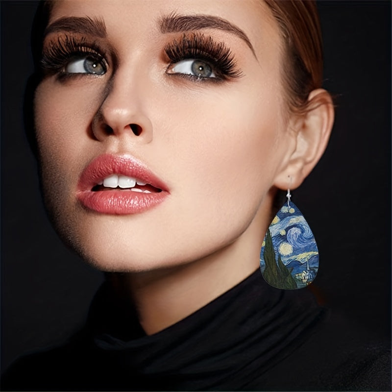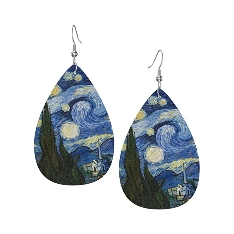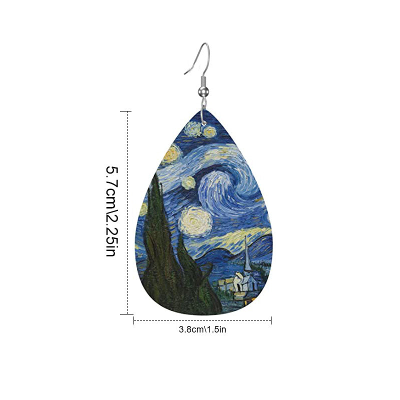 These stunning dangle earrings feature a design inspired by Van Gogh's Starry Sky painting. Made of high-quality PU leather, these earrings are a unique addition to any jewelry collection. Perfect gift for women and girls.