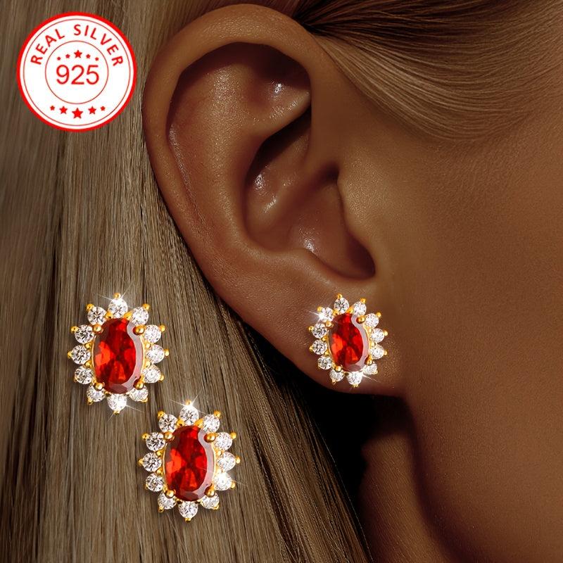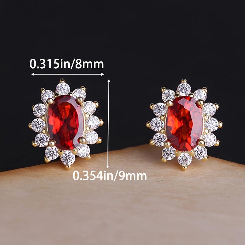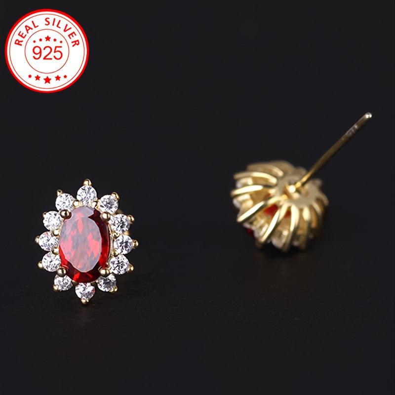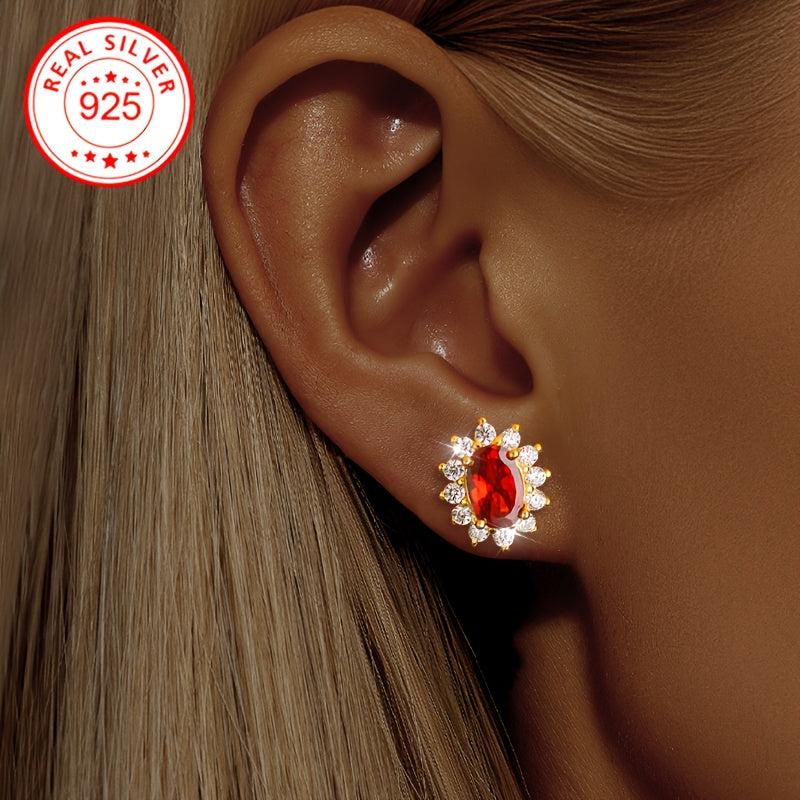 Beautiful vintage-style stud earrings crafted from 925 sterling silver featuring red synthetic cubic zirconia stones with pave setting. Perfect gift for weddings and special occasions.
