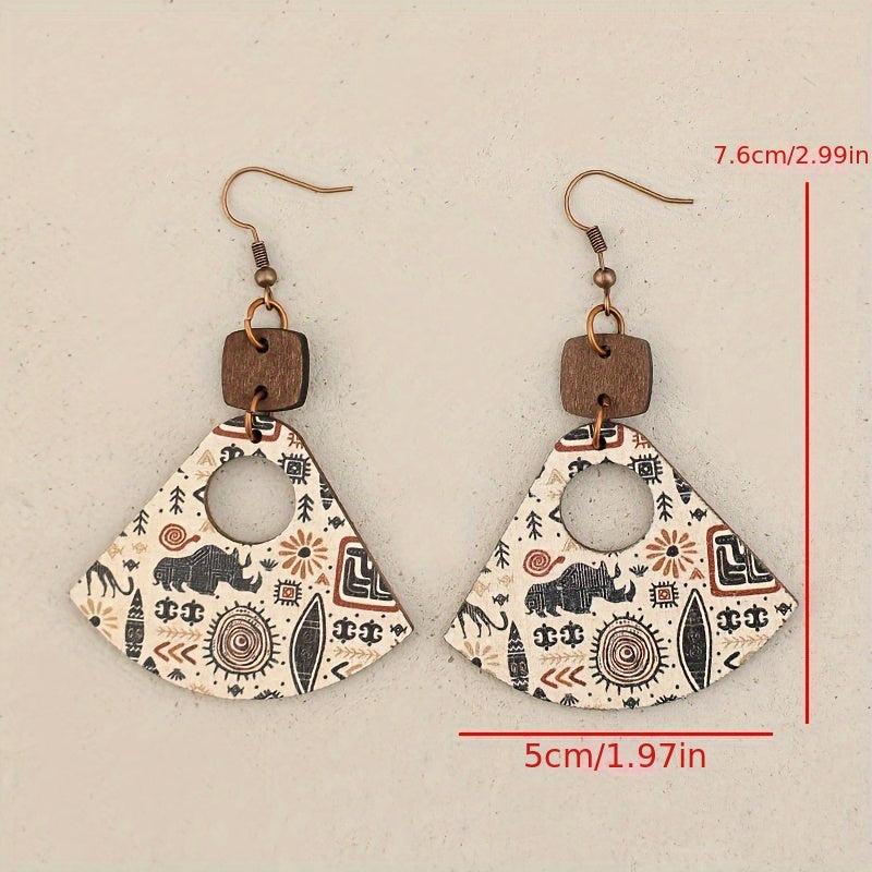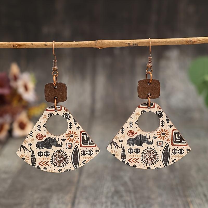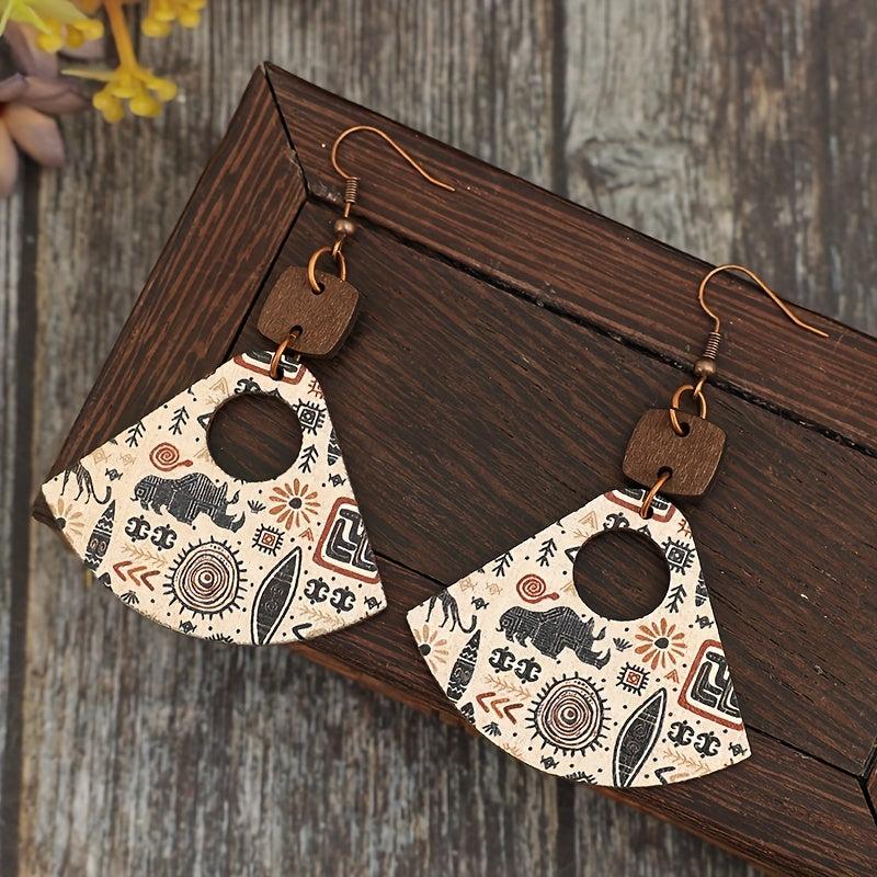 These unique earrings feature intricate printed patterns on recycled wood. They are perfect for casual attire and add a touch of bohemian style to your look.