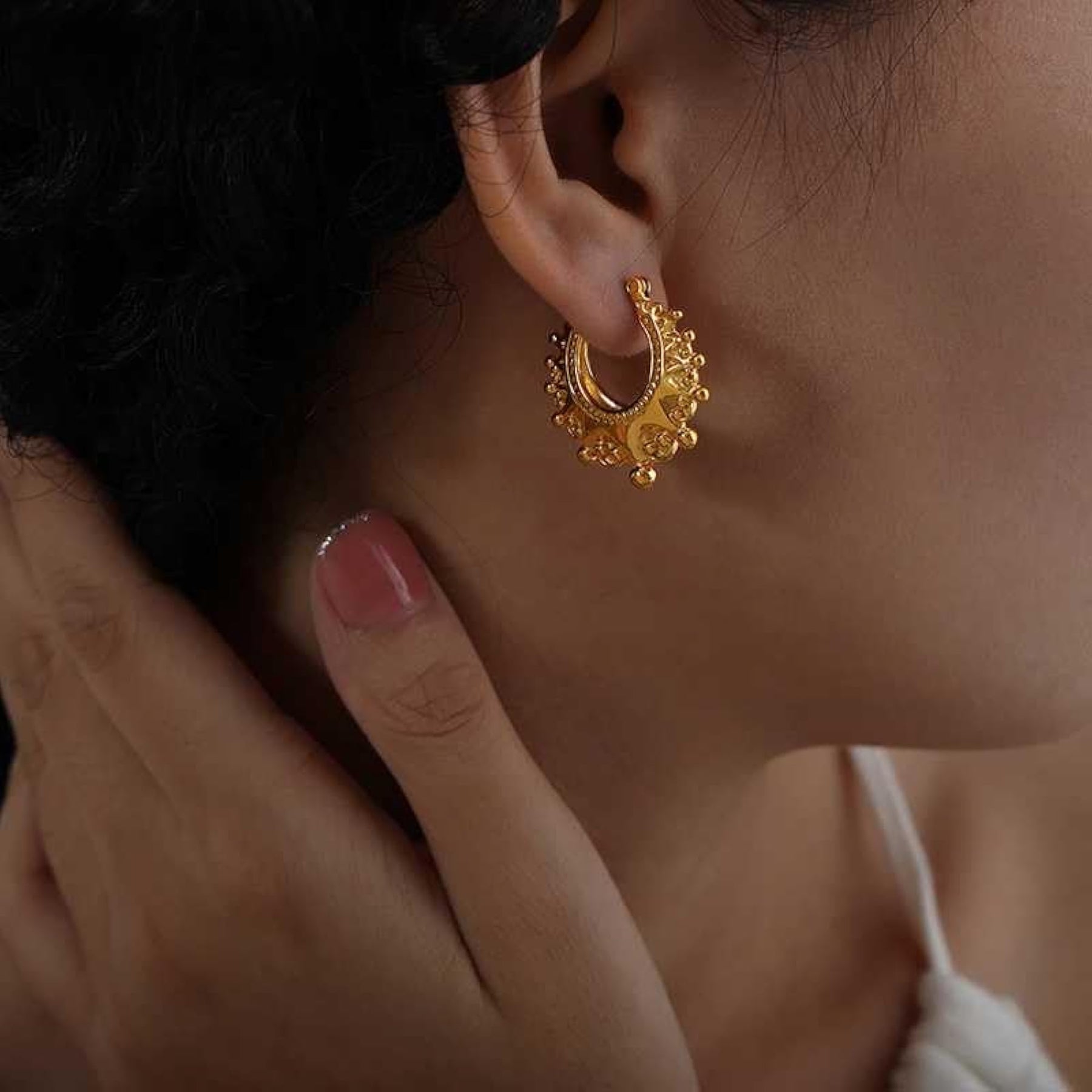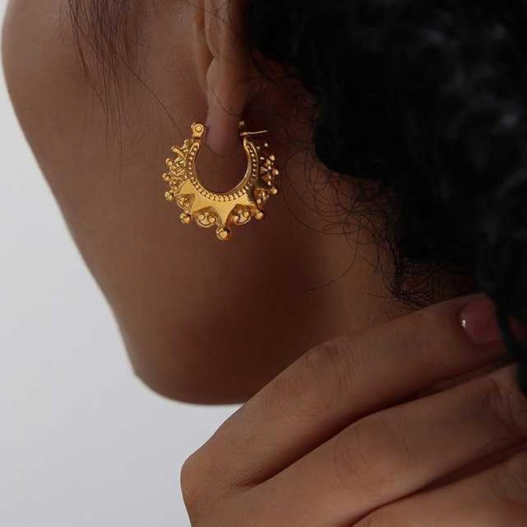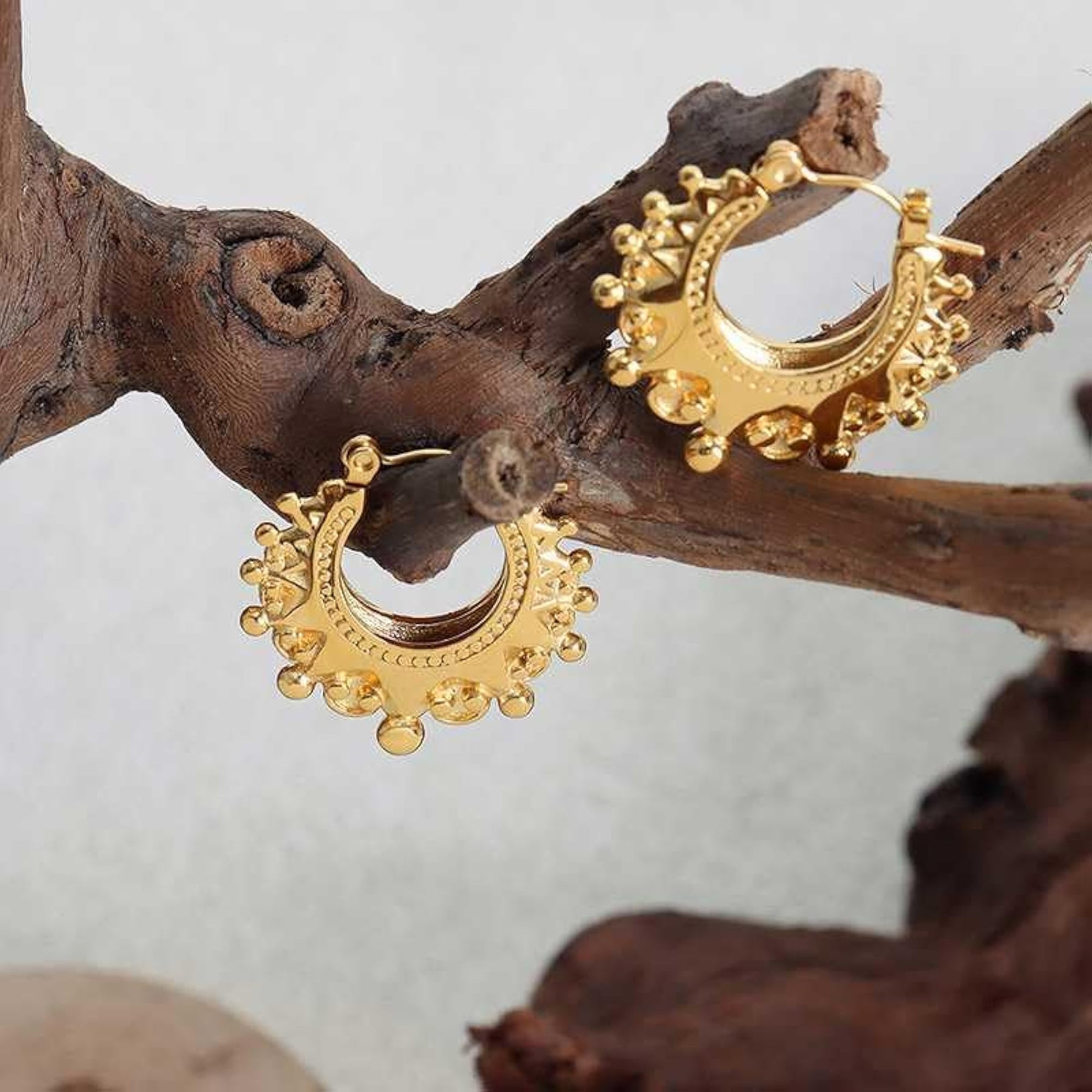 These hoop earrings feature a unique vintage geometric design and are made from high-quality plated stainless steel.