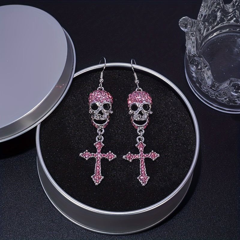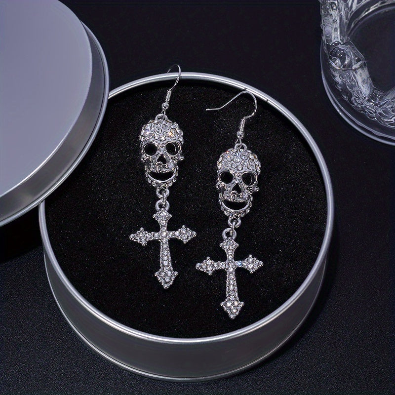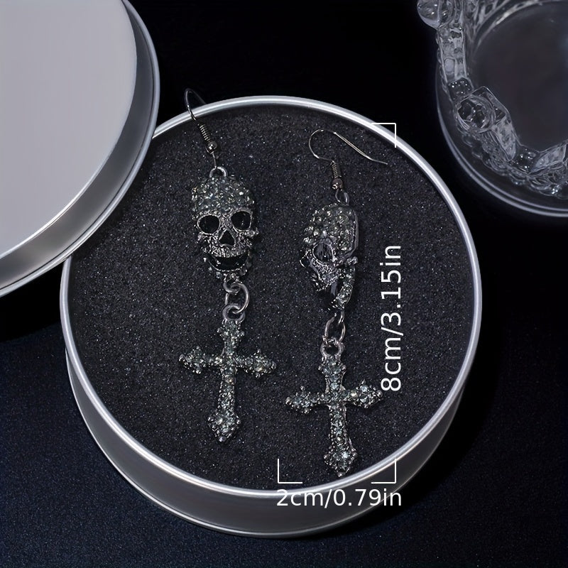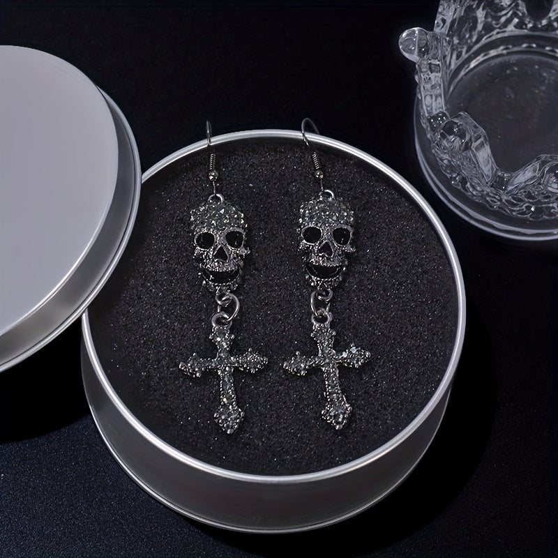 These vintage hook earrings feature a ghost skull head design with a cross inlay and rhinestones for a unique and stylish look. Made from zinc alloy, these earrings are a creative gift for both men and women.