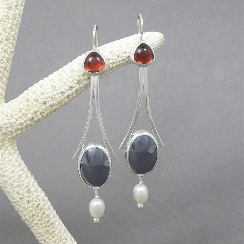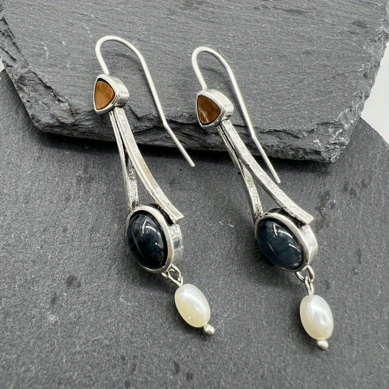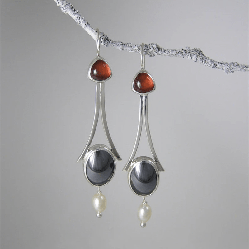 These vintage metal Craftsman earrings feature intricate red stone inlays and faux pearls for a classic look. The hand-hanging design adds a touch of elegance to any outfit.