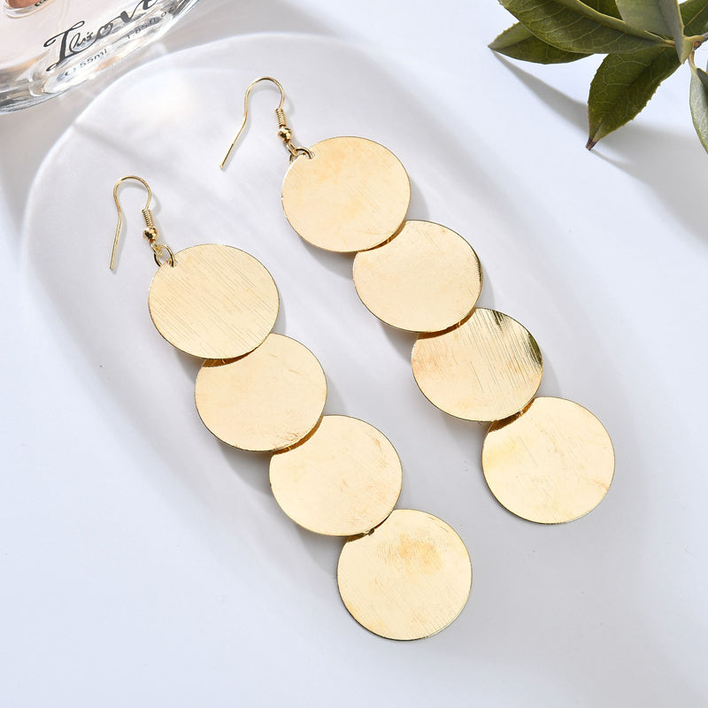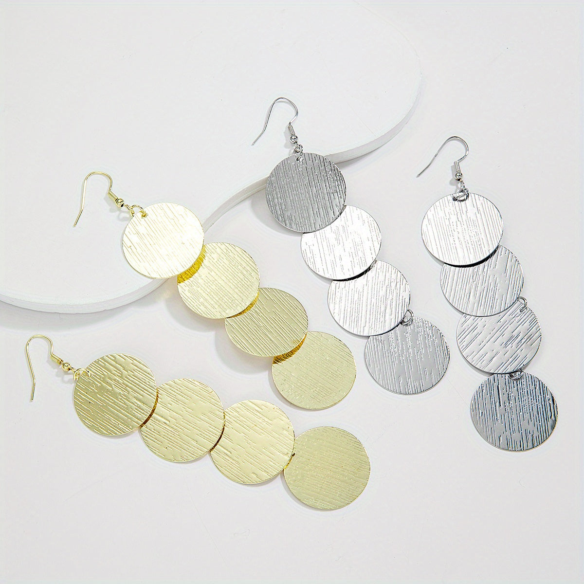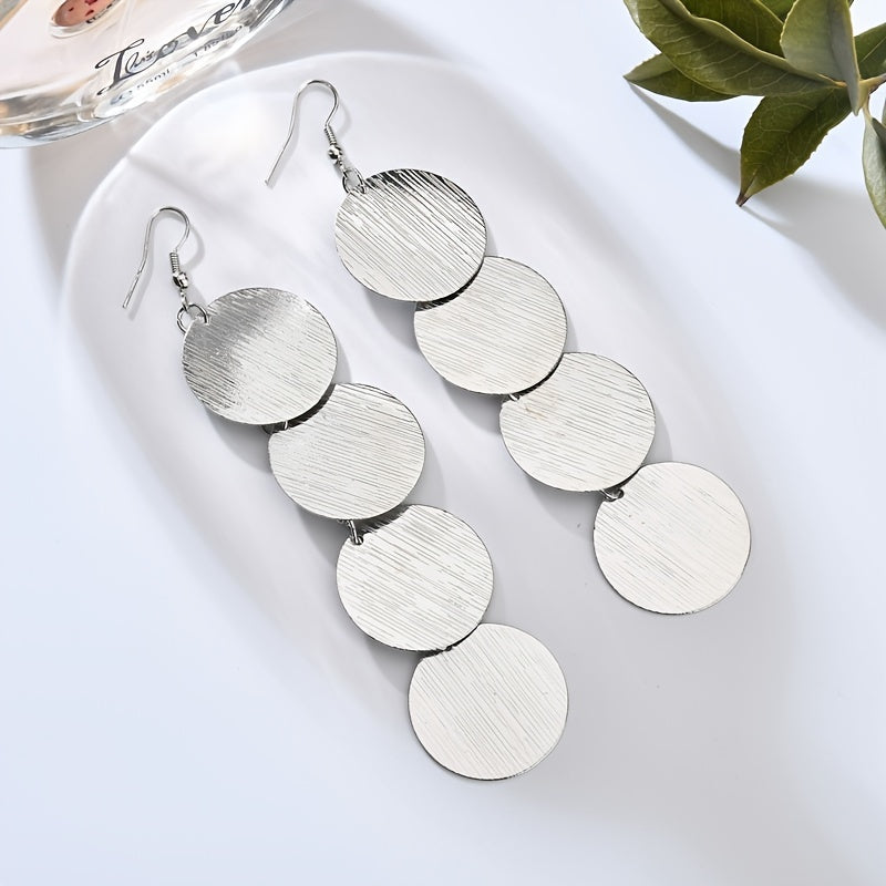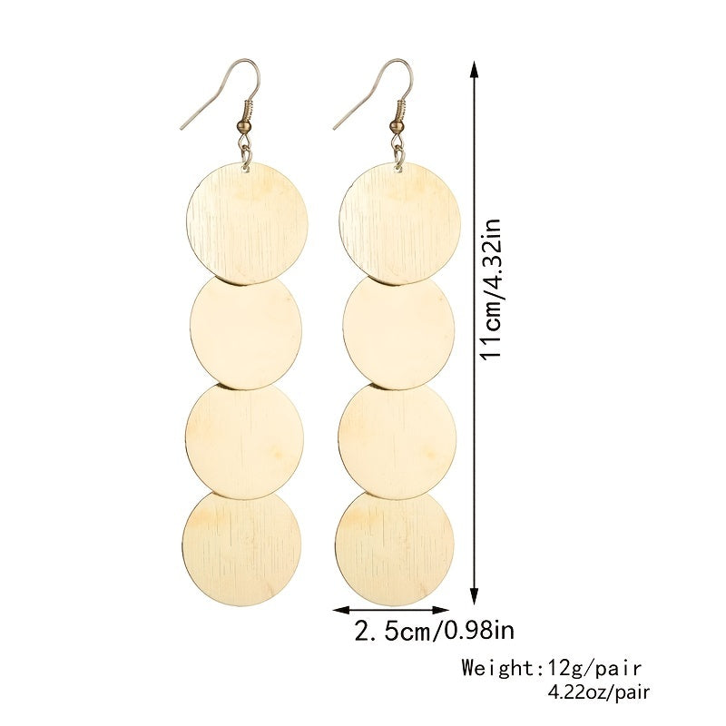 Add a touch of vintage charm with these long irregular metal geometric disc earrings. Perfect for a stylish look.