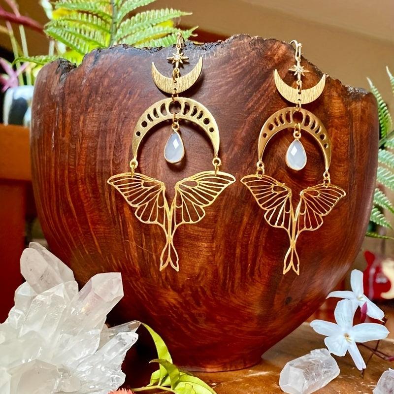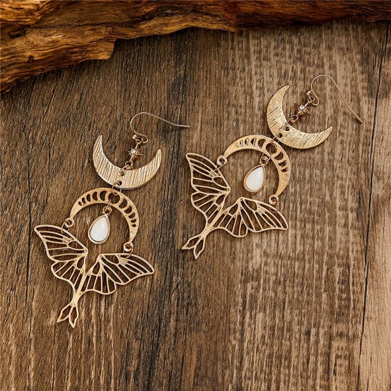 These vintage-inspired earrings feature a moon and moth design with natural stone dangles. Great for adding a boho touch to your look.