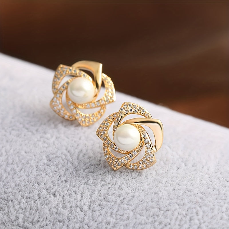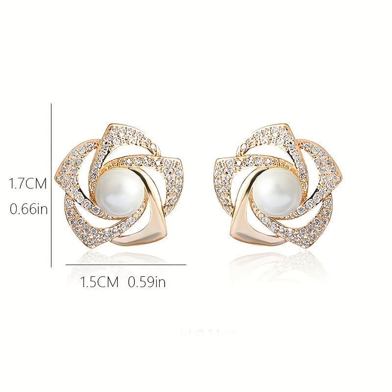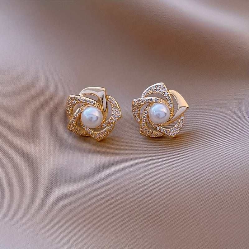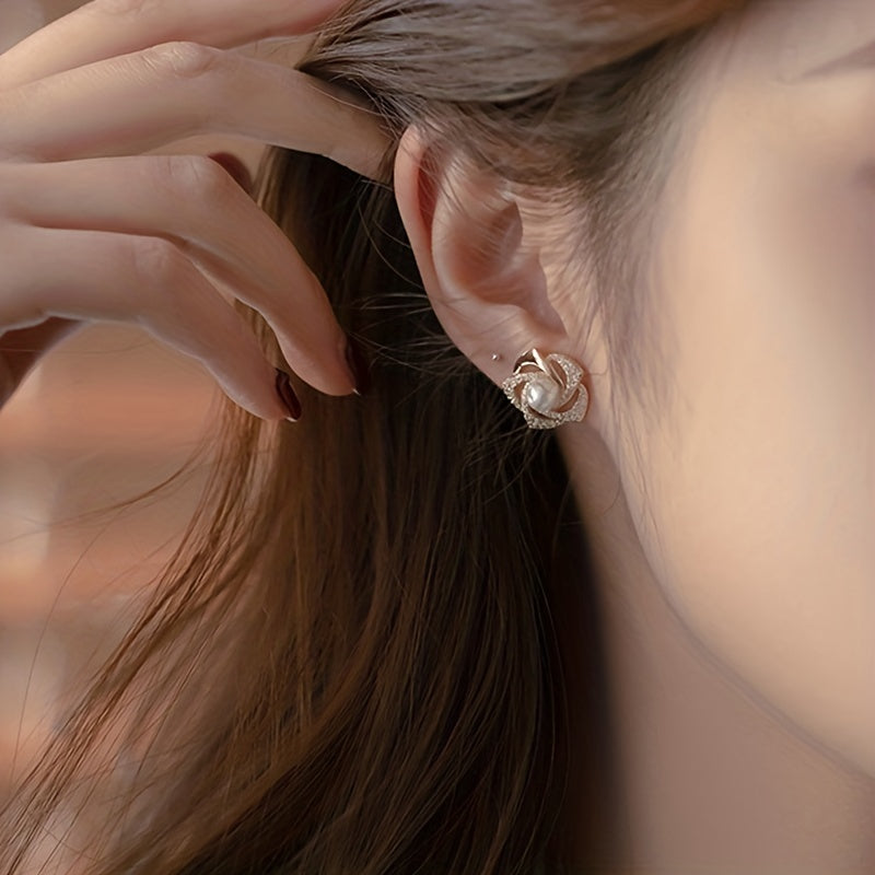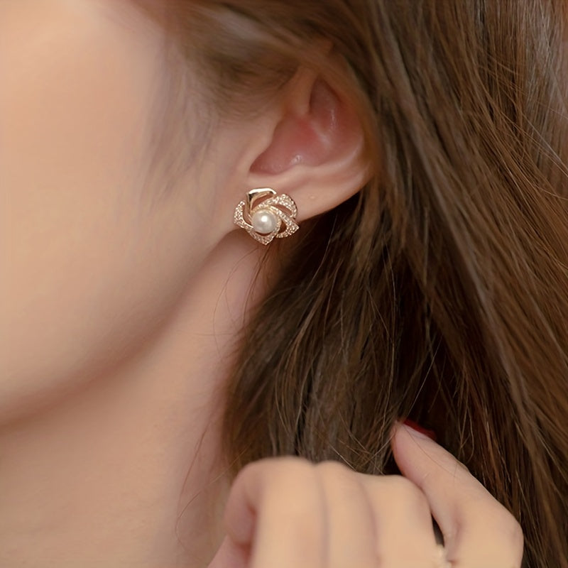 Add a touch of vintage charm with these delicate rose flower stud earrings featuring inlaid rhinestone and faux pearl. Perfect for any occasion and a great gift for a female friend or loved one.