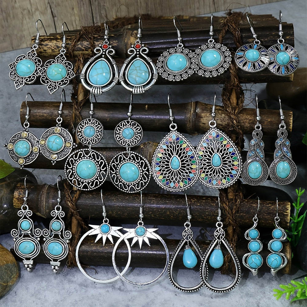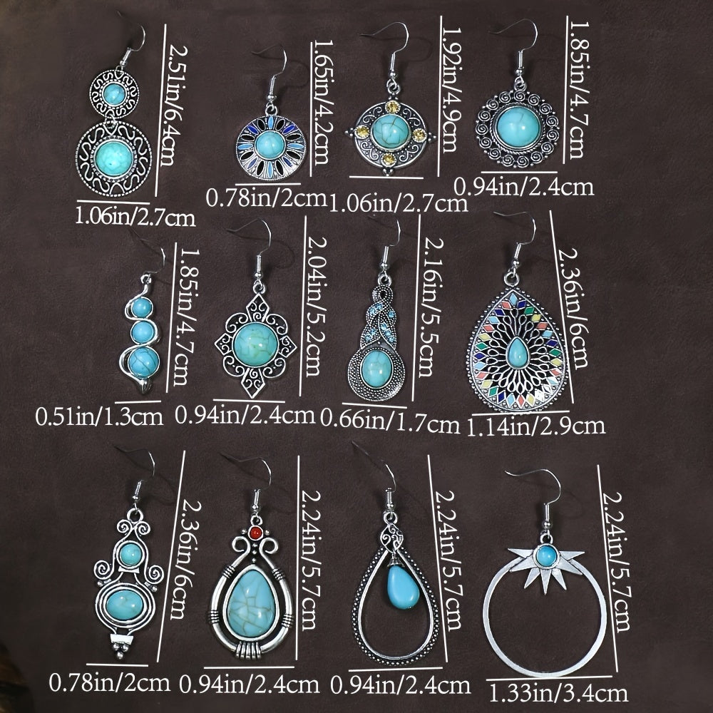 Add a touch of retro elegance to your outfit with these vintage silver earrings featuring geometric pendants and green pine stone rhinestone decorations.