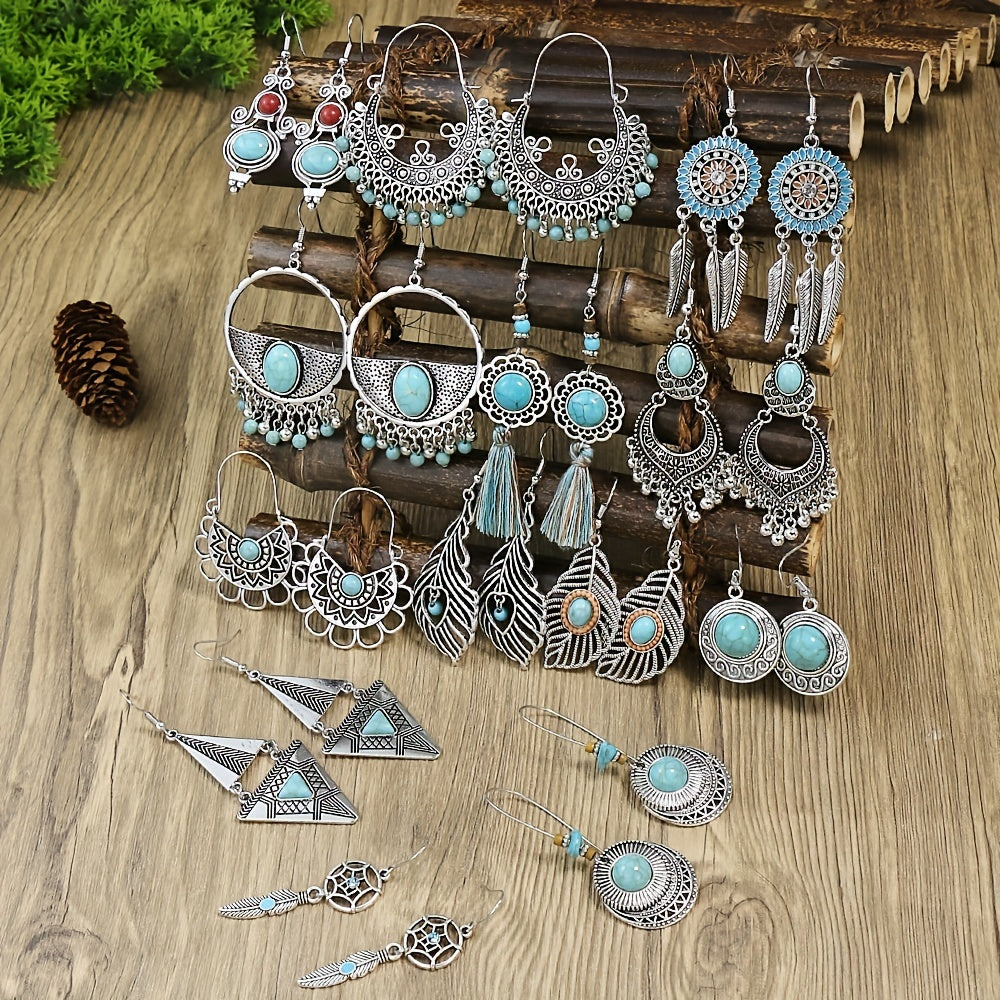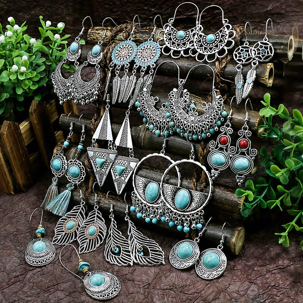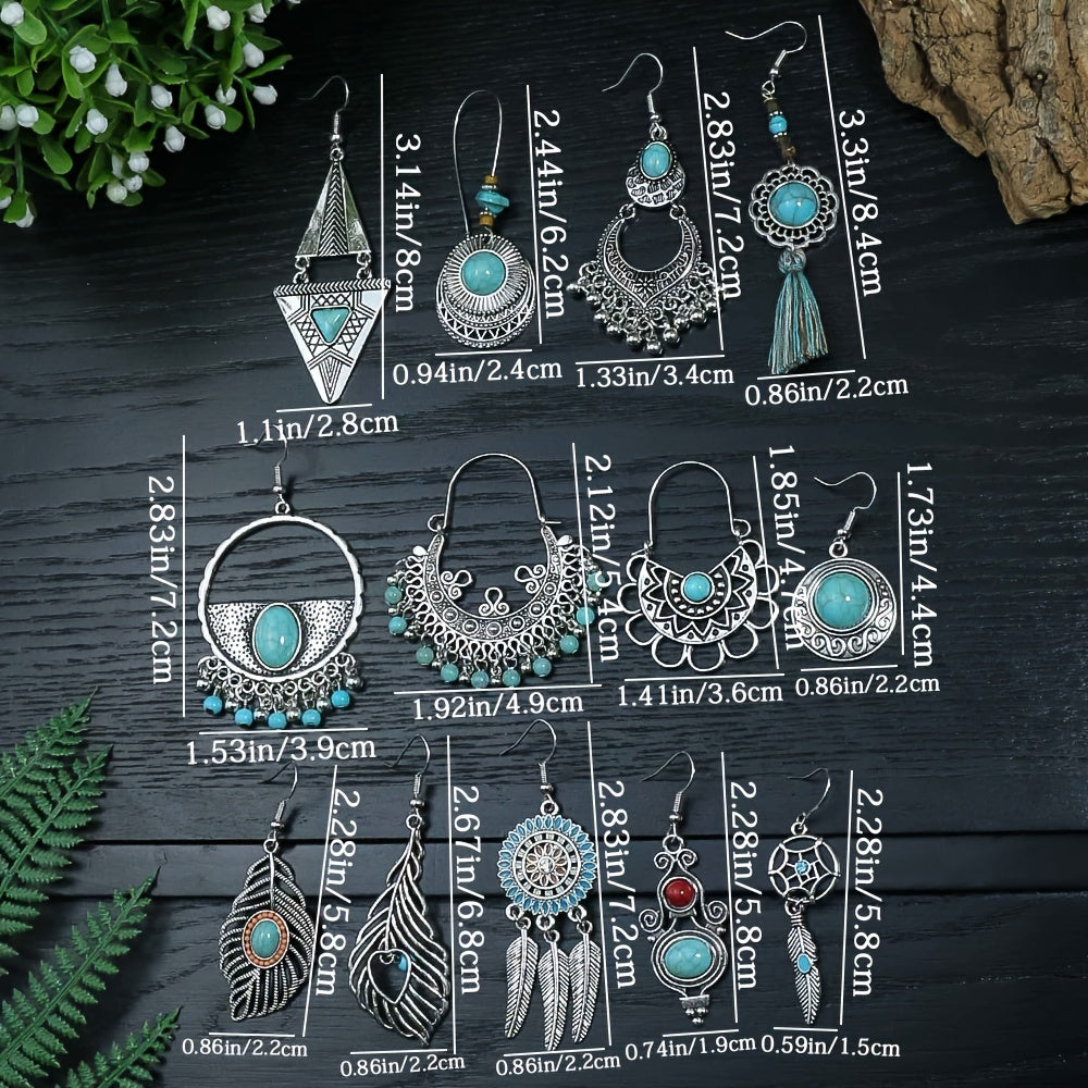 This set includes 13 pairs of antique silver earrings with turquoise stones, perfect for adding a touch of vintage style to your look. Great for everyday wear or special occasions.