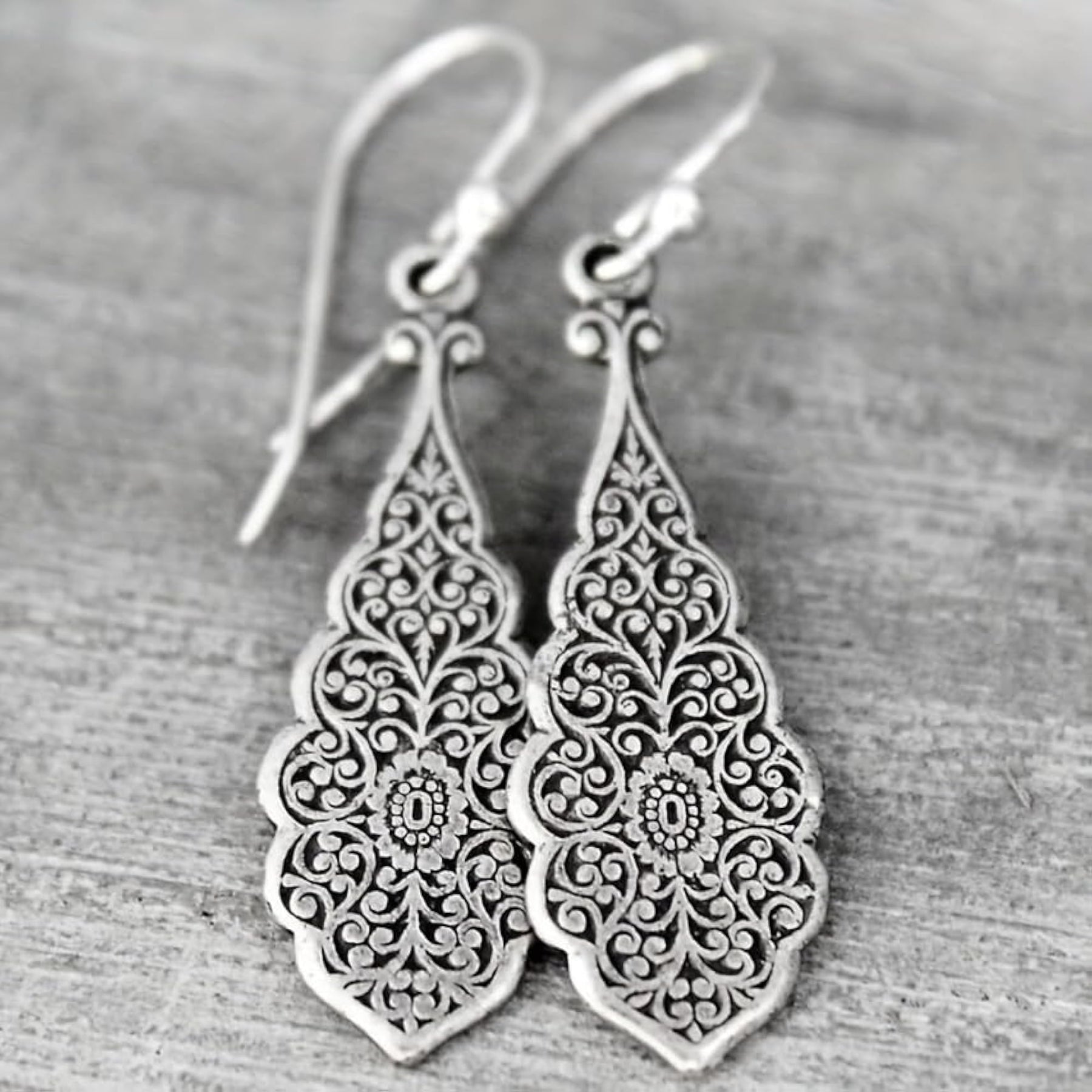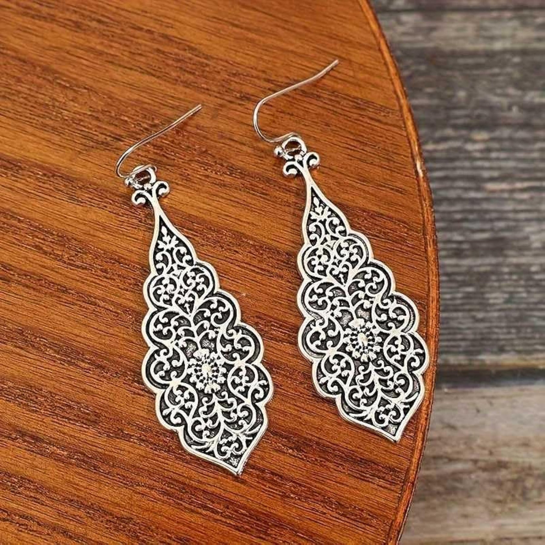These lightweight boho earrings feature an oxidized flower carved pattern, perfect for adding a touch of vintage style to your look.
