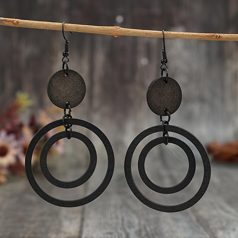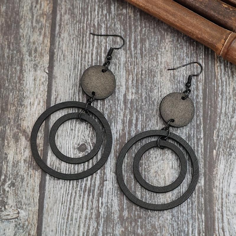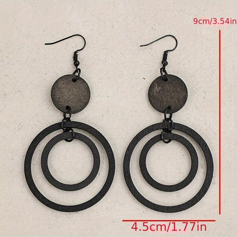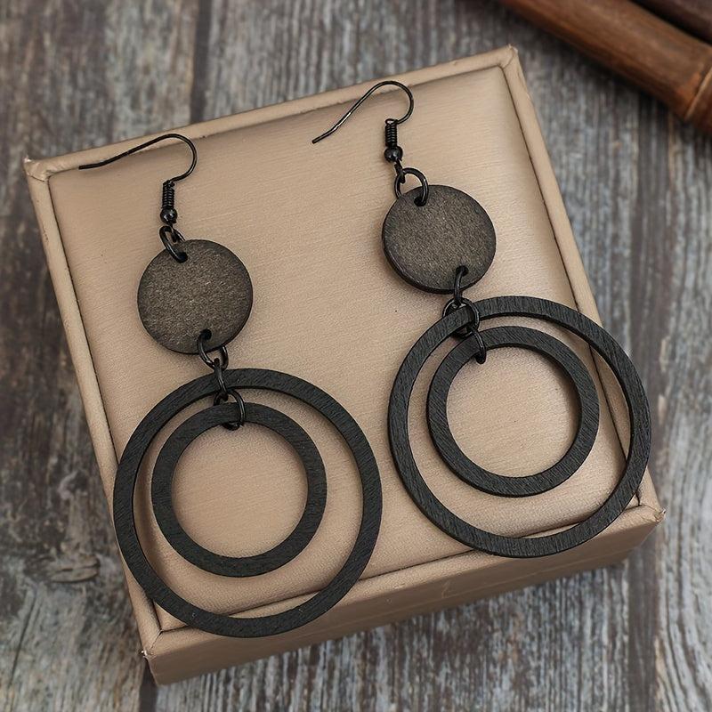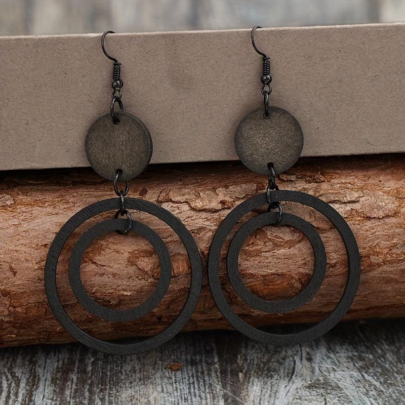 Handcrafted vintage style wooden earrings with double circle iron ear hooks. Perfect for daily wear in all seasons. No plating used in the design.