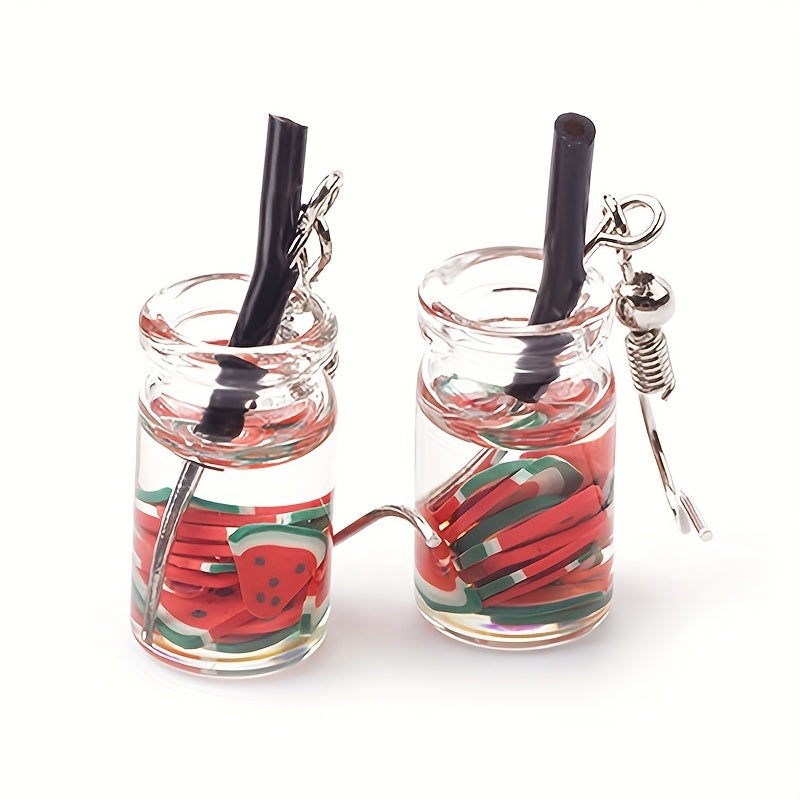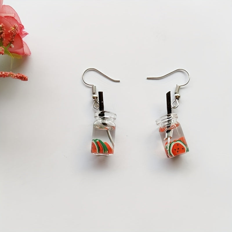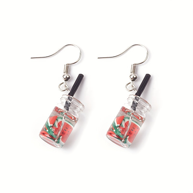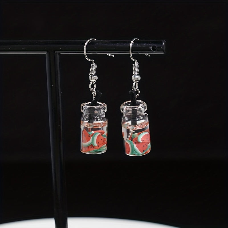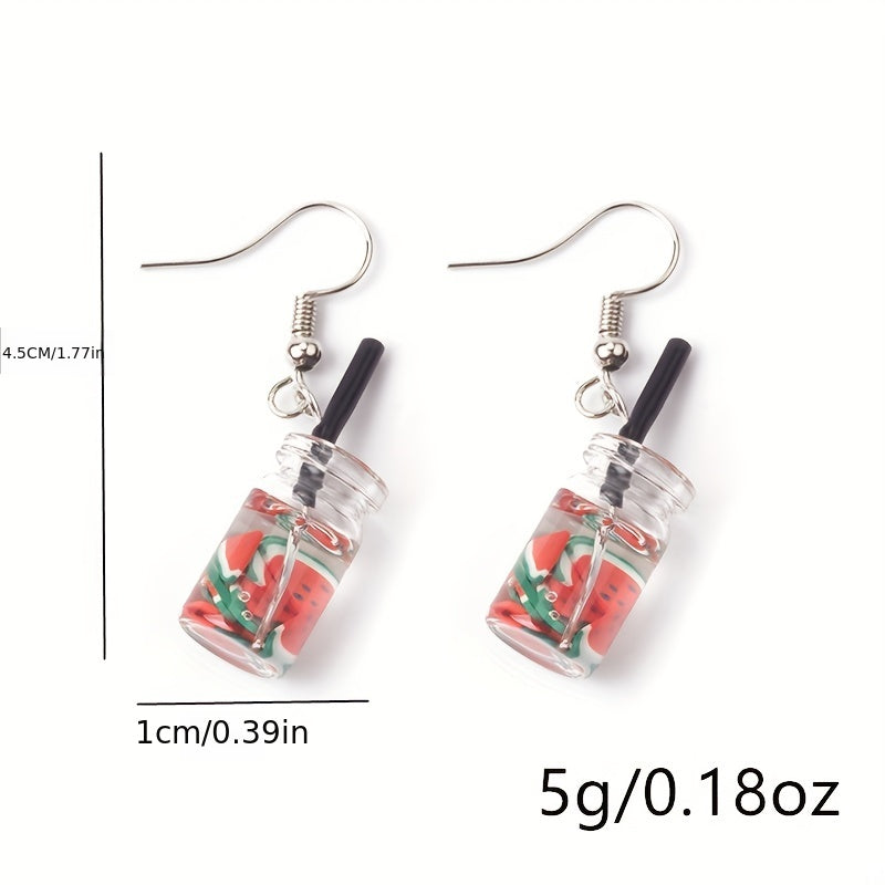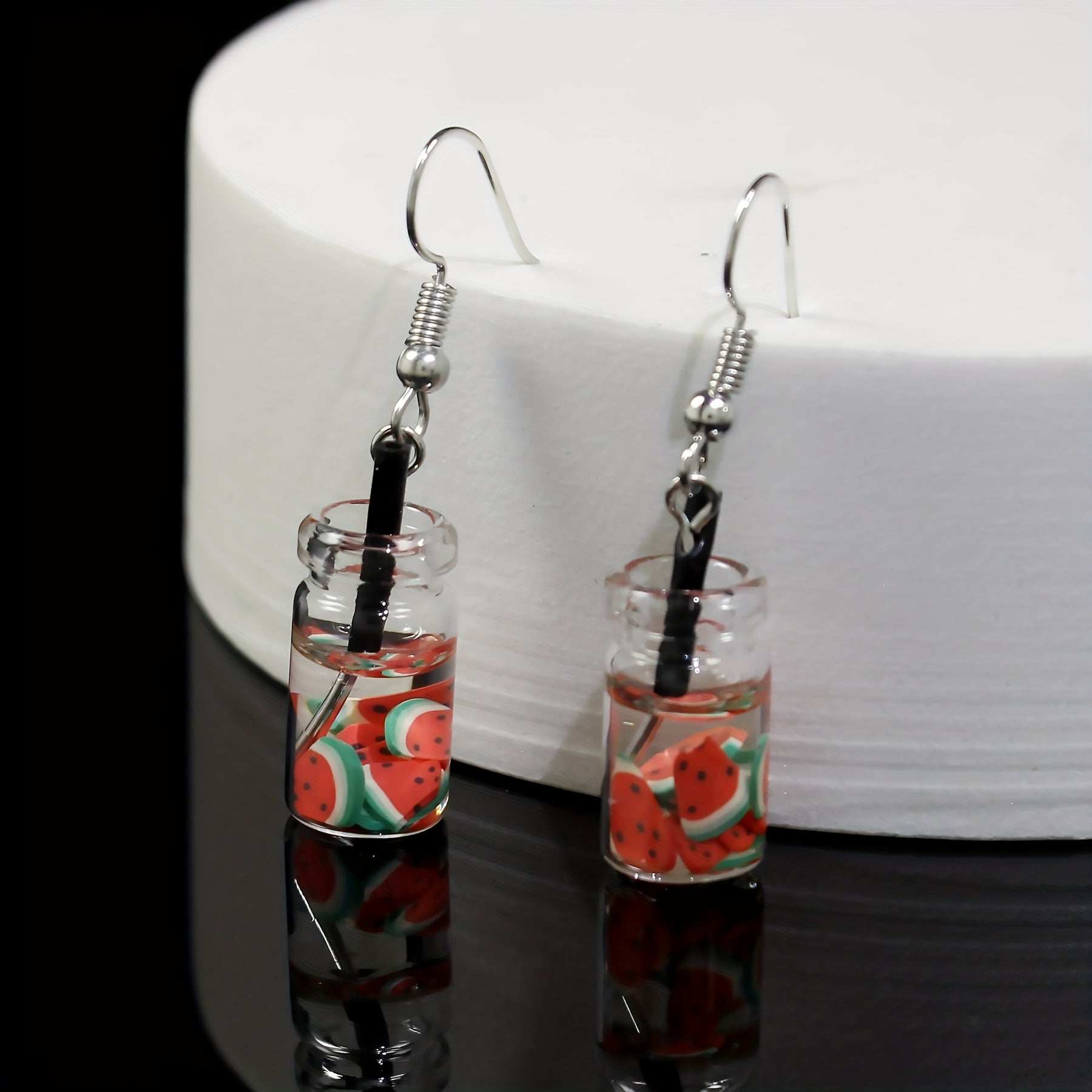 These cute watermelon drink bottle dangle earrings are perfect for daily casual wear. They make a great gift for women and girls who love unique jewelry pieces.