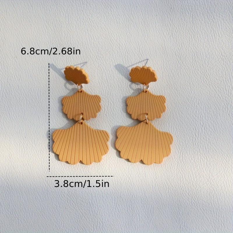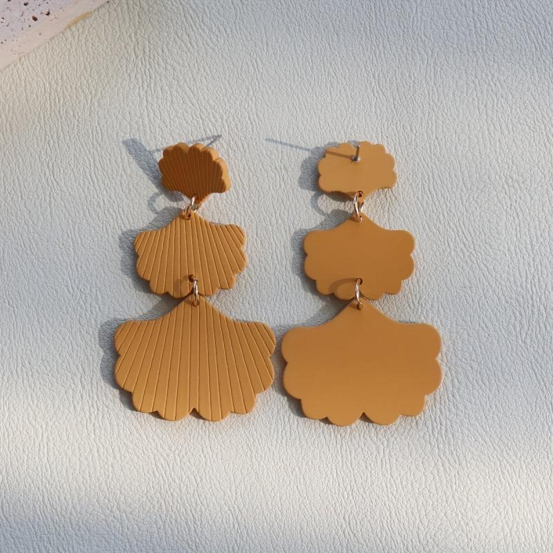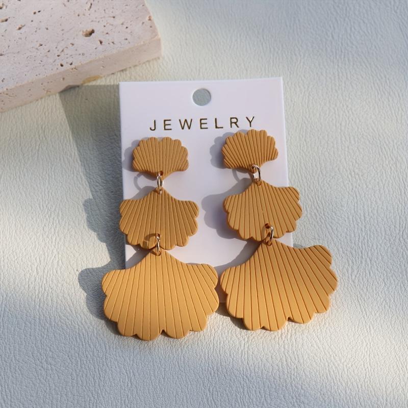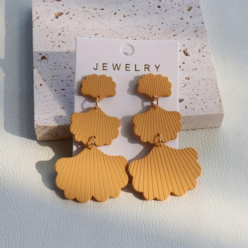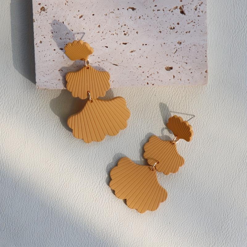 These earrings feature a unique design with three hanging ginkgo leaves carved with an embossed texture. The soft clay feel gives them a retro and bright vacation style.