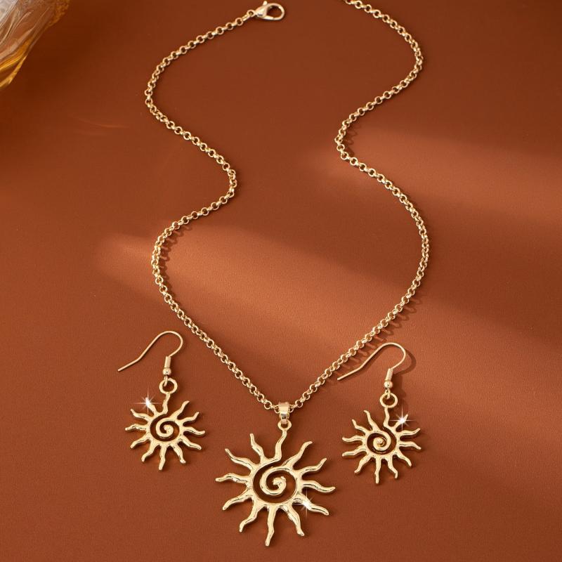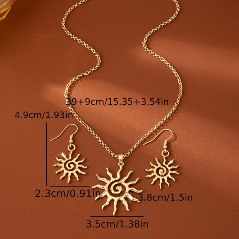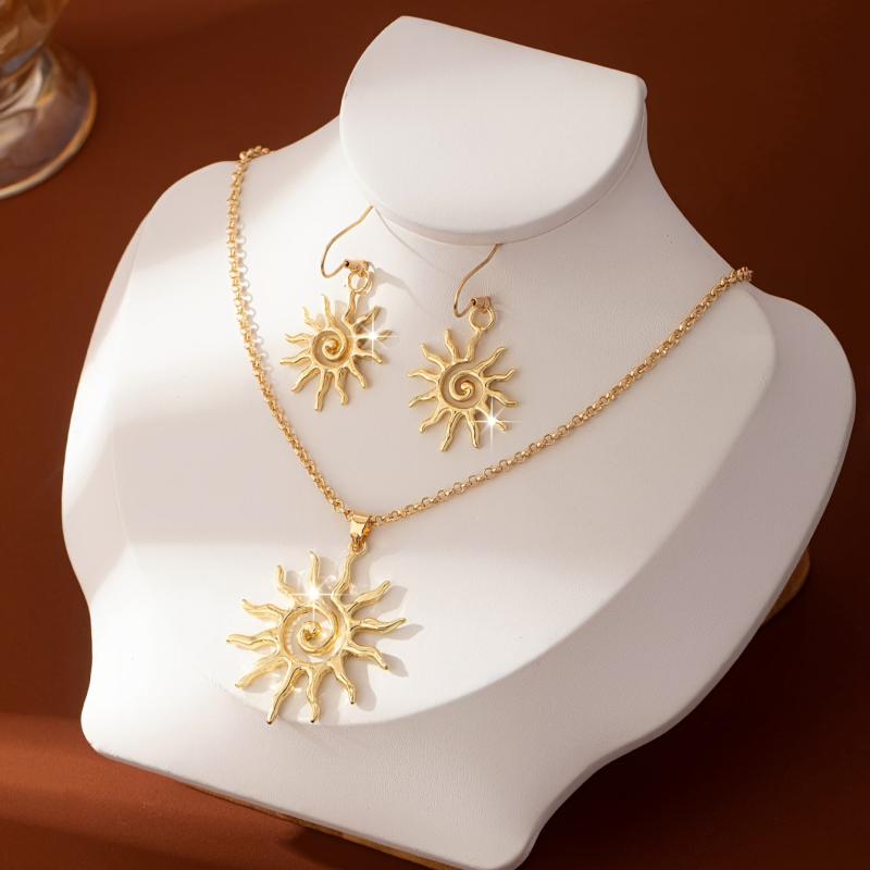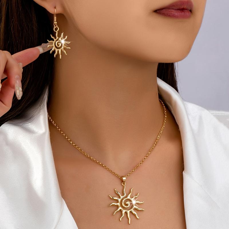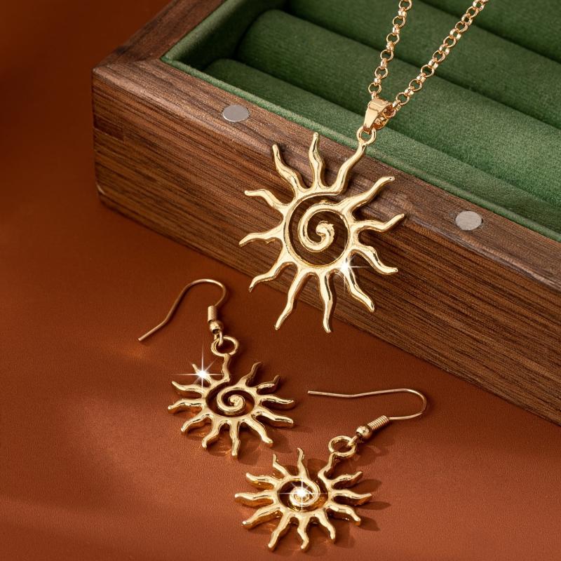 Upgrade your daily wear or party outfits with this beautiful jewelry set. The sunburst earrings and pendant necklace in golden tone zinc alloy offer a versatile and elegant accessory.