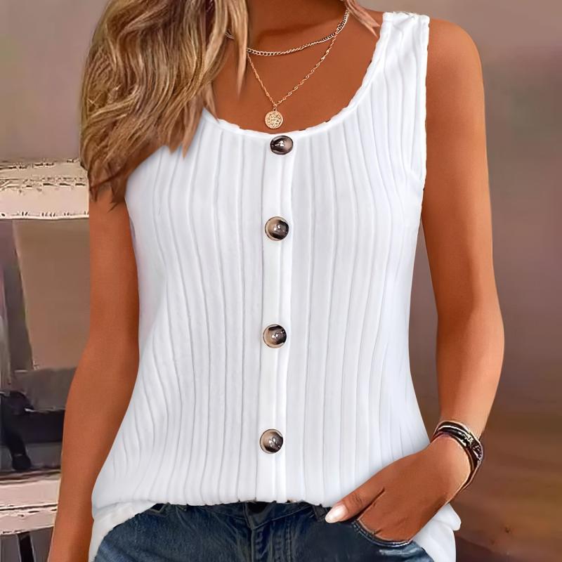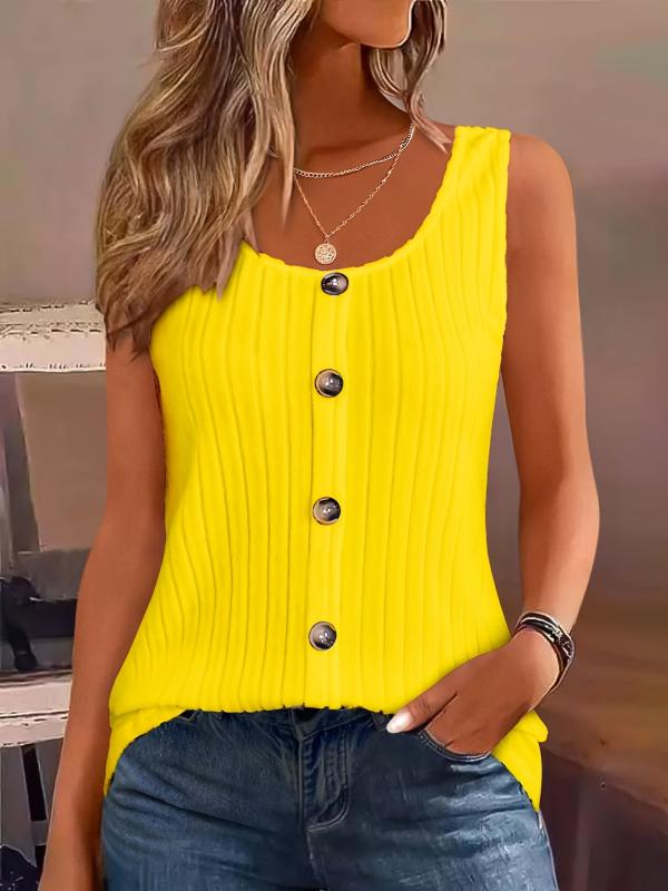This vibrant yellow sleeveless top features a round neck and button front closure, making it a perfect casual and sexy shirt for the summer. The H silhouette offers a regular fit, and the top is machine washable for easy care.