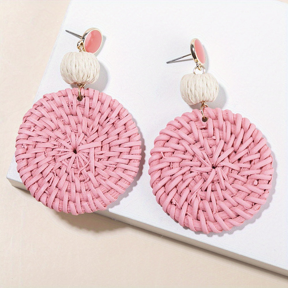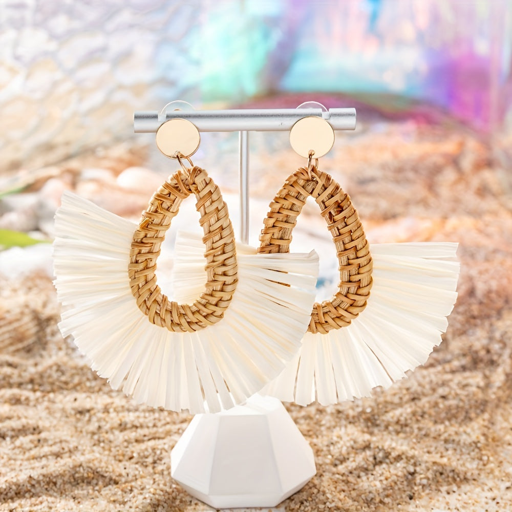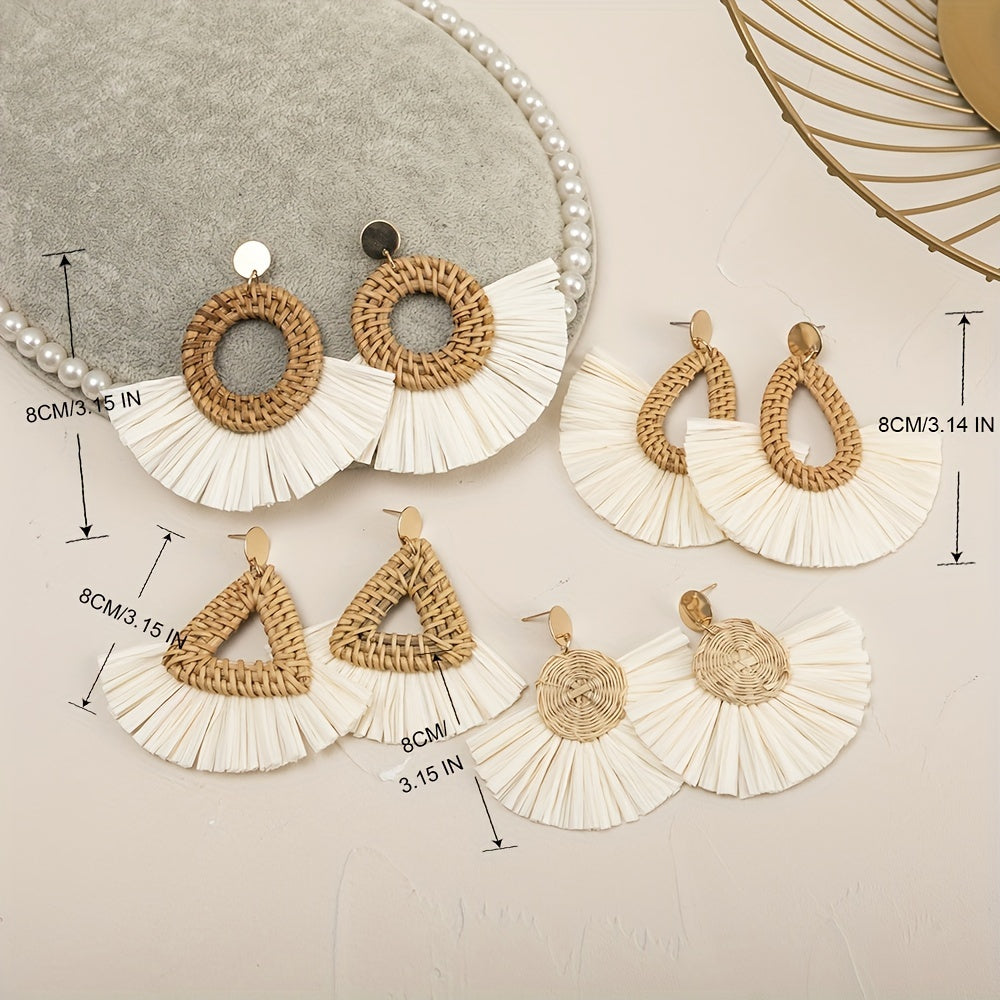 Elevate your look with these wooden raffia dangle earrings, perfect for daily casual wear. The bohemian style adds flair to any outfit.