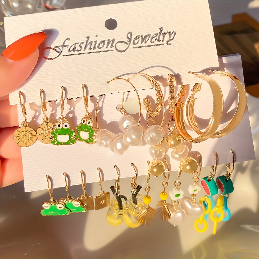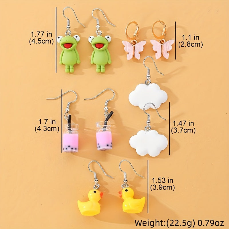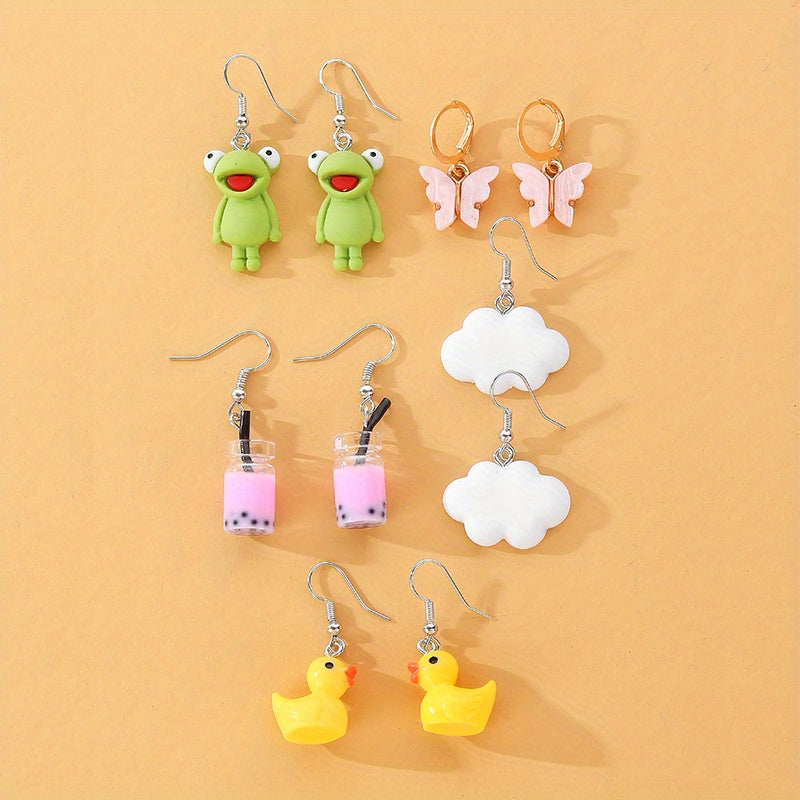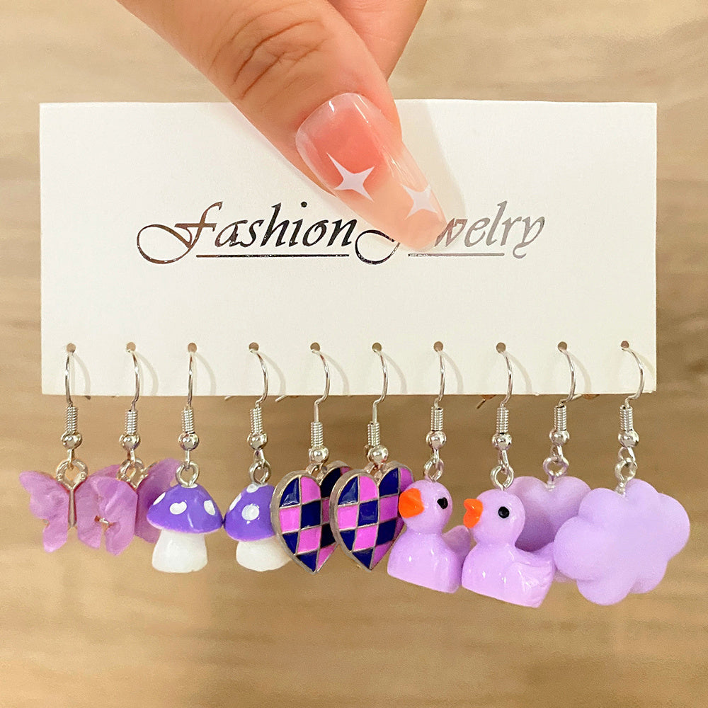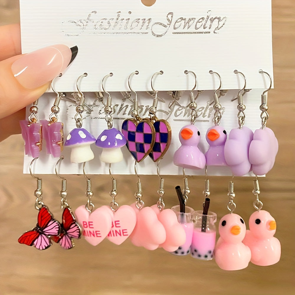 Adorn your ears with this versatile set of Y2K style earrings featuring pink, purple, heart, butterfly, and duck designs.
