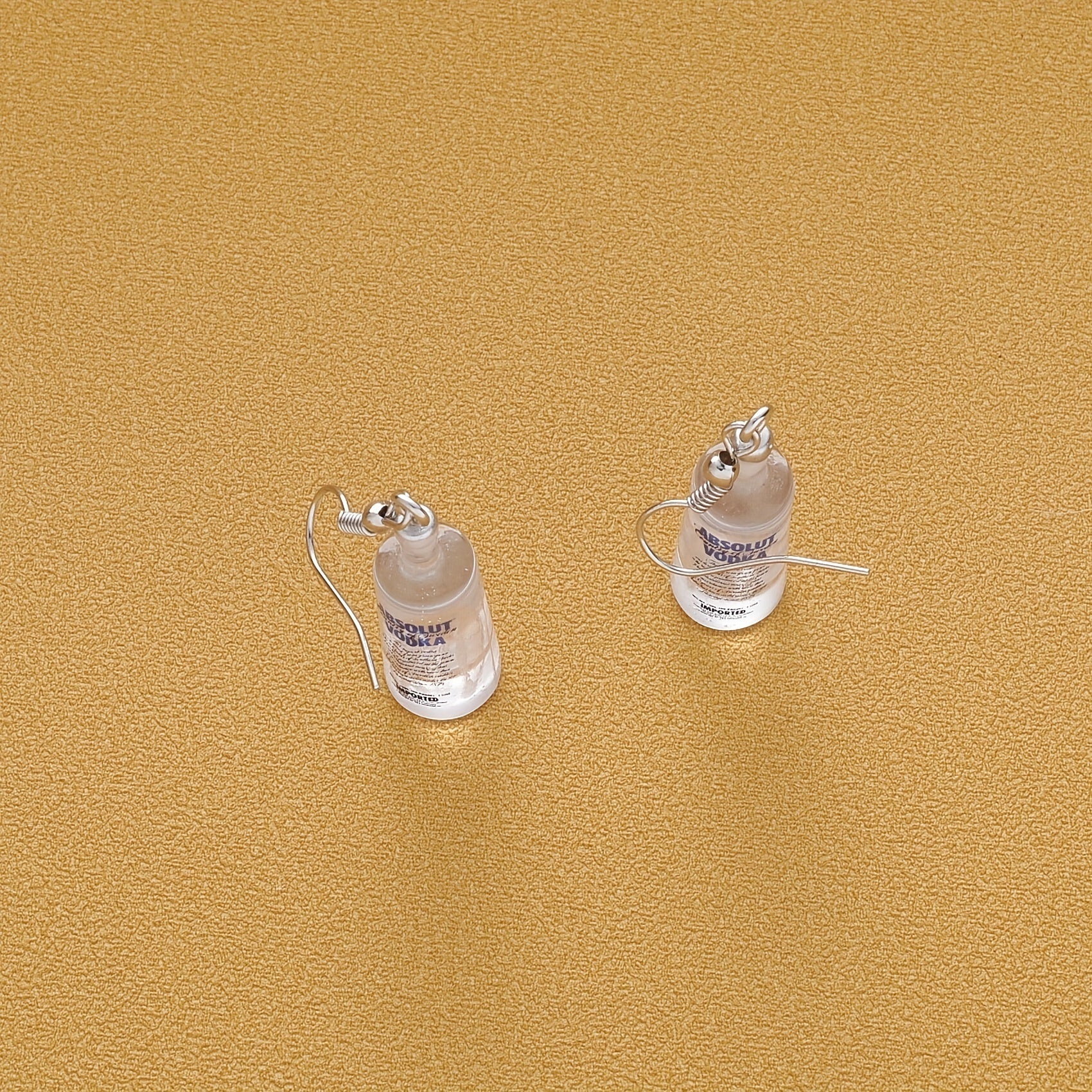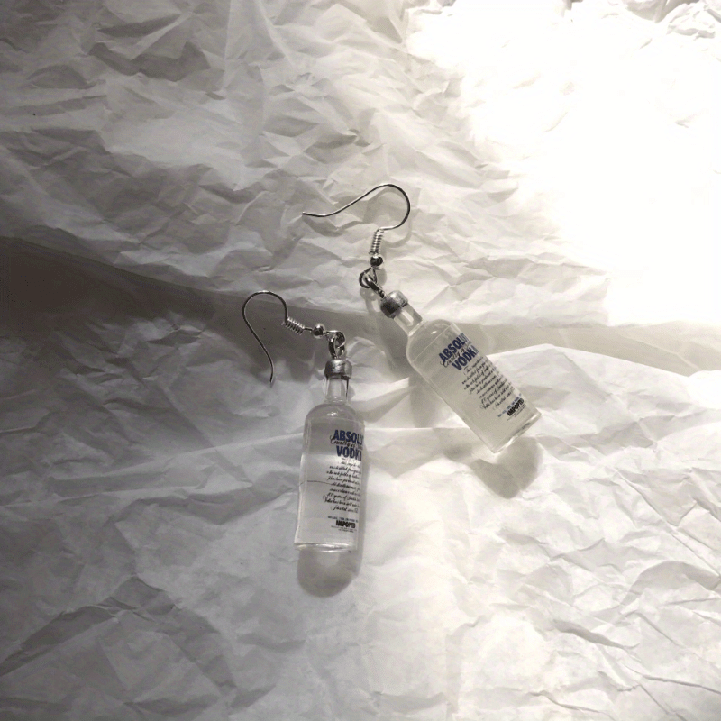 These earrings feature a unique design resembling a miniature vodka bottle. Made of resin, they have a transparent look that adds a playful touch to your outfit.
