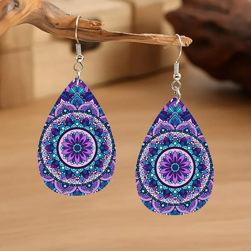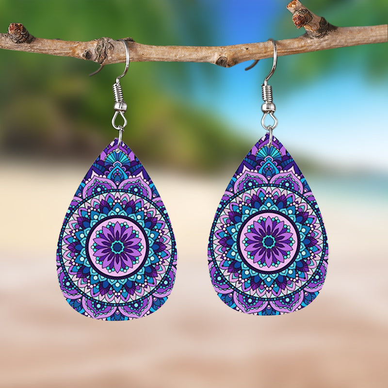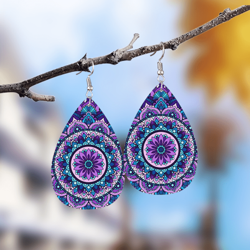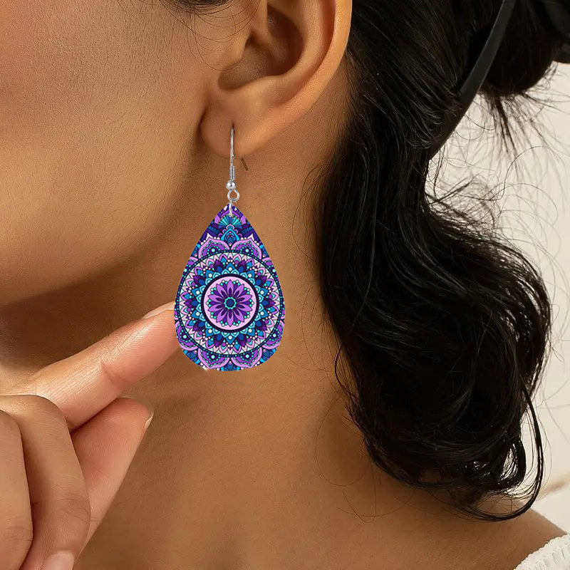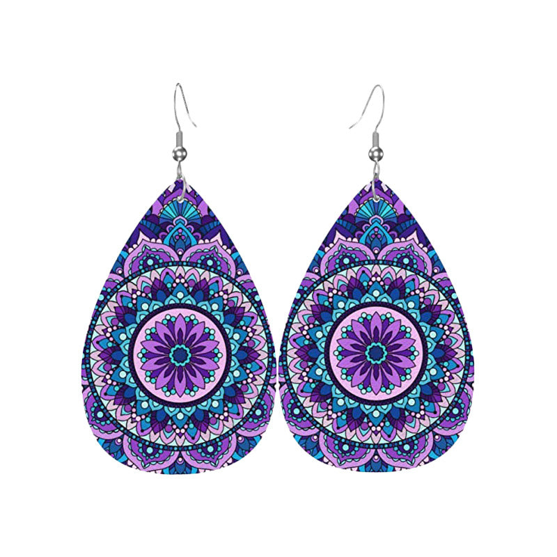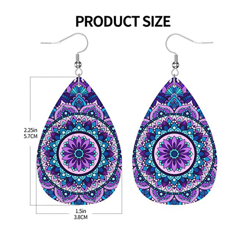 These teardrop dangle earrings feature a symmetric yoga flower pattern print on high-quality PU leather. Perfect for adding a bohemian touch to any outfit. Ideal as a gift for women.