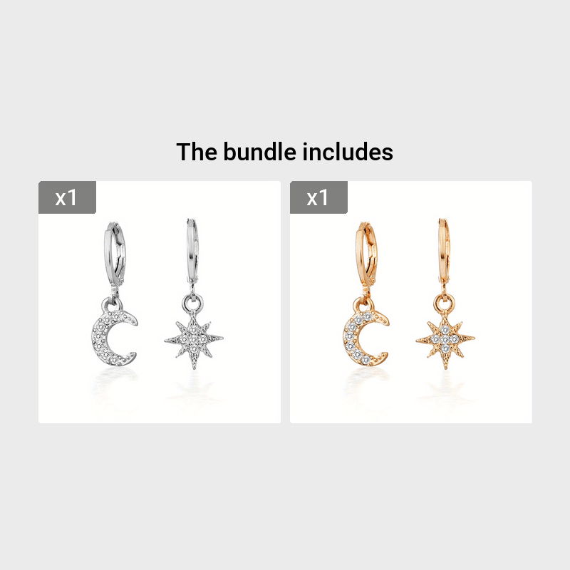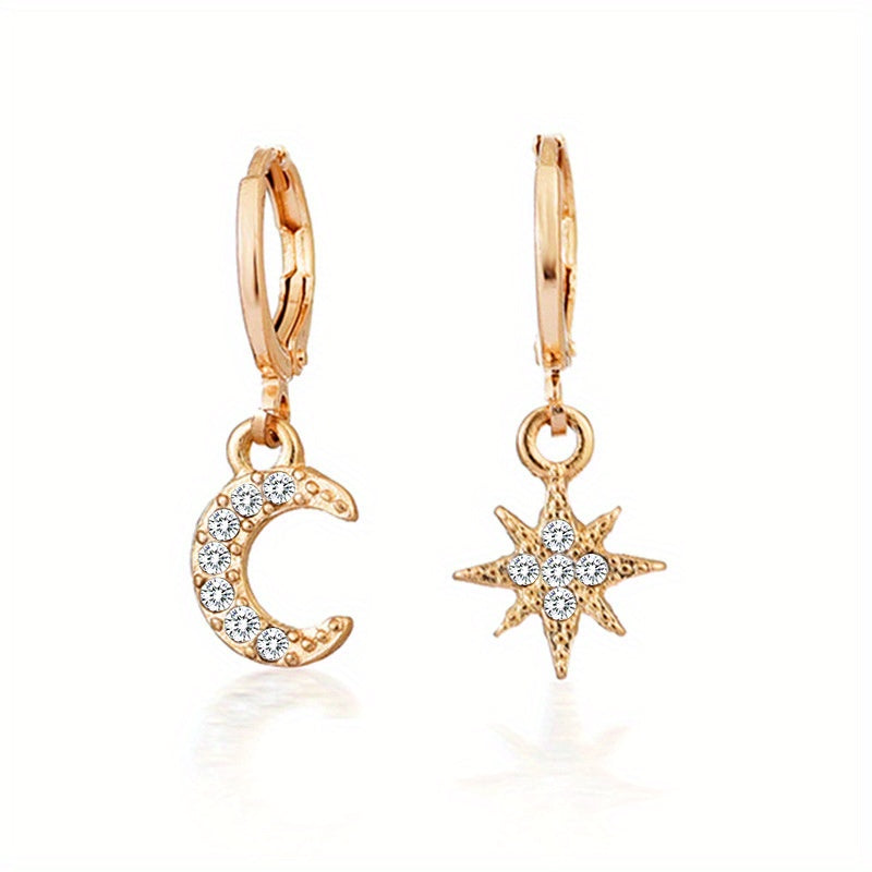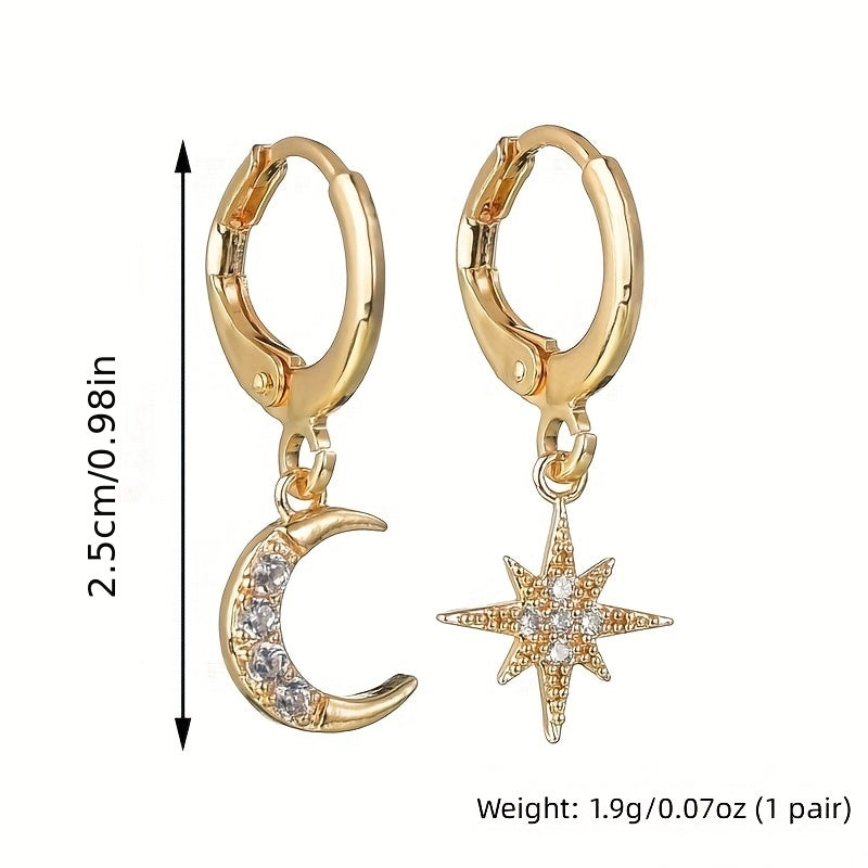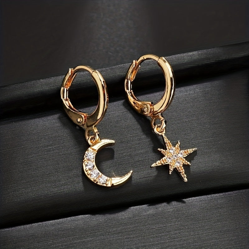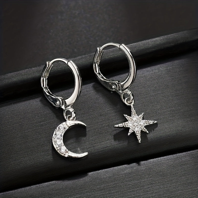 These stylish hoop earrings feature an asymmetric design with zircon star and moon accents. Add a touch of uniqueness to your look.