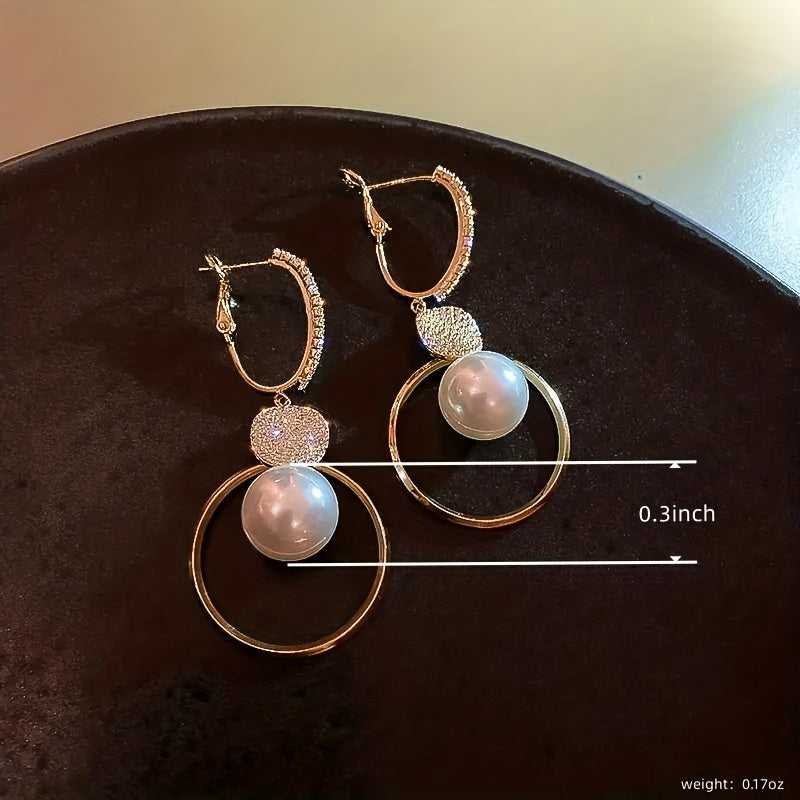 Elegant earrings featuring sparkling zircon decoration and faux pearl pendants. Made with high-quality alloy and plated with 14K gold. Perfect gift for women.