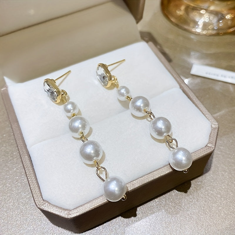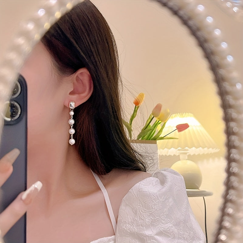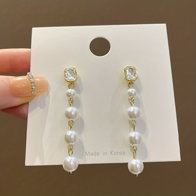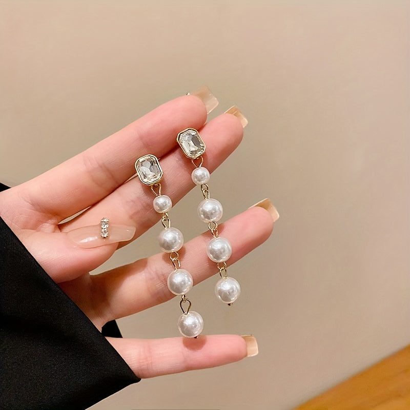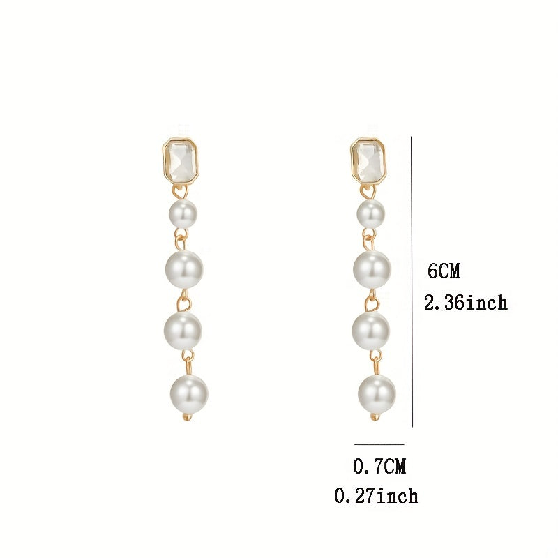 Complete your wedding look with these elegant and stylish long dangle earrings featuring cuboid zircon and faux pearl decorations. Made of high-quality alloy materials.
