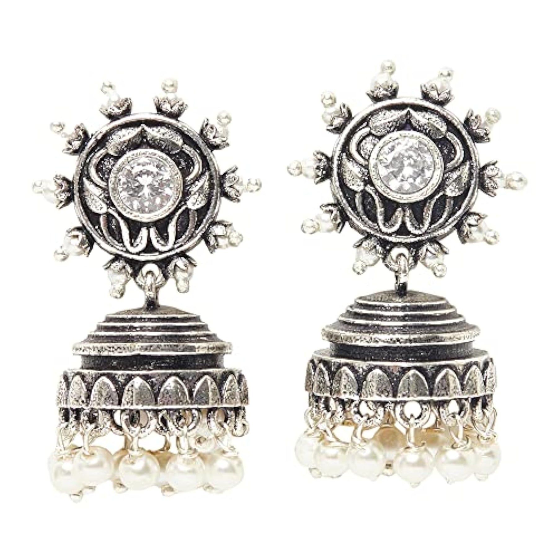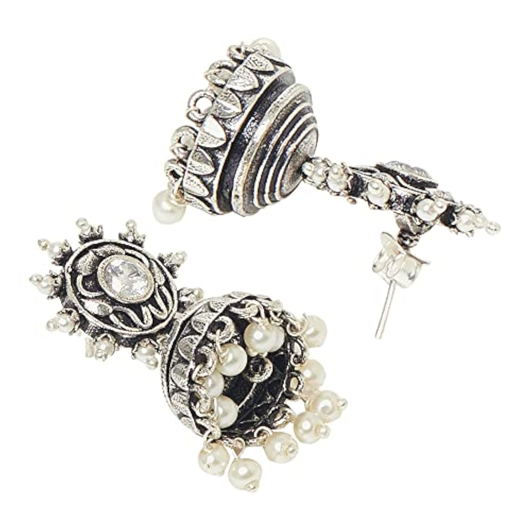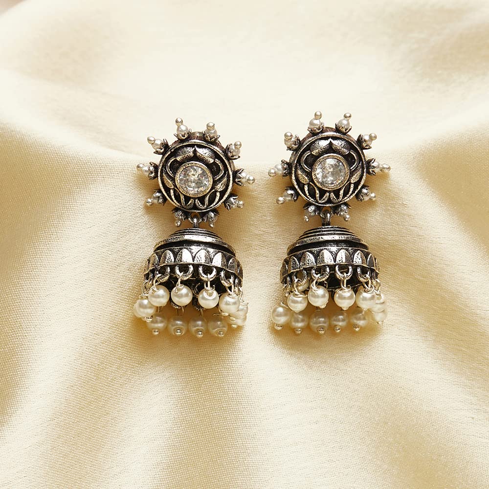 These stunning jhumka earrings feature zircon & faux pearls on brass. Perfect for adding a touch of elegance to your look.