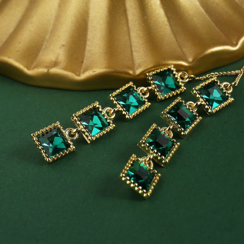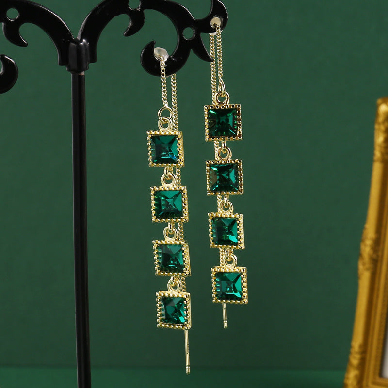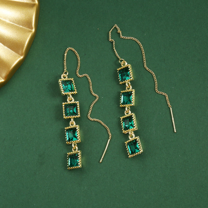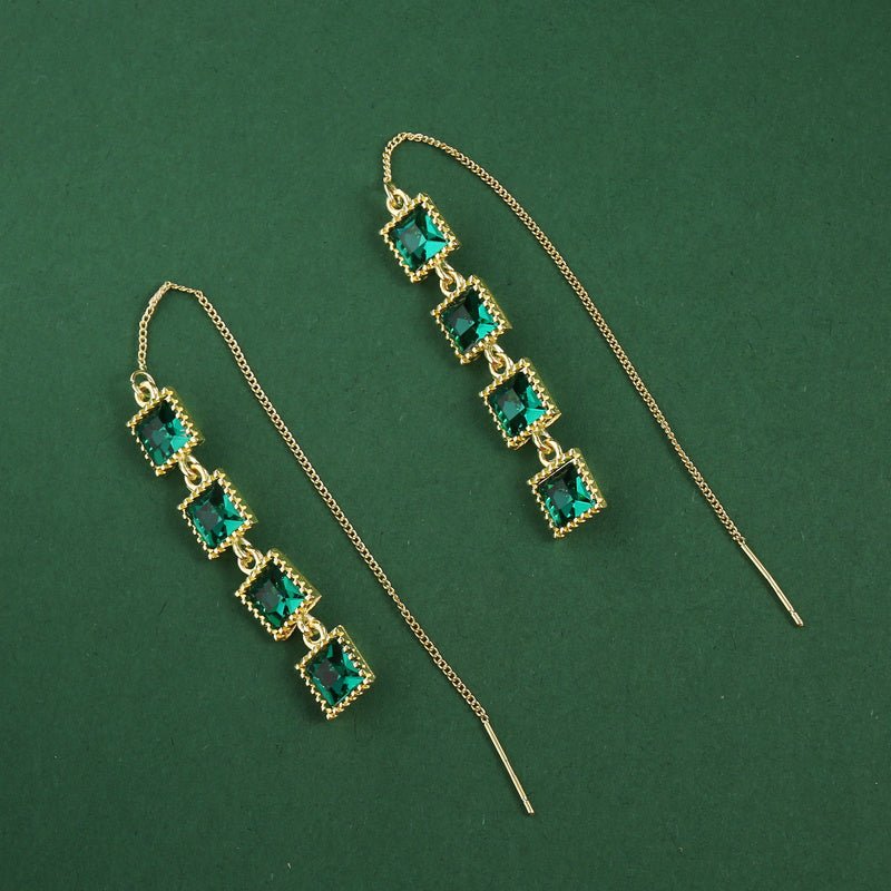 Elegant threader earrings with inlaid square zircon pendant suitable for wedding and engagement attire.