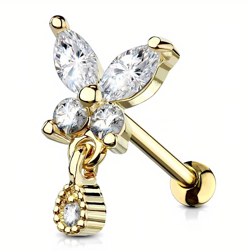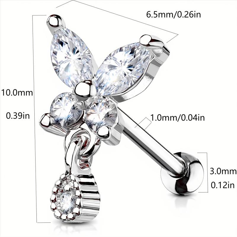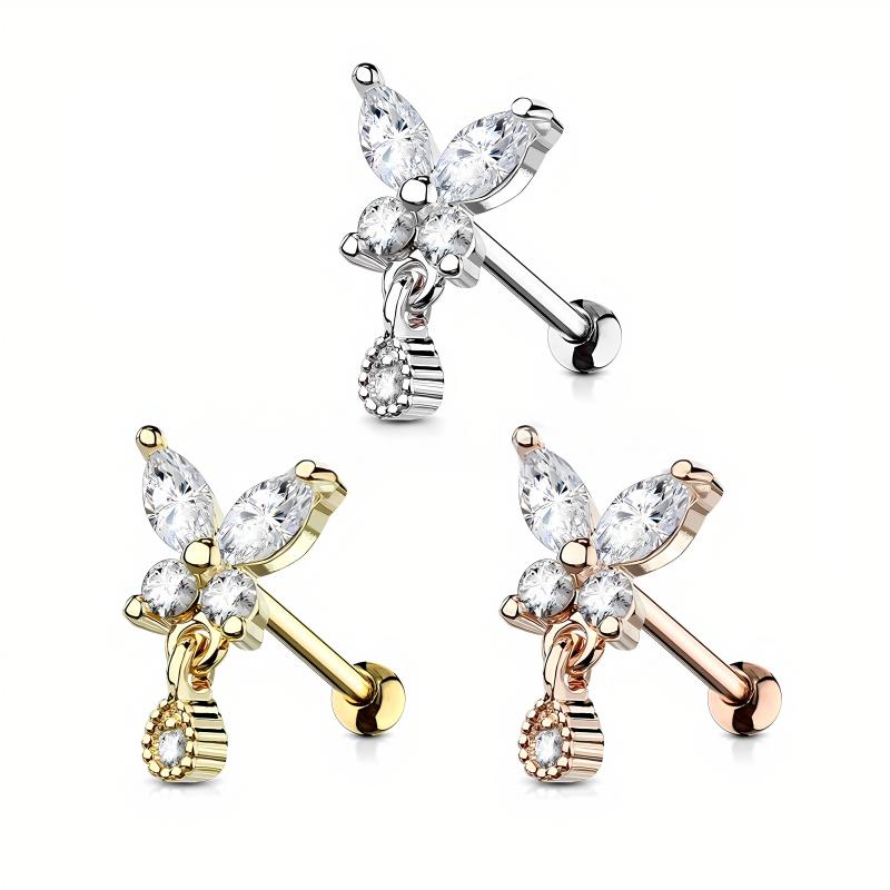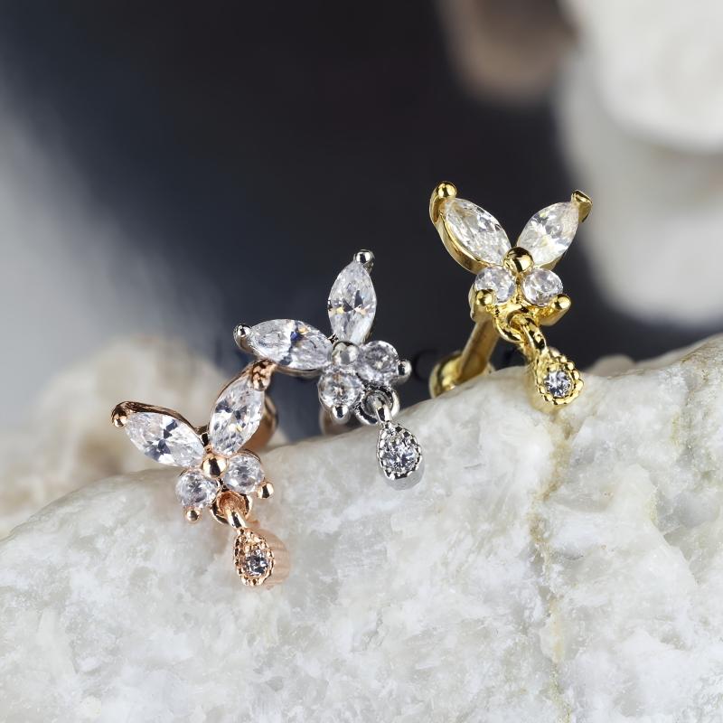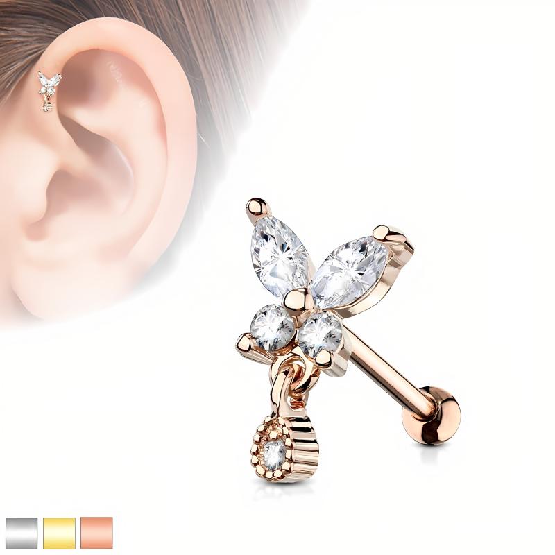 Minimalist stainless steel cartilage stud featuring a butterfly shape and water drop zirconia pendant. Perfect for adding a touch of elegance to your ear jewelry collection.