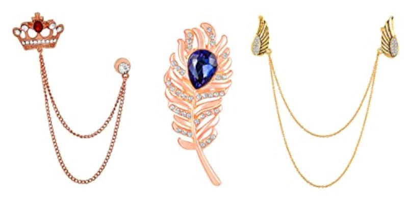 Add a touch of elegance to your outfit with this stylish chain and feather lapel pin adorned with a crystal.