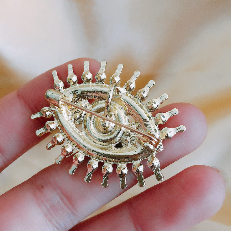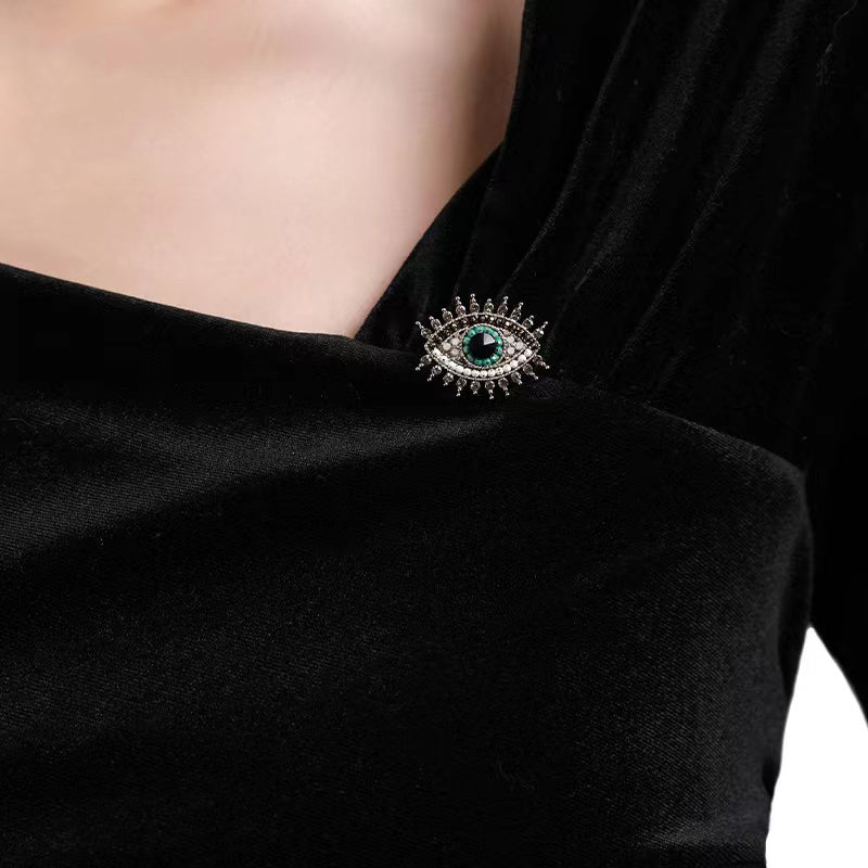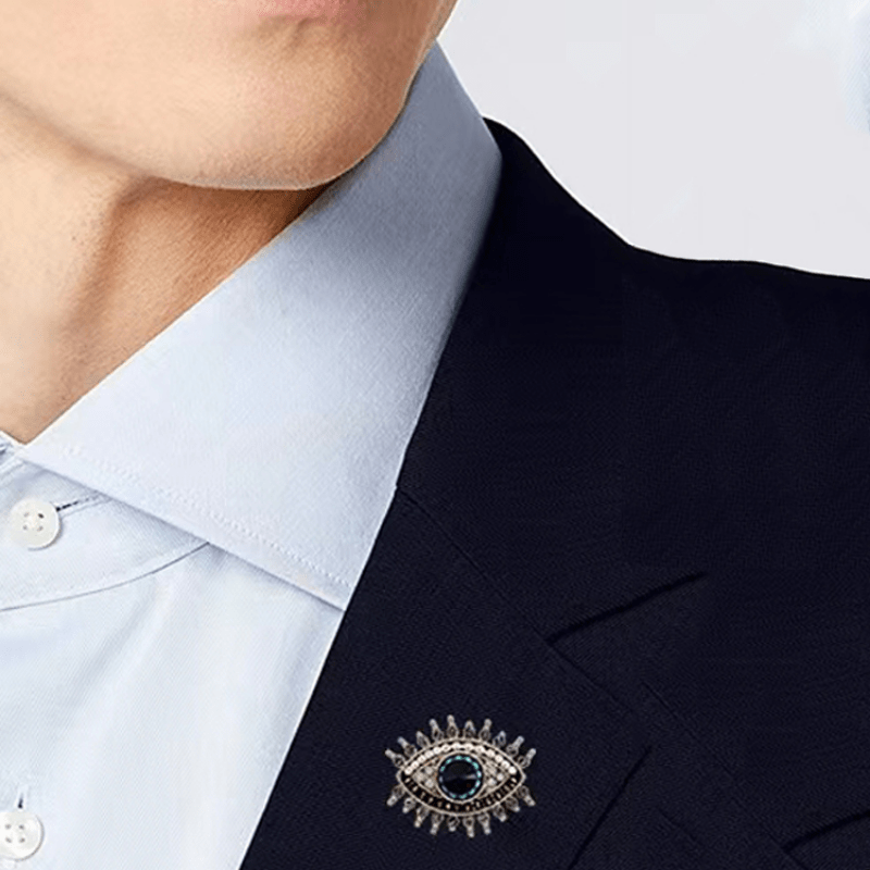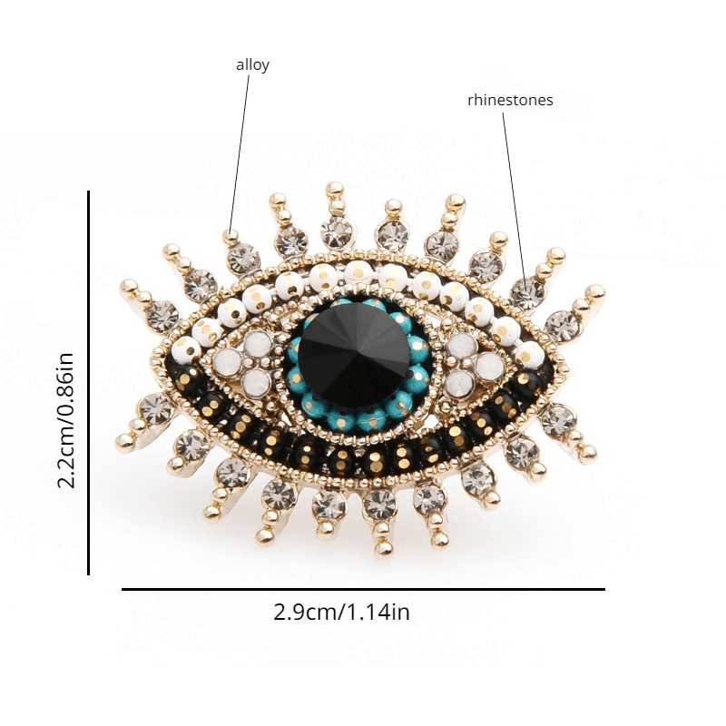Add a touch of luck and fortune to your outfit with this stunning Rhinestone Evil Eye Brooch Pin. Perfect for adorning shirts, suits, or jackets.