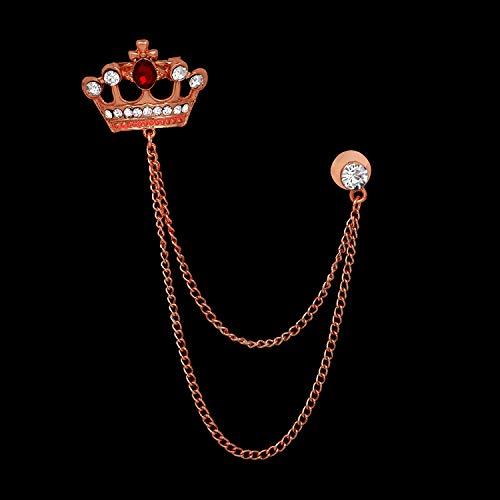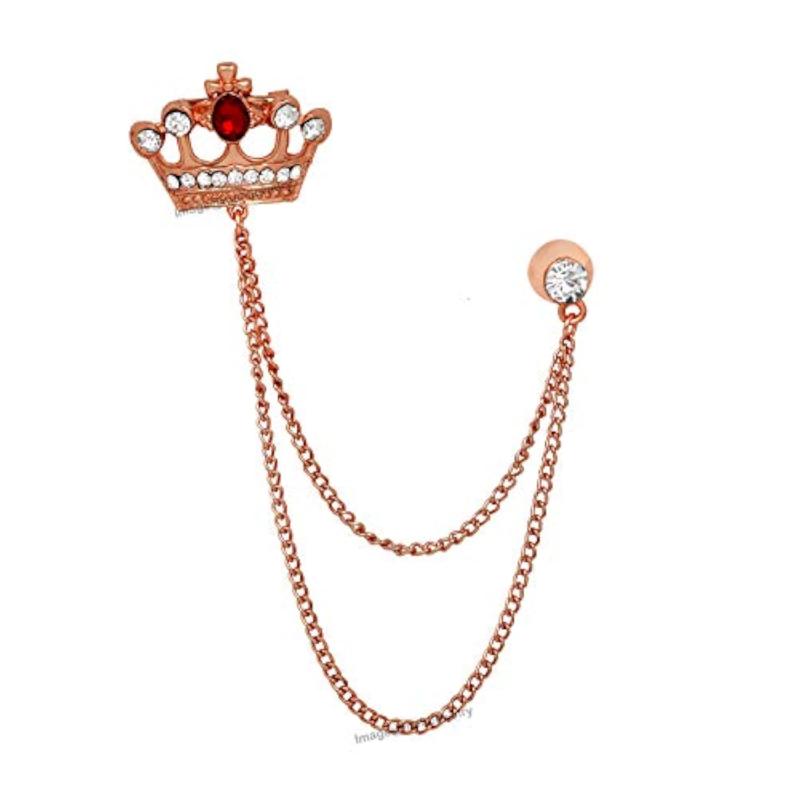 Elegant rose plated brooch with a sparkling crystal crown design and attached chain.