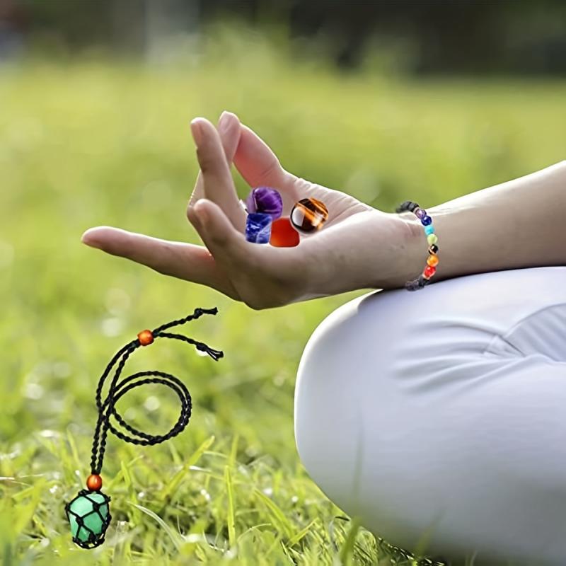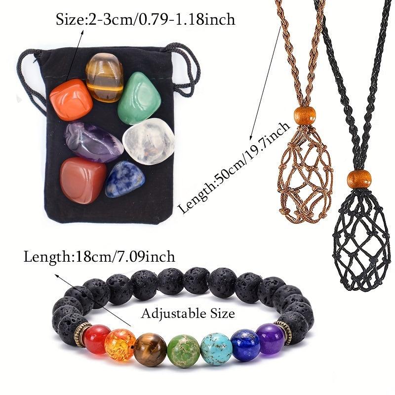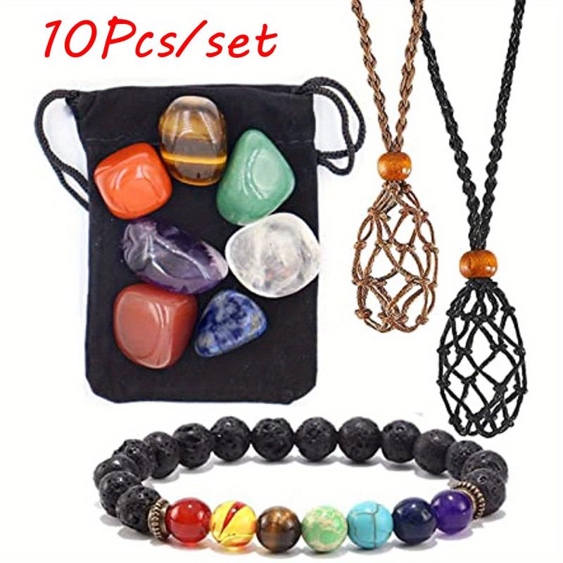 This crystal set includes 10 healing stones for each of the 7 chakras, along with a gemstone bangle, necklace rope, and instructions. Perfect spiritual gift for stress relief and energy healing.